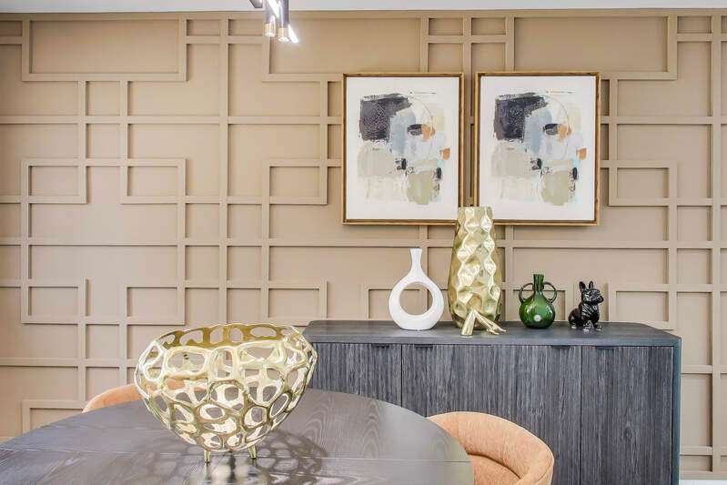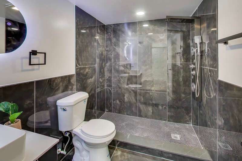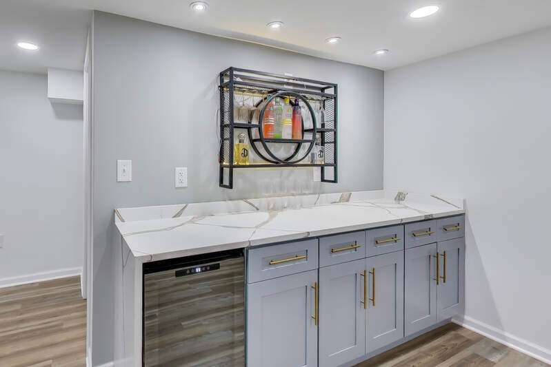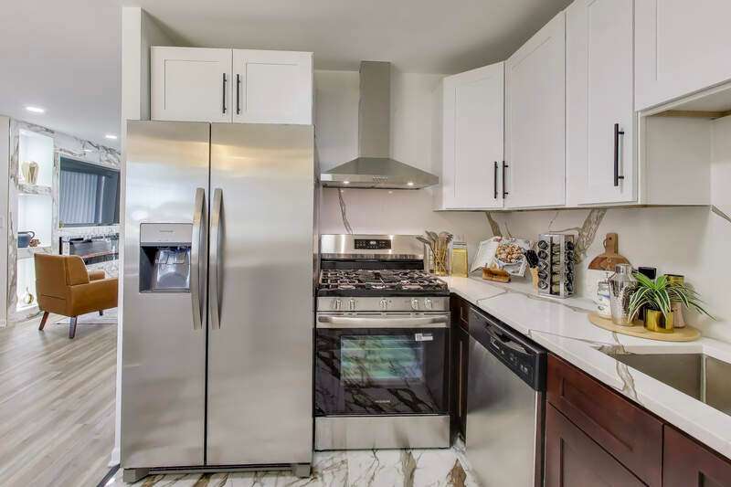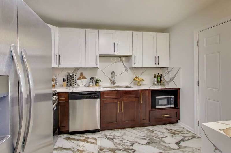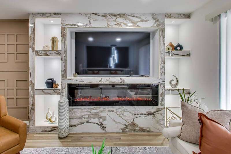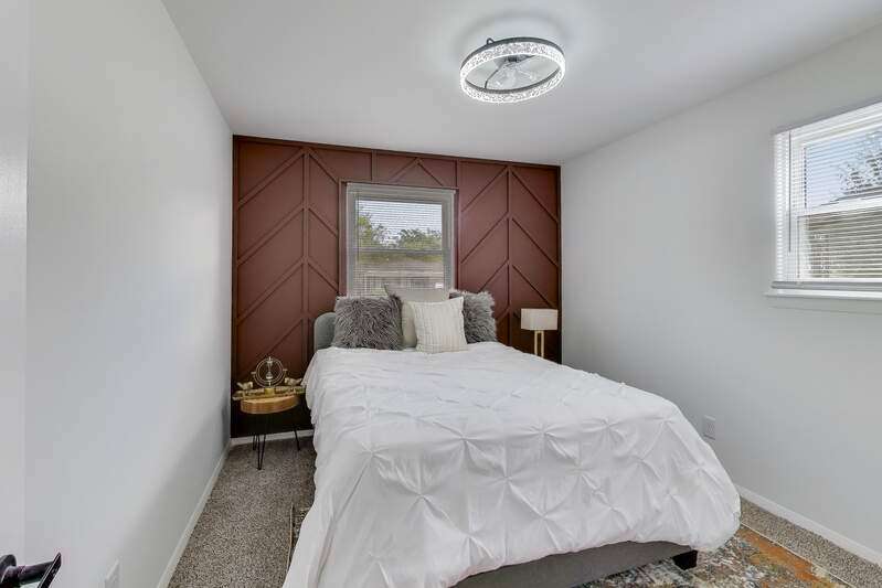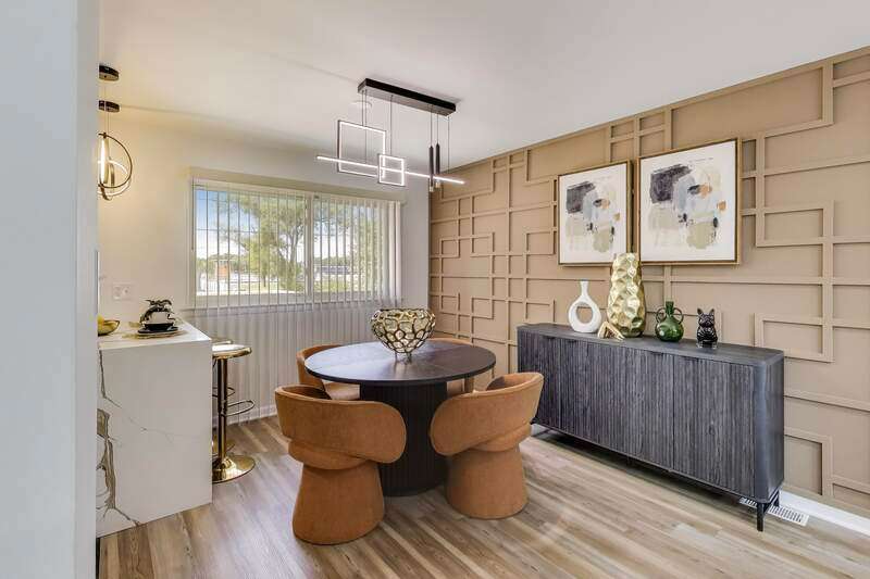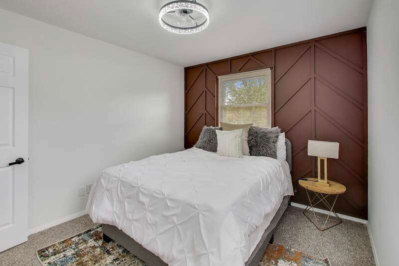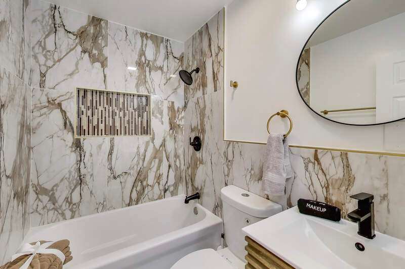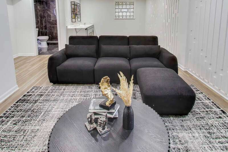 Prepare to be captivated by this elegantly reimagined 3-bedroom, 3-bath luxury home, where sophistication meets modern comfort. Step through the grand foyer featuring soaring ceilings, rich wood panel detailing, and a radiant LED chandelier that sets the tone for the artistry within. The open-concept main level flows effortlessly from the expansive living room--anchored by a custom entertainment wall with designer tile, built-in lighting, and an electric fireplace--to the formal dining area and chef's kitchen. The kitchen stuns with dual-tone cabinetry, Calcutta gold quartz countertops, a chef's island, pendant lighting, and a premium stainless steel appliance suite. Each spa-inspired bath is crafted with floor-to-ceiling porcelain tile, custom vanities, and LED mirrors with touch defogging technology. The primary suite is a serene retreat with a lavish en suite bath, while each bedroom offers plush carpeting, 3D accent walls, LED ceiling fans, and natural light. The lower level features a designer bar with quartz counters, illuminated wine rack, black porcelain media wall, and a luxury walk-in shower with a 52-setting shower tower--a true entertainer's dream. Outside, enjoy a restored deck and private backyard oasis, plus a 2.5-car attached garage with laundry area.