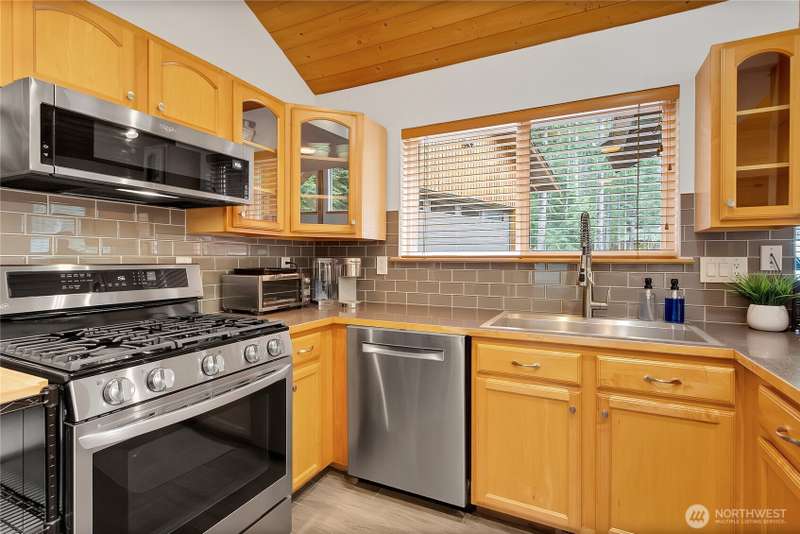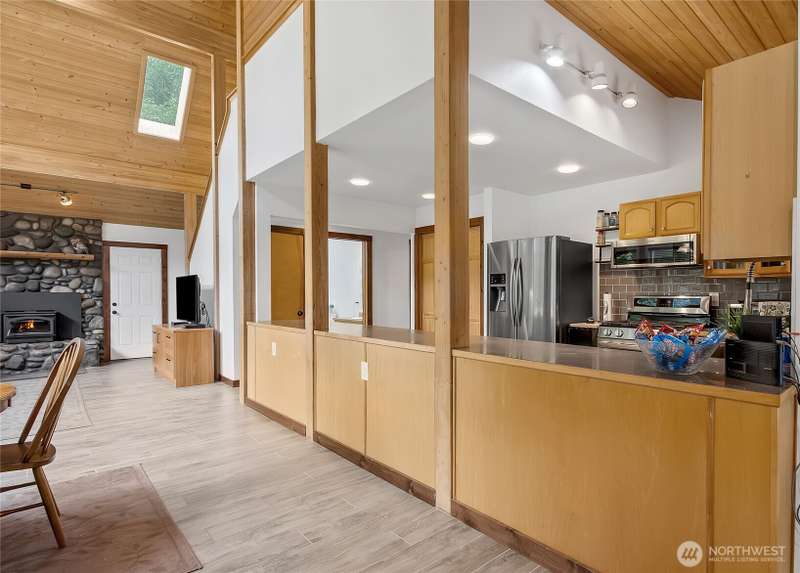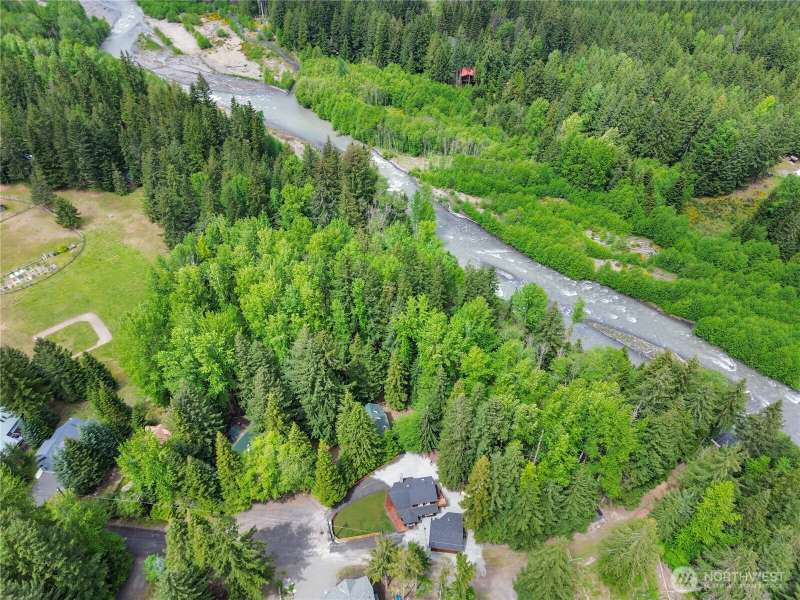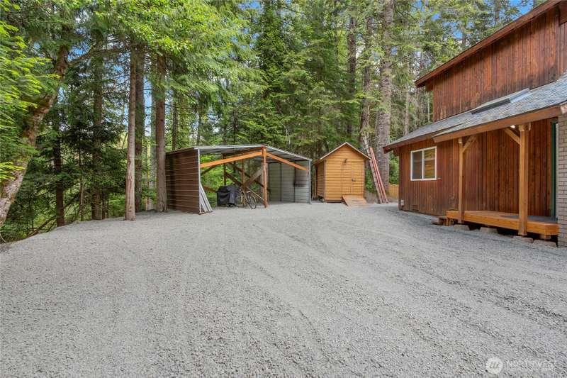 Enjoy the sound of the White River from this 3 bdrm, 2 bath mountain retreat in desirable Crystal River Ranch. A rare blend of rustic charm & modern updates, featuring an open-concept great room w/ river rock fireplace, vaulted pine ceilings & floor to ceiling windows. Detached 2-car garage includes shop area, 220 amp service & loft storage. Additional features: woodshed, storage shed & generator wiring. Property backs to community greenbelt. Just 20 min to Crystal Mtn Resort & Mt. Rainier National Park, and 1 min walk to neighborhood community center and play area. Trail to the river, just out the door. Never a rental—this full-time residence has been impeccably maintained. Ideal for year-round recreation: skiing, hiking, mt biking & more.