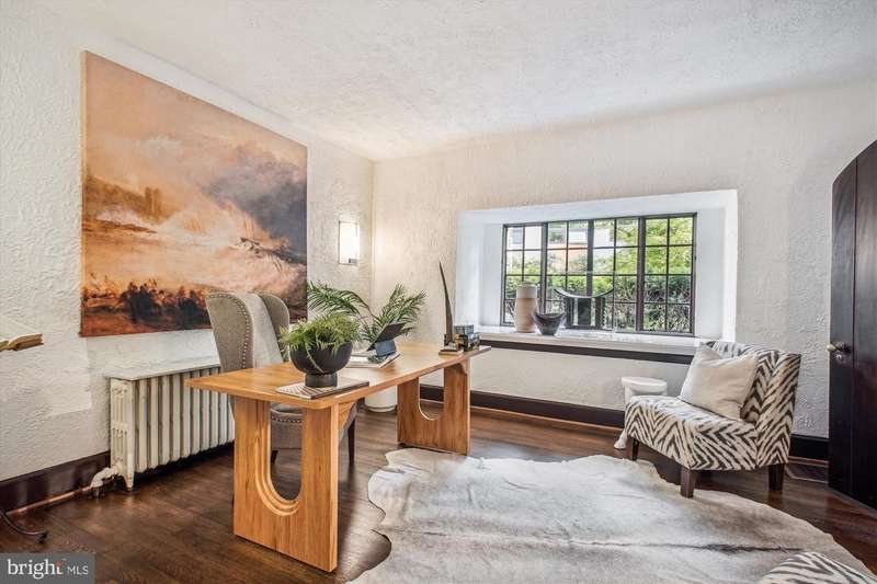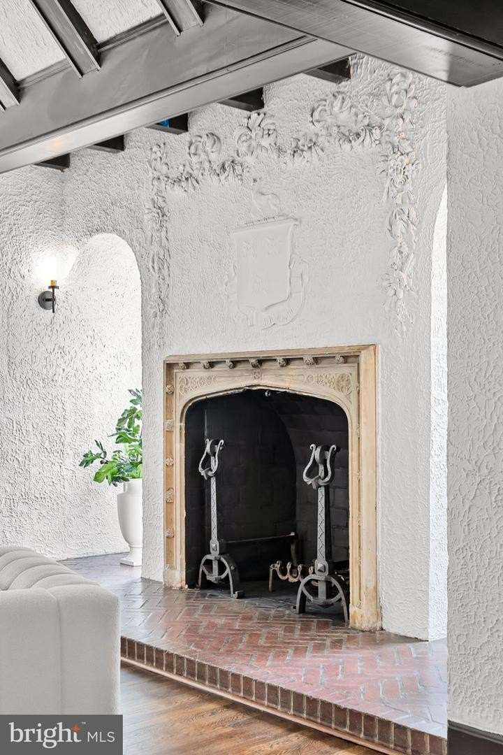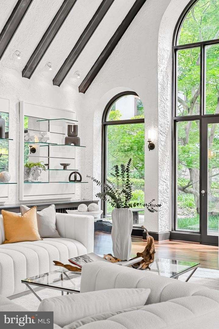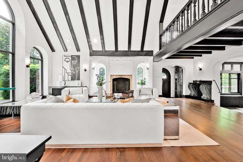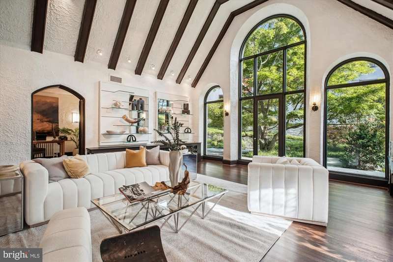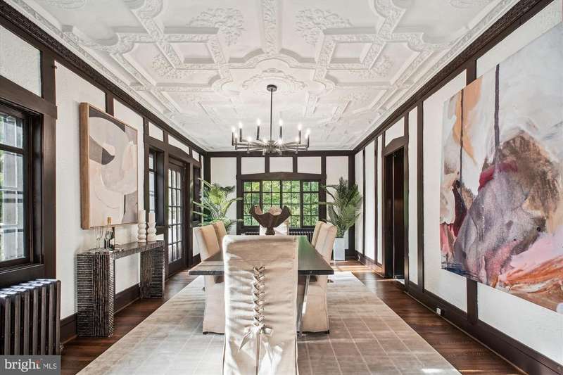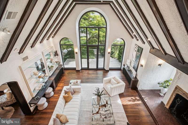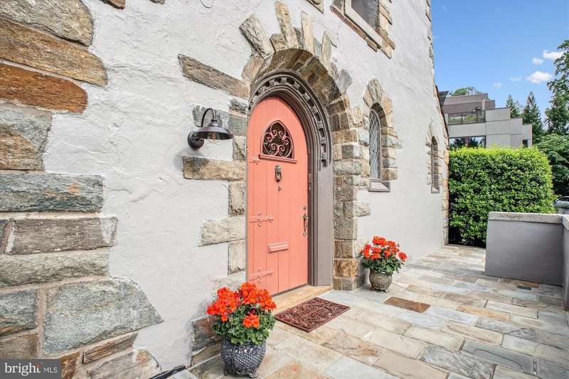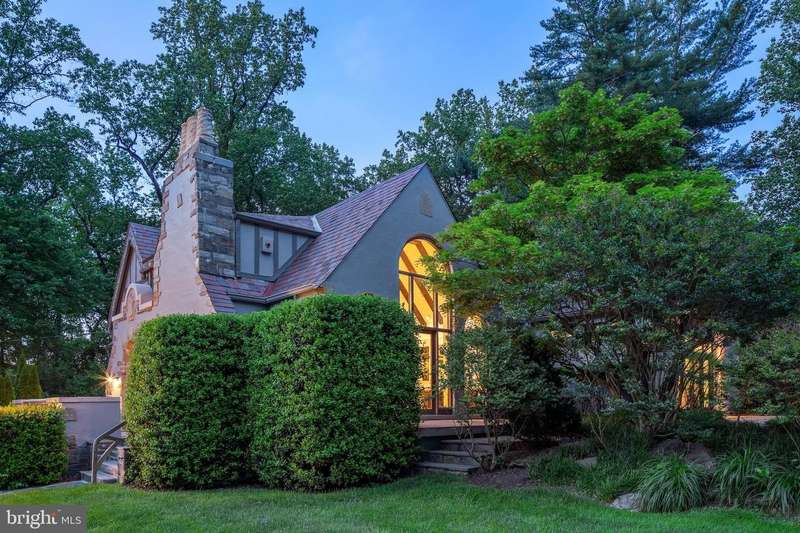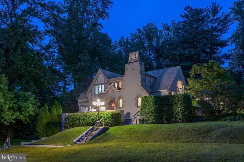 With the bold inscription ""Cedere Numquam"" (Never Give Up) carved in stone above the front door, this striking Tudor-style home invites you into a world of timeless elegance and thoughtful design. Originally built in 1923 and expanded with care, it seamlessly blends classic architecture with modern additions and design. Perched on a quiet cul-de-sac above Sligo Creek Park, the stone-and-stucco exterior is enhanced by welcoming stone walkways and sculptural metal railings by Barton Rubenstein. A custom wood door opens to reveal a dramatic great room with a 20-foot beamed ceiling, a stone fireplace, a floating glass display wall by Renwick curator Michael Monroe, and soaring atrium windows framing the private garden terrace. The banquet-sized dining room features a coffered ceiling with a custom crest of The Order of the Garter, a nod to tradition that echoes the home's enduring character. The adjacent kitchen offers granite countertops, ample cabinetry, and a breakfast area that flows into the cozy family room with an 1800s Great Western cast iron parlor stove. The main-level owner's suite is a true retreat, with two oversized walk-in closets, two beautifully appointed full baths, and a grand bed chamber with French doors leading to the terrace. A second office or nursery adds flexibility with an additional walk-in closet. All baths on the main level feature high-end Italian fixtures, and the owner's suite baths have heated floors & enormous walk-in showers. On the upper level, a reading balcony/lounge overlooks the great room, alongside three additional bedrooms-including a suite with sitting room/den-and two full baths. Two spaces have built-in window seats, and the 3rd bedroom features built-in furniture. The lower level provides space for hobbies, storage, and access to the deep 2-car garage and elevator. Recent updates include fresh interior and exterior paint, refinished hardwood floors, new carpet, and updated lighting. A whole-house generator is also installed. See Disclosures for additional information on systems and receipts. The terraces and gardens, accessed through the great room, owner's suite, and family room, provide views and shade from the towering Japanese maple tree with its ever-changing colors. Privacy abounds, with access to Sligo Creek Park from a corner of the yard. A sprawling front lawn greets guests with an impressive approach and offers plenty of play space both front and back. Walkable to Zinnia and convenient to Metro, buses, and I-495, this timeless home offers rare character, comfort, and presence-ready for its next chapter.