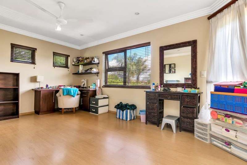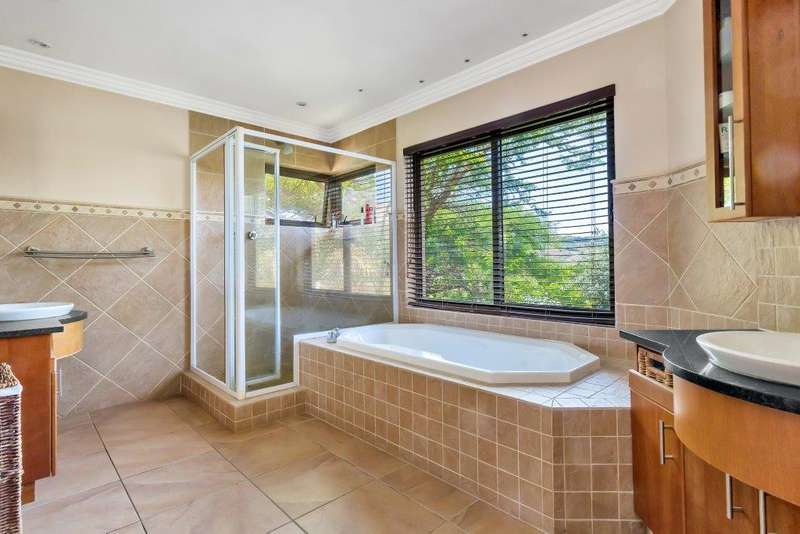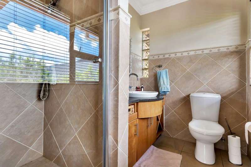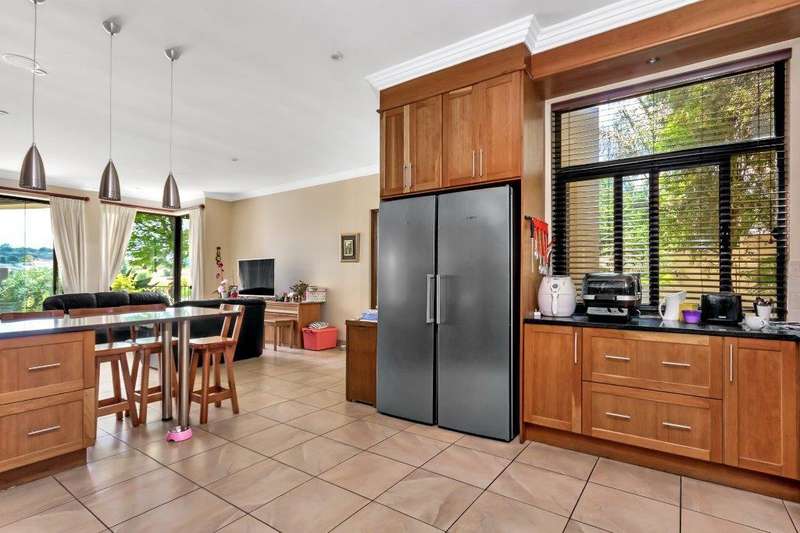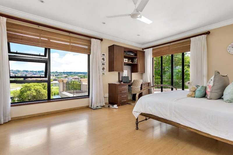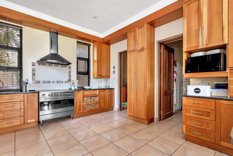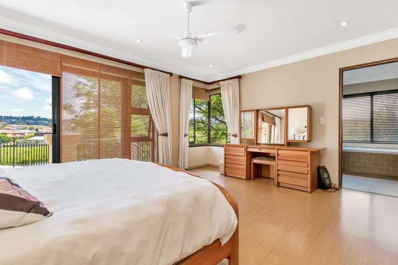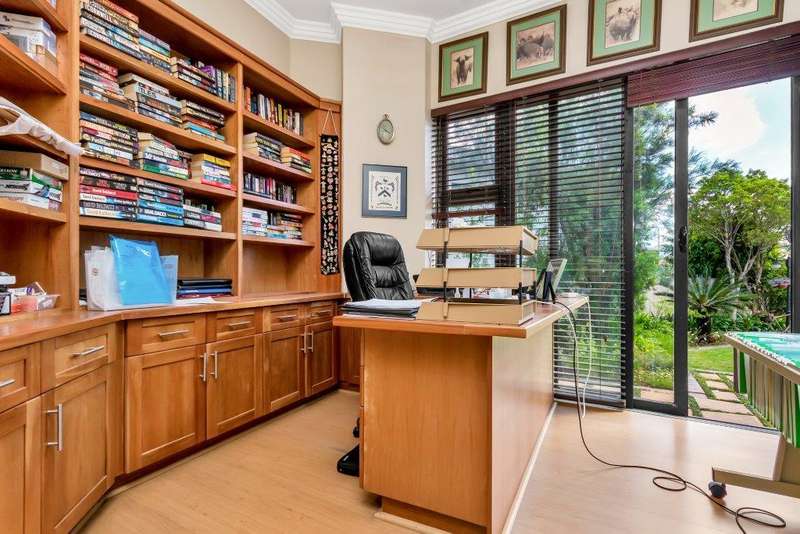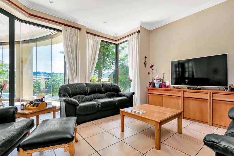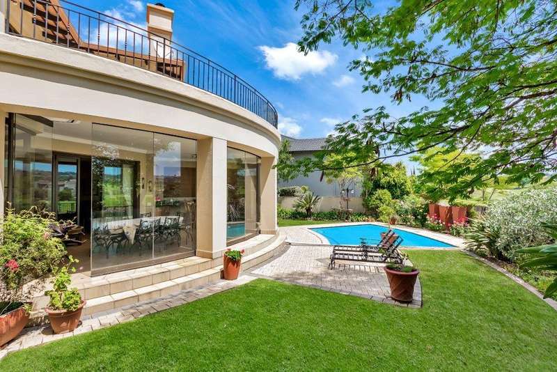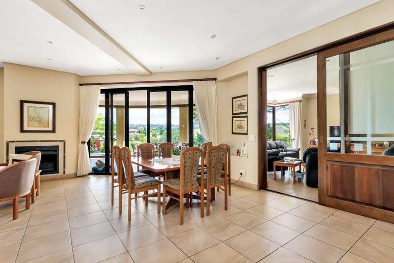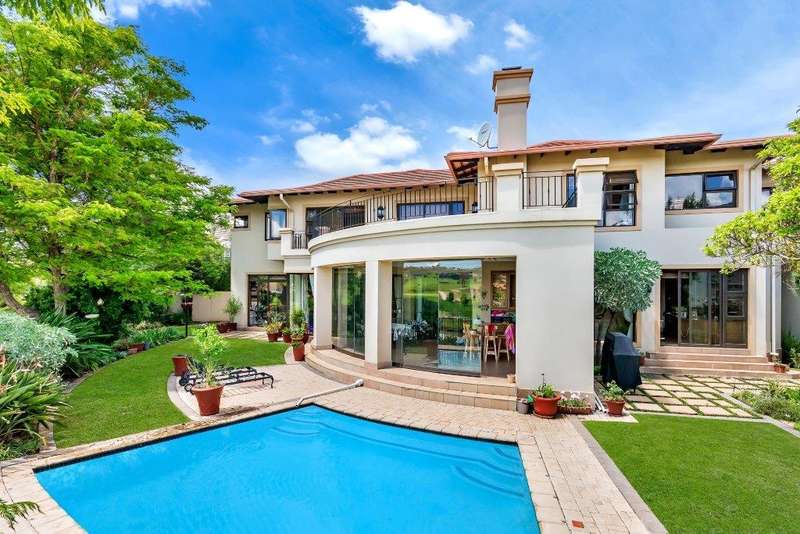 This North facing home is perfectly positioned opposite a dam, offering unobstructed views of the golf course and club house. Open plan living downstairs with a formal lounge, TV lounge, kitchen and dining area onto the enclosed patio. Plenty of space to entertain. Guest loo downstairs. Al -fresco living at its best! Study and guest bedroom en-suite downstairs. Upstairs, the main bedroom has a beautiful view window into the estate, en-suite and spacious. There are five upstairs bedrooms, three have en-suite bathrooms. Two bedrooms are serviced by one bathroom with a separate loo. Six bedrooms and 5 bathrooms in total. Beautiful indigenous garden leads onto the greenbelt. Spacious well-equipped staff accommodation with kitchenette and bathroom with shower. Separate external gardeners?ÇÖ bathroom and storeroom. Inverter for back up power and is lightning protected. There are two double garages and plenty of off-road parking. A well-equipped home with all that is needed for a large modern family.