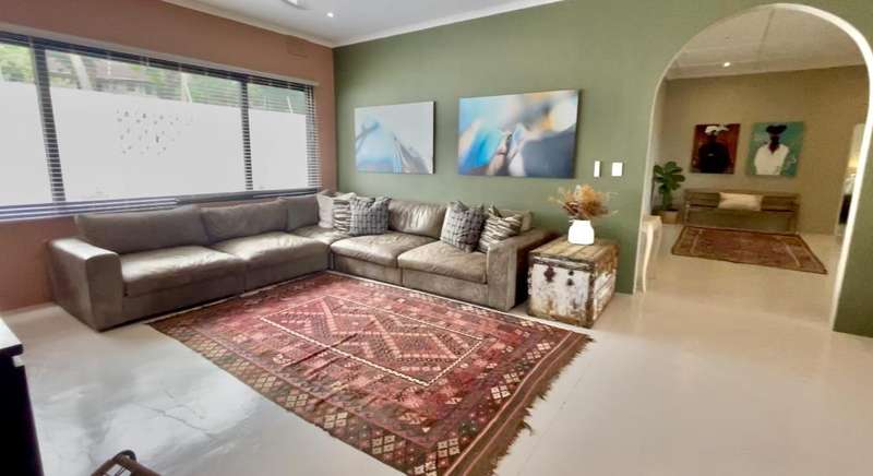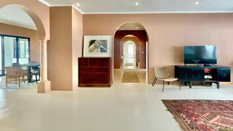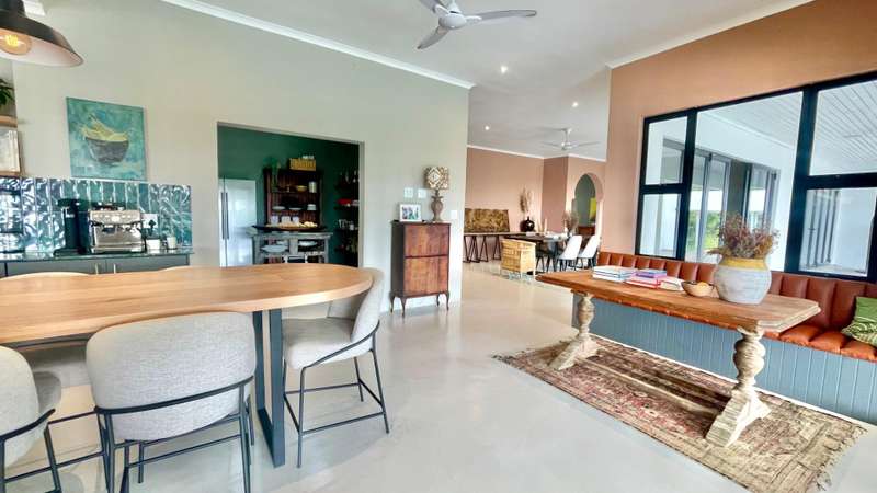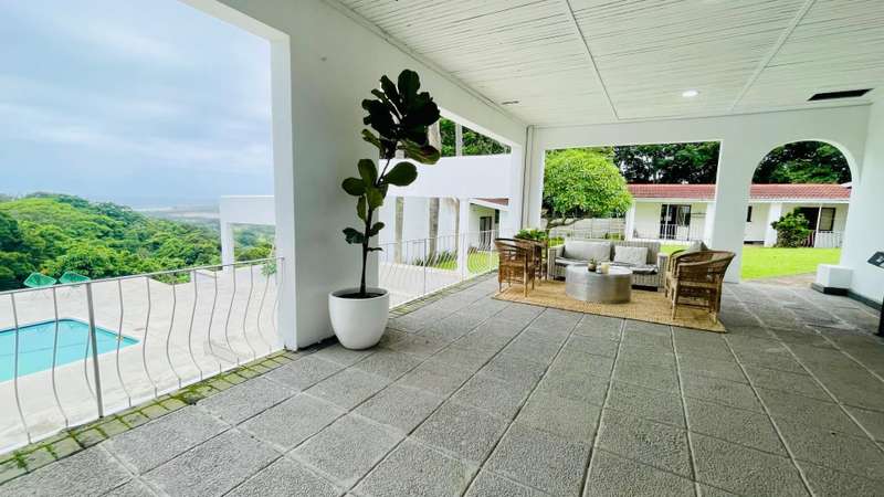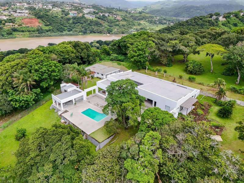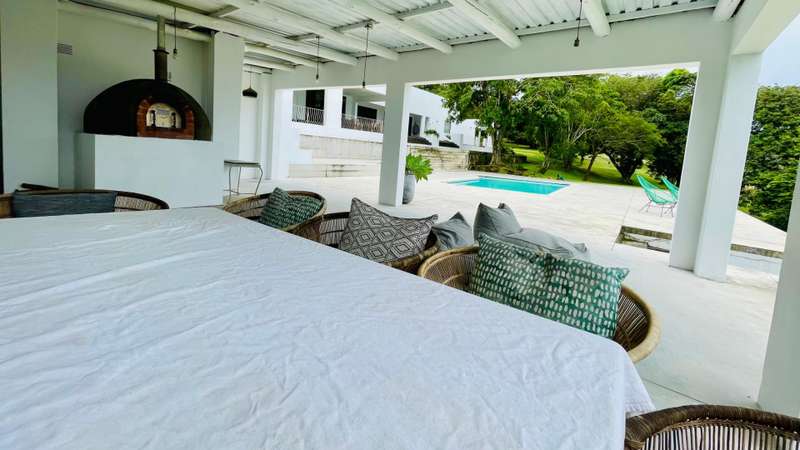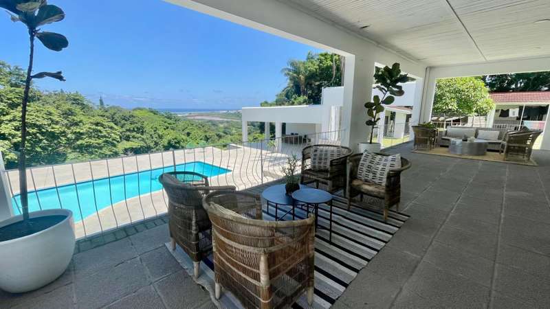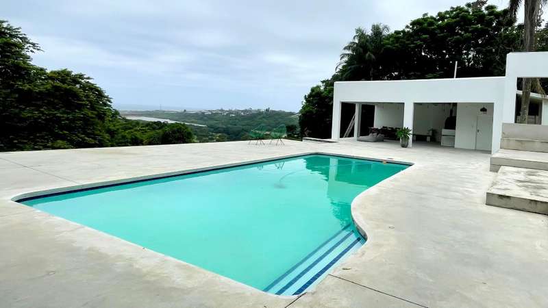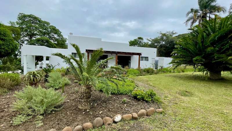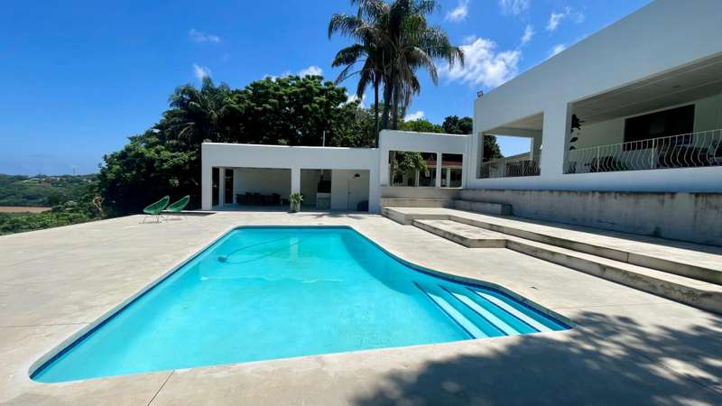 Luxurious and Modern Spanish-Moroccan Inspired Coastal Retreat This 1000m?? architect-designed villa in Umtentweni combines a striking modern Spanish exterior in bold, stark white with warm Moroccan-inspired interior. Set on nearly 8000m?? of landscaped gardens, the house offers breathtaking views of the Port Shepstone Golf Club, Umzimkulu River, and Indian Ocean. The main residence features 5 ensuite bedrooms, spacious entertainment areas, a 10-seater dining room, and a gourmet kitchen with a 5m oak and marble island as well as a designer pantry. The high ceilings, arches, the large open spaces and screeded floors throughout, creating spaces of calm and balance. Large stacking doors create a seamless flow to the outdoor entertainment area with a covered patio almost the length of the entire house, extending to the sparkling pool below that boasts an adjacent covered pavilion with a pizza oven, dining area and lounge plus a changing room and bathroom. Outbuildings include a 1-bedroom studio, a 2-bedroom flatlet, domestic quarters, and 3 garages. With the two 5000L JoJo tanks, solar power, and electric fencing, this property is secure, luxurious and self-sufficient. Ideally suited as an expansive family villa or a boutique hotel, its combination of modern architecture, warm interiors and idyllic location in the coastal village of Umtentweni, offer unmatched potential and a haven for those who value space and tranquility. Make sure to watch our video tour.
