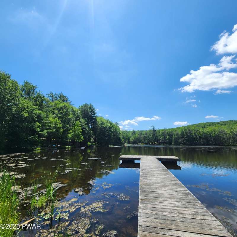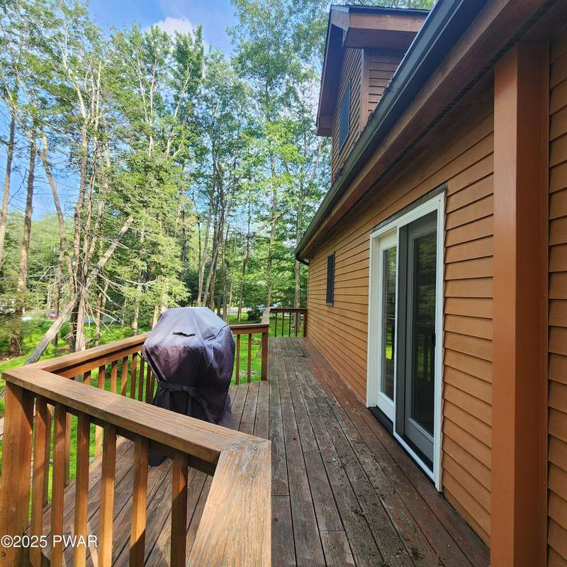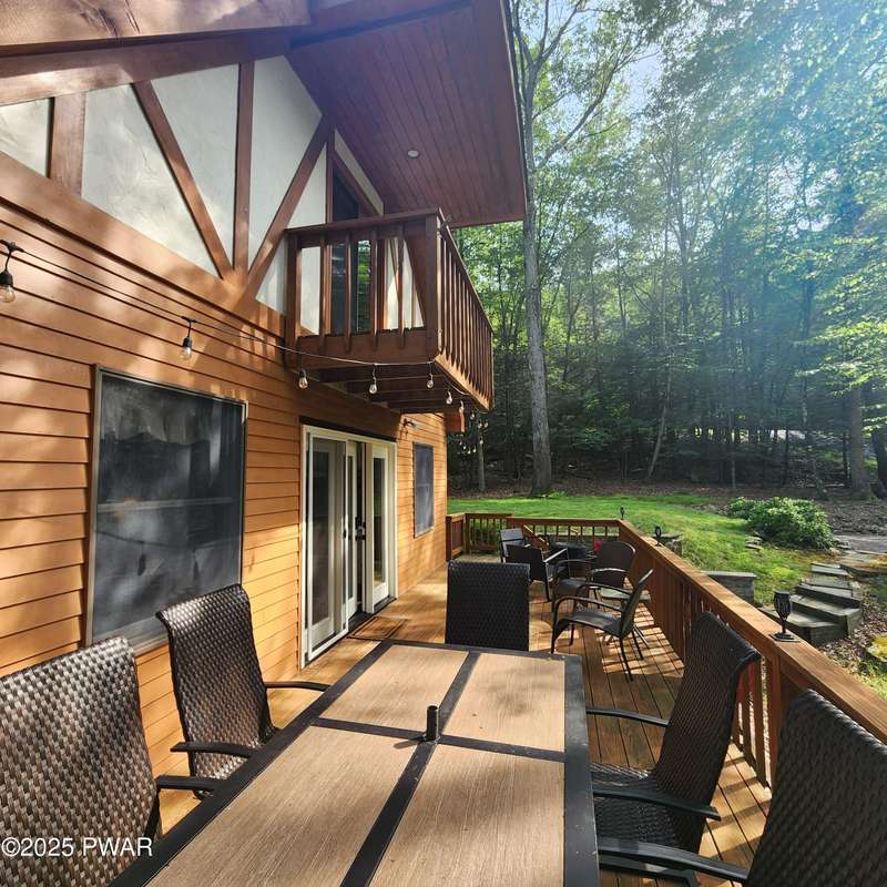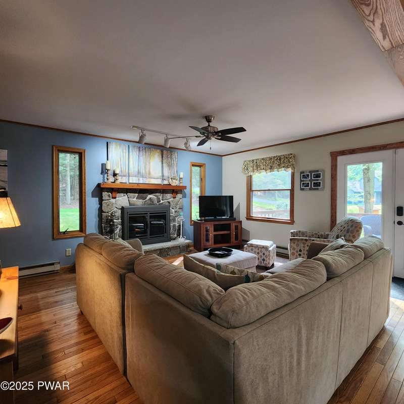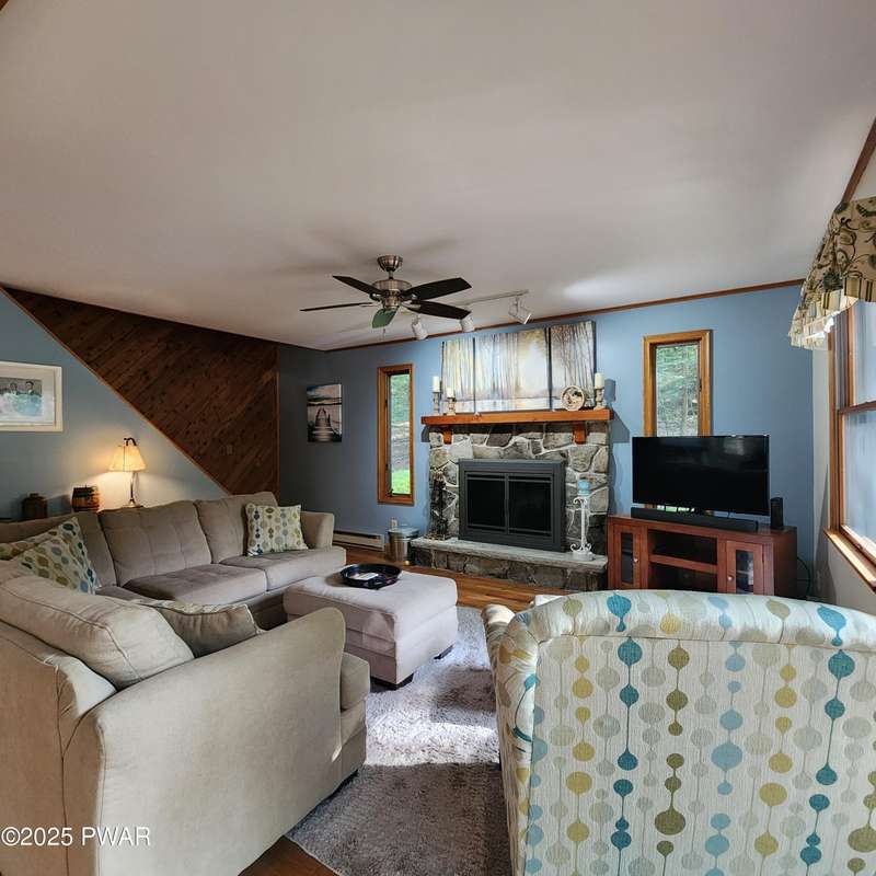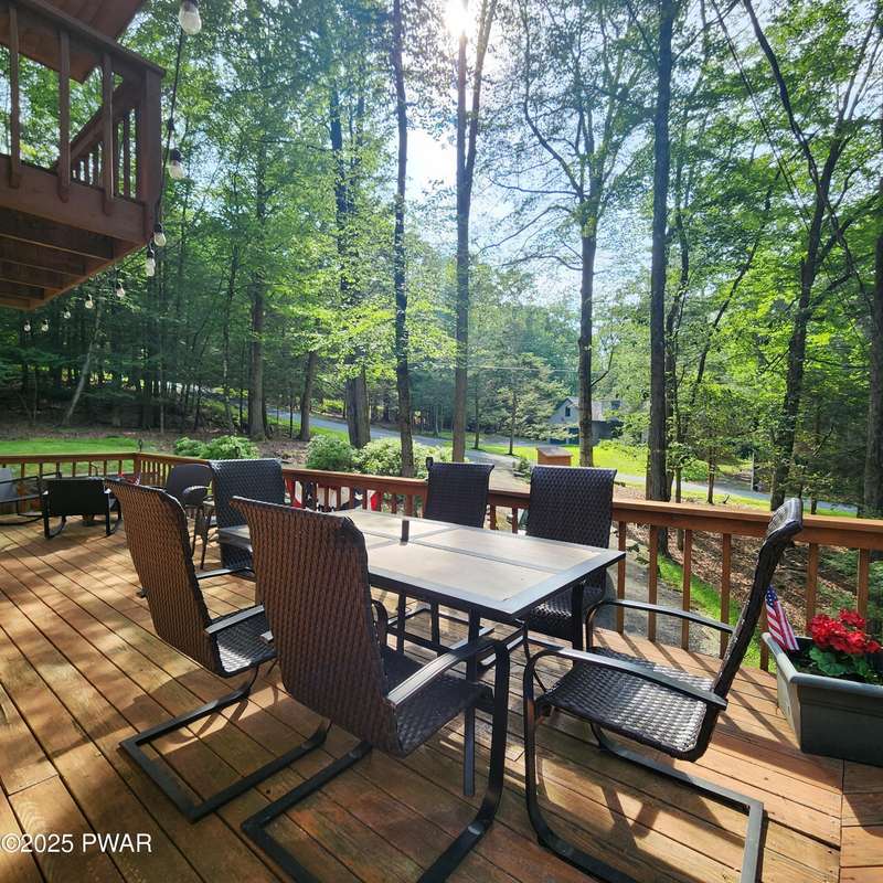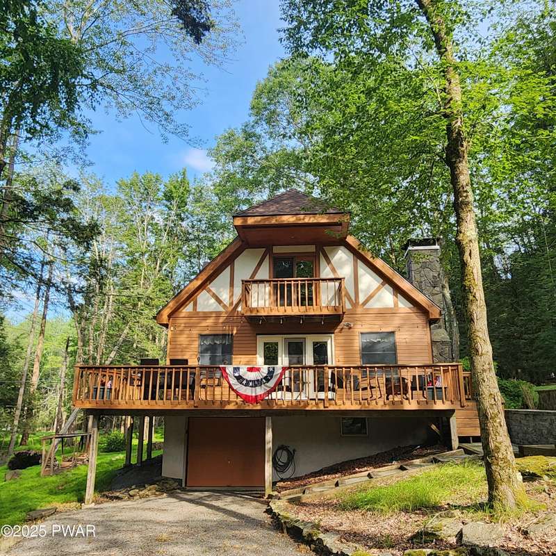 Turn-key gem in the desirable Tanglwood Lakes community with access to stunning Lake Wallenpaupack! This beautifully maintained home features 3 spacious bedrooms, 2 fully updated bathrooms, and a completely remodeled kitchen with modern finishes. Enjoy the warmth of natural hardwood floors throughout and cozy up by the wood-burning fireplace on chilly nights. The expansive wrap-around deck is perfect for entertaining or relaxing in the peaceful surroundings. Additional features include a 1-car garage and a full basement offering ample storage or potential for additional living space. Don't miss this move-in-ready home in one of the area's most sought-after communities!