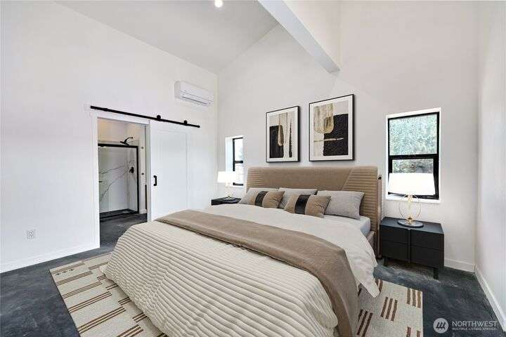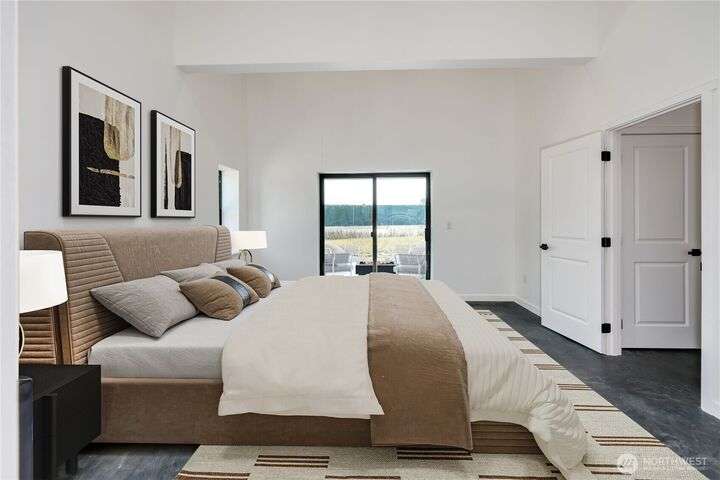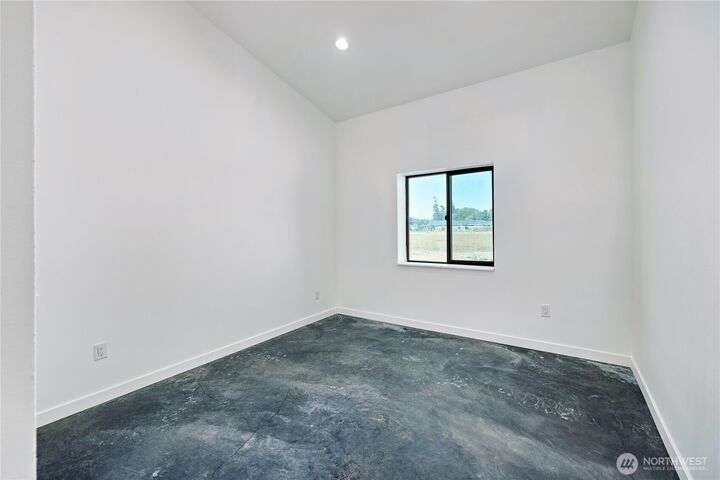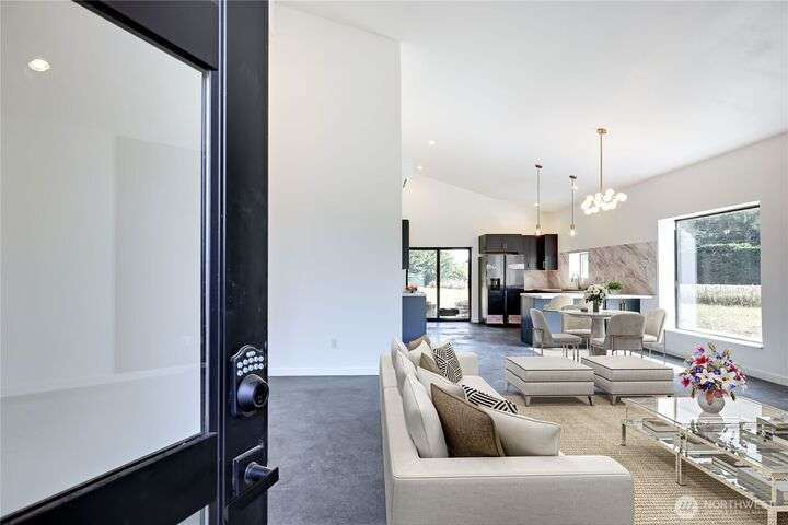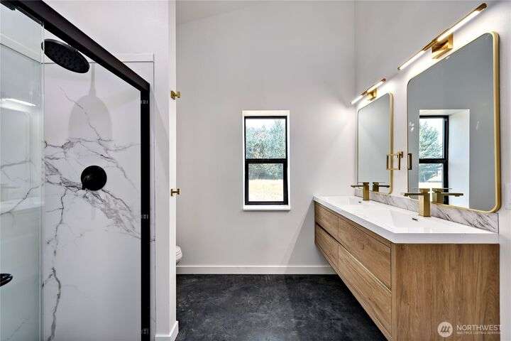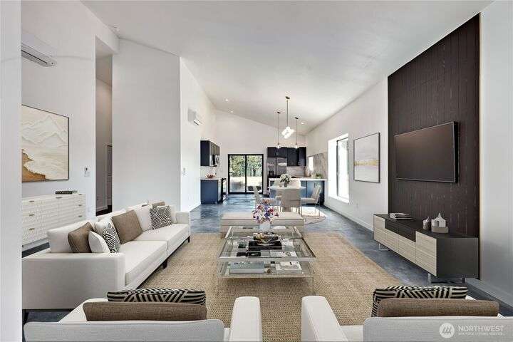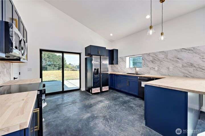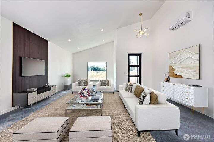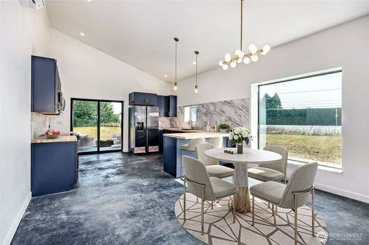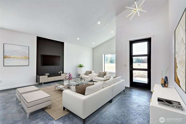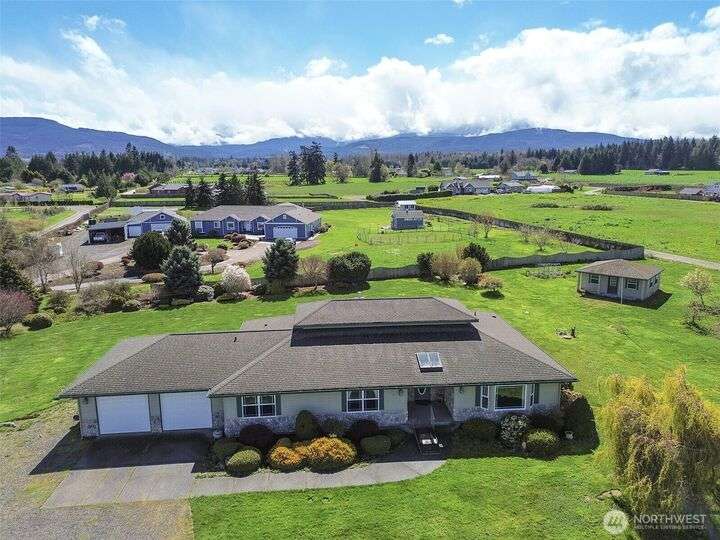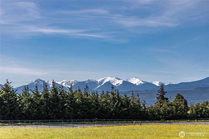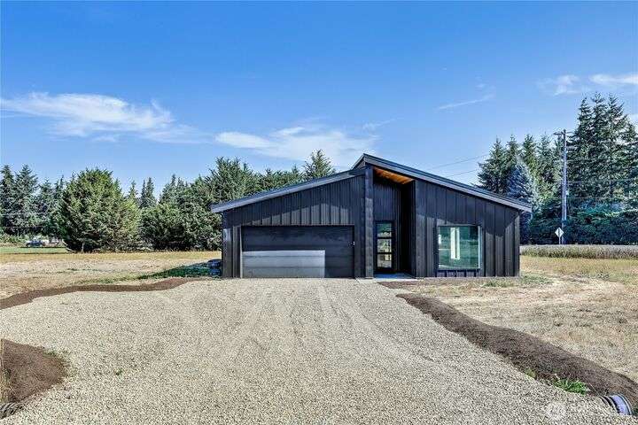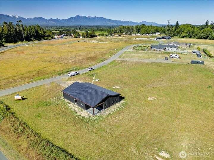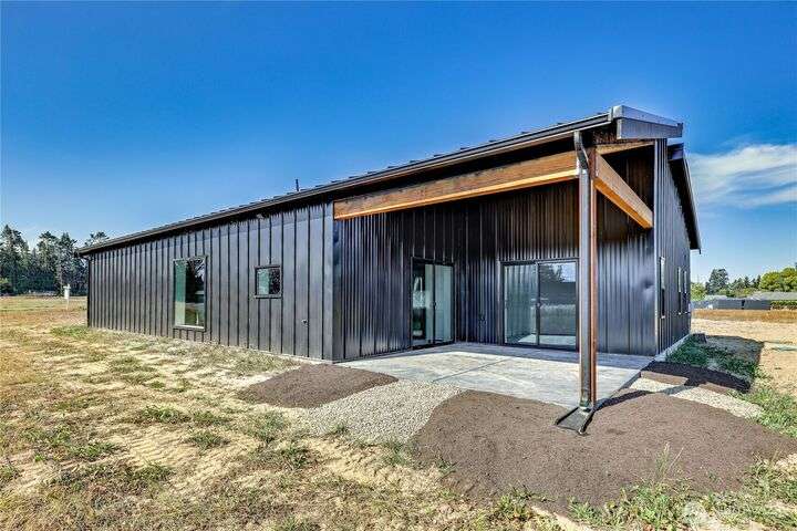 One Story Mountain View home features a brilliant design and loaded with spectacular modern features on level acre property. Insulated concrete form construction, matte black metal roofing and siding, 1800+ finished square feet, covered & heated rear patio. Home features polished concrete floors, stainless Samsung appliances, soft close cabinets, butcher block counters, ductless mini split heating and cooling, vaulted ceilings, hot tub wired, EV charge line, generator ready. Olympic Mountain views, minutes to 2 golf courses and Discovery Trail.