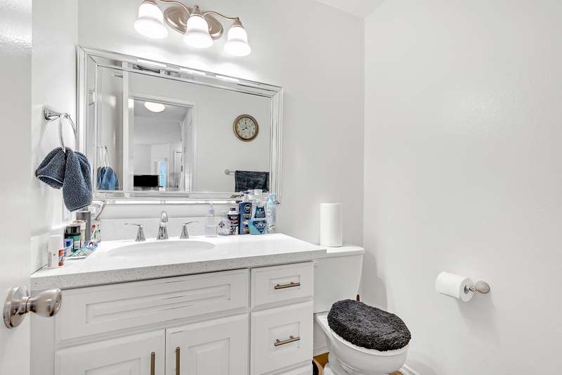 Step inside to discover an open-concept floor plan featuring a spacious living room with elegant wood laminate flooring. The adjoining dining area flows seamlessly into a modern, upgraded kitchen, complete with quartz countertops and ample white cabinetry—perfect for both everyday living and entertaining. A convenient guest powder room is located on the main level.