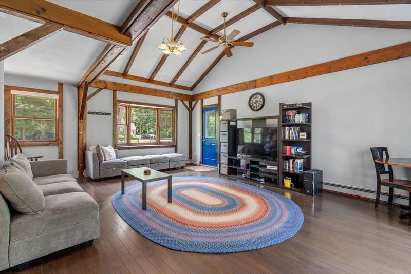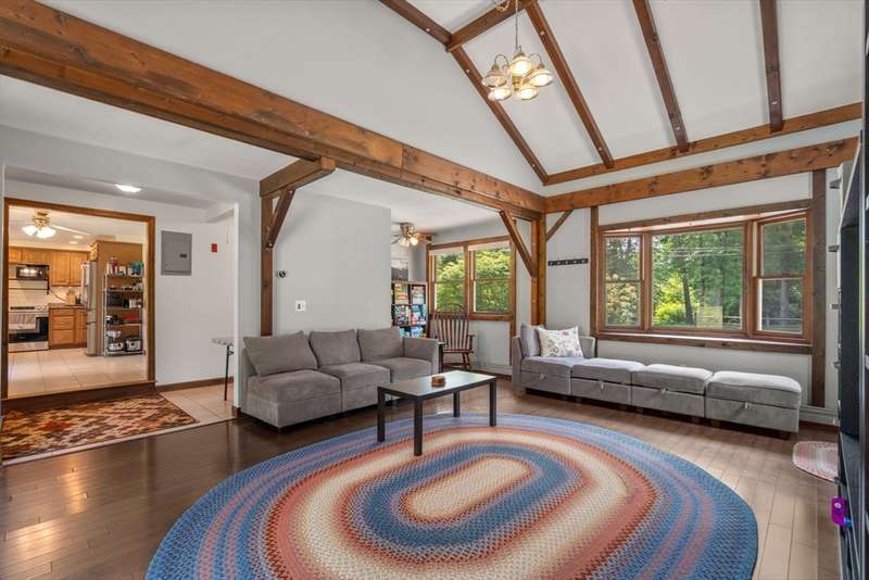 Buyers loss your gain!!! -Don't let DOM fool you!!!! Featuring a brand-new roof (2024), furnace (2019), new hardwood floors, and updated windows, this expanded Campanelli home offers outstanding space and flexibility for modern living. With four bedrooms, two full baths, and two versatile bonus rooms ideal for a home office, playroom, or guest space, there s room for every need. The open-concept living and dining area showcases gleaming hardwood floors and a cozy wood stove, creating a warm, inviting atmosphere. A show-stopping family room boasts soaring beamed cathedral ceilings and opens to a spacious, partially fenced yard with a screened-in porch and storage shed. Additional highlights include ample storage throughout, including a pull-down attic.