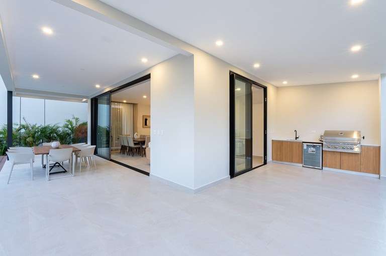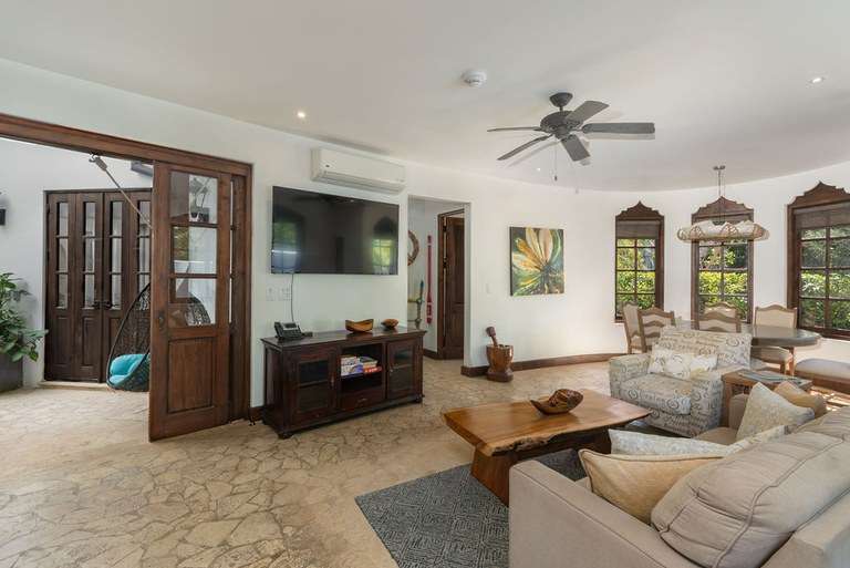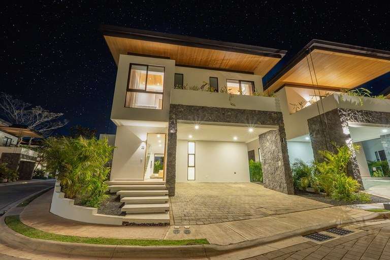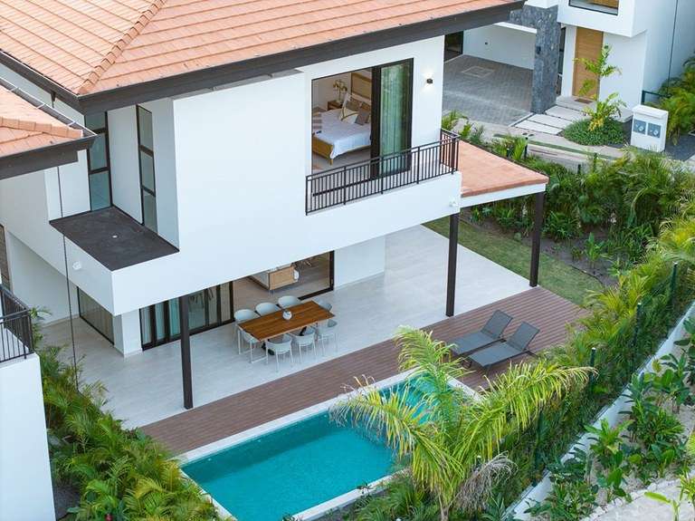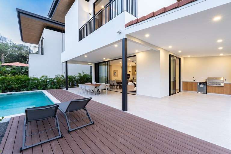 Model A+ at Bosques de Pinilla is a luxury 4-bedroom, 4.5-bathroom villa located within the prestigious Hacienda Pinilla community. This two-level villa is designed with an open indoor/outdoor living concept, featuring large glass sliding doors connecting the living room, kitchen, and dining areas to a spacious L-shaped terrace.