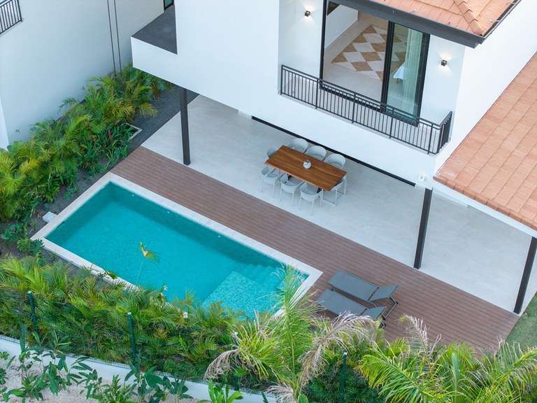 Model A+ offers 323 m2 (3,476.74 sq. ft.) of thoughtfully designed living space, ideal for luxury tropical living. The villa boasts a wrap-around patio, enhancing the connection between indoor and outdoor areas. The first floor features an open-concept layout with a modern kitchen, dining, and living room, plus a guest bathroom, laundry room, and private storage cellar.