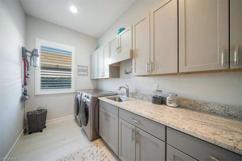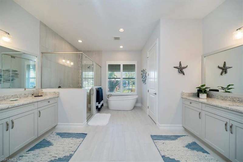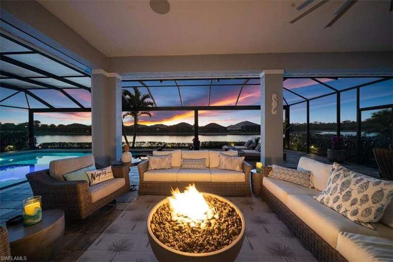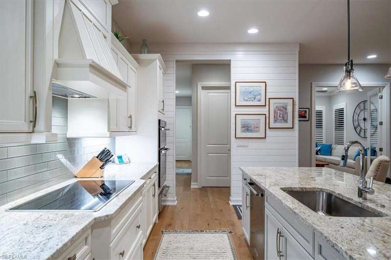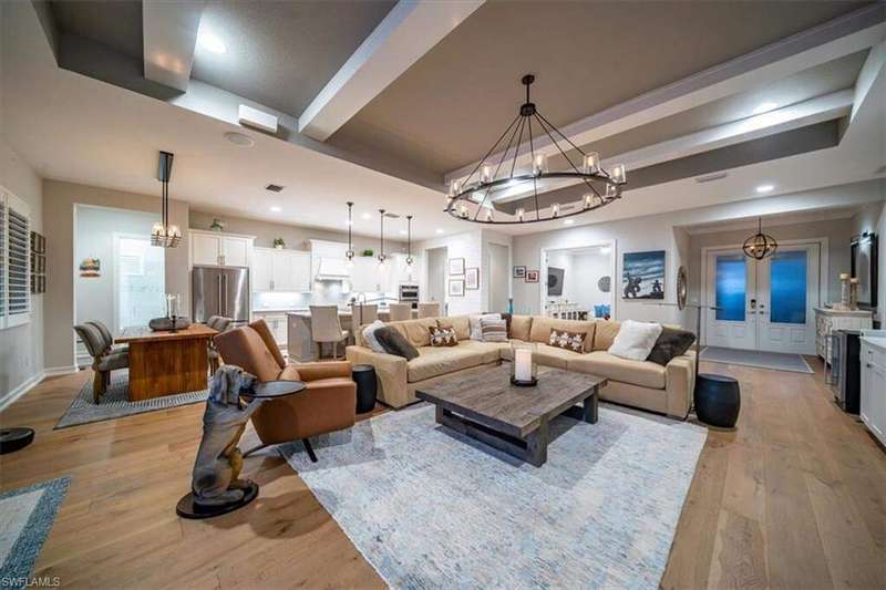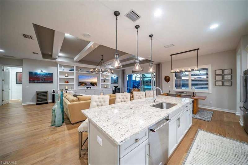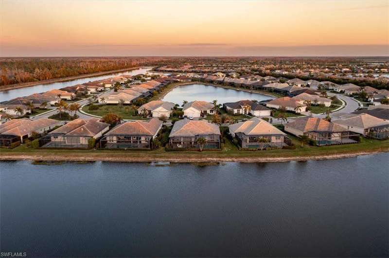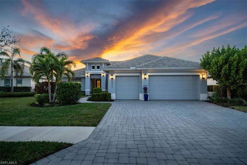 Experience the ultimate in luxury and resort-style living in this exceptional 2019 Stock-built Marathon 3 floor plan home. Perfectly situated on an oversized western exposure lot with breathtaking sunset views over the lake. Spanning 4,050 total sq. ft. of indoor and outdoor living space. Gorgeous wide plank white oak engineered hard wood flooring throughout much of the home. This meticulously upgraded home offers 3 bedrooms plus an office/den, 3.5 baths, soaring volume ceilings, and an open-concept great room with media wall with open and closed storage. The gourmet kitchen is a chef's dream, featuring an expansive island, KitchenAid appliances, a walk-in pantry, tiled backsplash and so much more. The primary suite is a private retreat with custom his-and-hers closets and a spa-like bath with a freestanding tub and walk-in shower with seamless shower doors. Smart home technology allows you to control so much with apps and Alexa technology. Step outside to an oversized saltwater pool, integrated spa, summer kitchen, panoramic screened lanai, and custom pool lighting, plus electric storm smart fabric Kevlar screens to close off the covered lanai space which are all designed for relaxation and entertaining. Additional upgrades include a whole-home generator, impact windows, an upgraded electrical panel, an instant hot water heater, enhanced landscaping, and a 3-car extended garage with epoxy flooring, and electric keypad entry. This home is also able to add a dock at the rear of the property if you so desire. Nestled within the exclusive, gated community of Naples Reserve, this home offers low HOA fees and access to world-class amenities, including a resort-style pool, tiki bar with food and beverage service, state-of-the-art fitness center, bocce, pickleball, tennis, sand volleyball courts, a lakefront beach, marina, kayak and electric boat rentals, scenic walking and biking trails, two dog parks, and a vibrant social calendar managed by an on-site Lifestyle Director. Whether seeking tranquility or an active social scene, Naples Reserve delivers the perfect balance. This move-in-ready masterpiece offers an unparalleled lifestyle.
