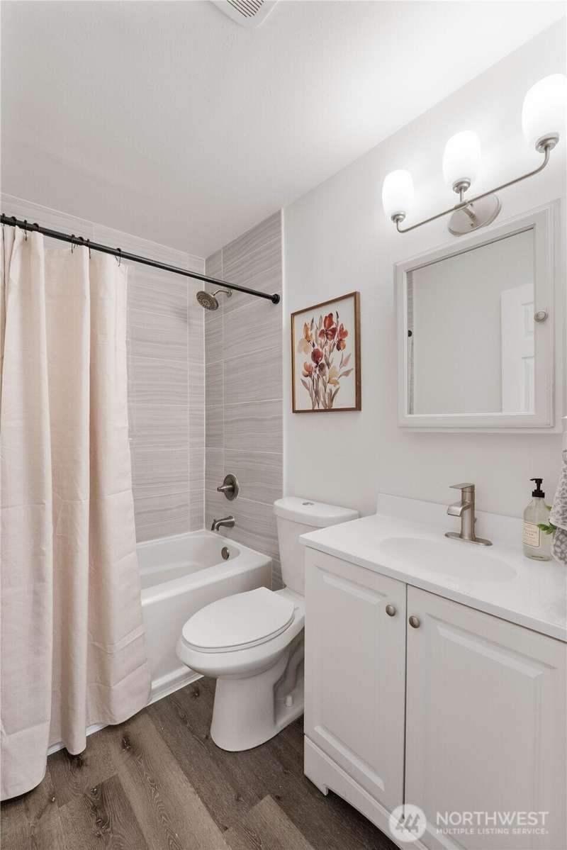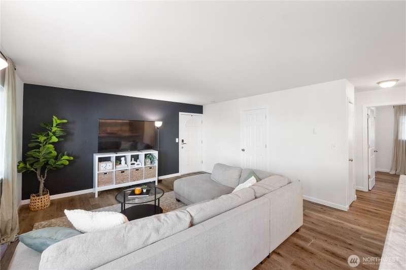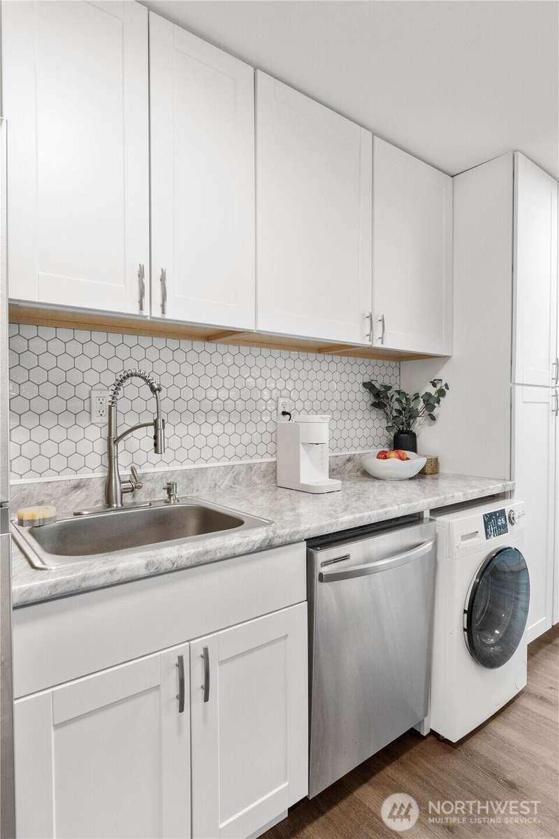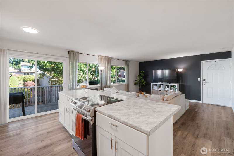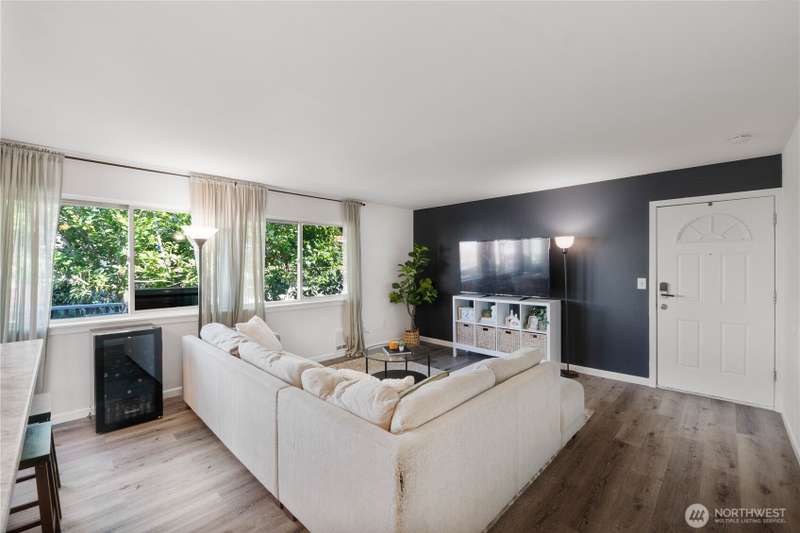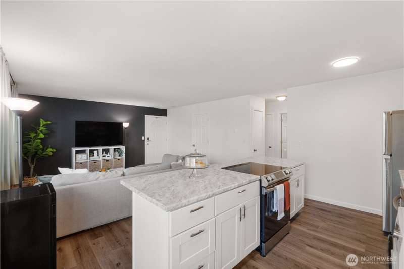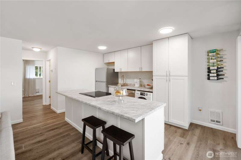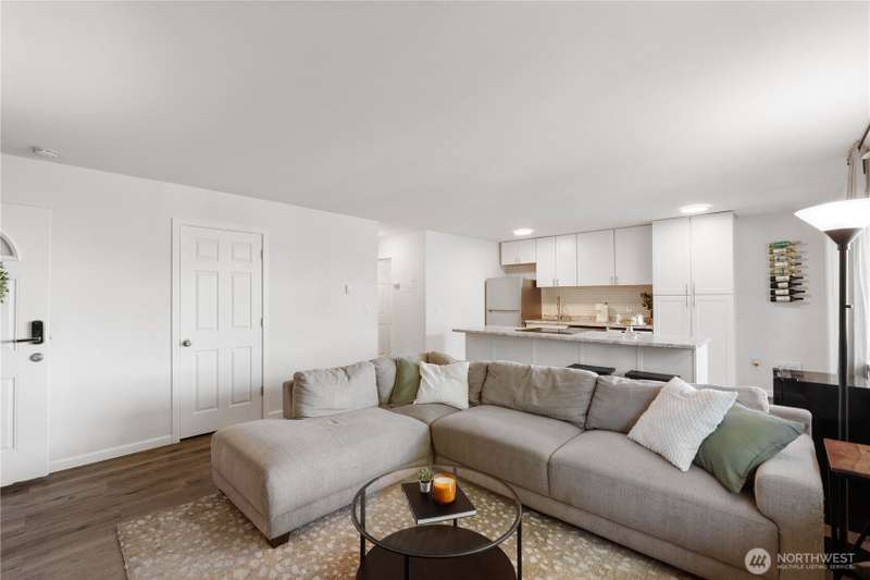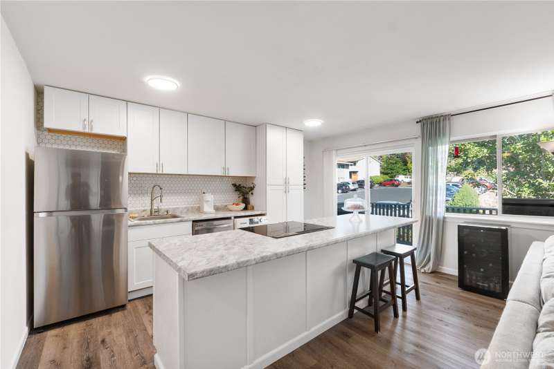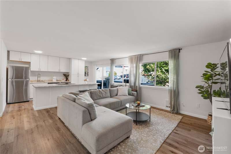 Open concept top-floor end-unit condo with a spacious kitchen and living room layout, perfect for modern living! The large kitchen island with bar seating complements stainless steel appliances, all included. Rare in-unit washer/dryer combo adds convenience. This remodeled 2 bed, 1 bath home offers a private balcony ideal for grilling and relaxing. Filled with natural light, the unit feels bright and welcoming. Close to shopping, dining, public transportation, and freeway access. A perfect starter home and thoughtfully priced to sell. Don’t miss this opportunity!