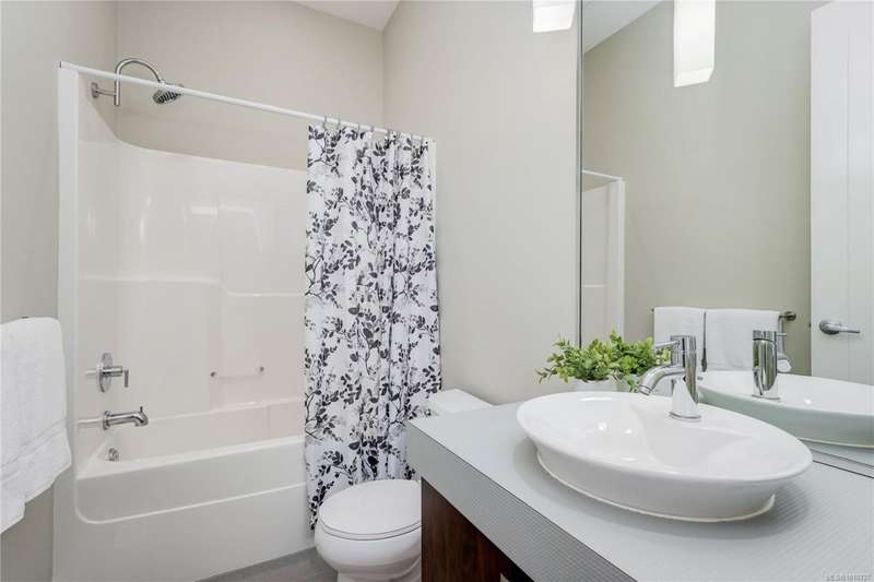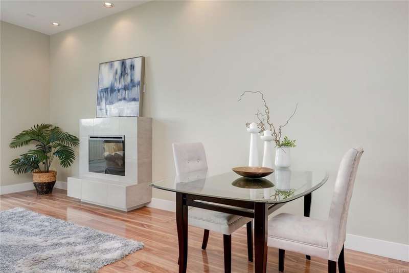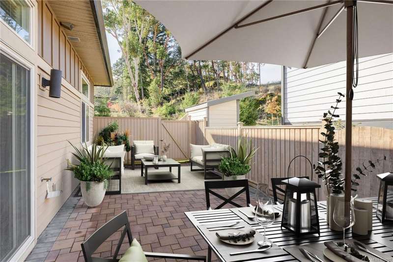 Discover this lovely one-level, 2-bed/2-bath townhome nestled in the desirable community of Royal Bay. Tucked away from construction, Pondview is located on a quiet, mature cul-de-sac surrounded by nature and walking paths. Contemporary, high-end finishes define this home. The modern kitchen is a blend of wood, stone, tile and stainless steel featuring premium Kuppersbusch appliances. The large living area is perfectly complemented by a cozy gas fireplace, 10 ft. ceilings & generous windows that allow for maximum natural light. Step outside to an oversized patio, an ideal space for summer entertaining. Accessible from the living area & fully fenced, this is your private outdoor extension. The Primary includes double closets & a 3 pc ensuite featuring a glass & tile walk-in shower & modern vanity. Situated on the opposite side of the home is the 2nd bedroom conveniently located next to the 4pc bath. A laundry room, garage and full heated crawl space finishes off this great floorplan.