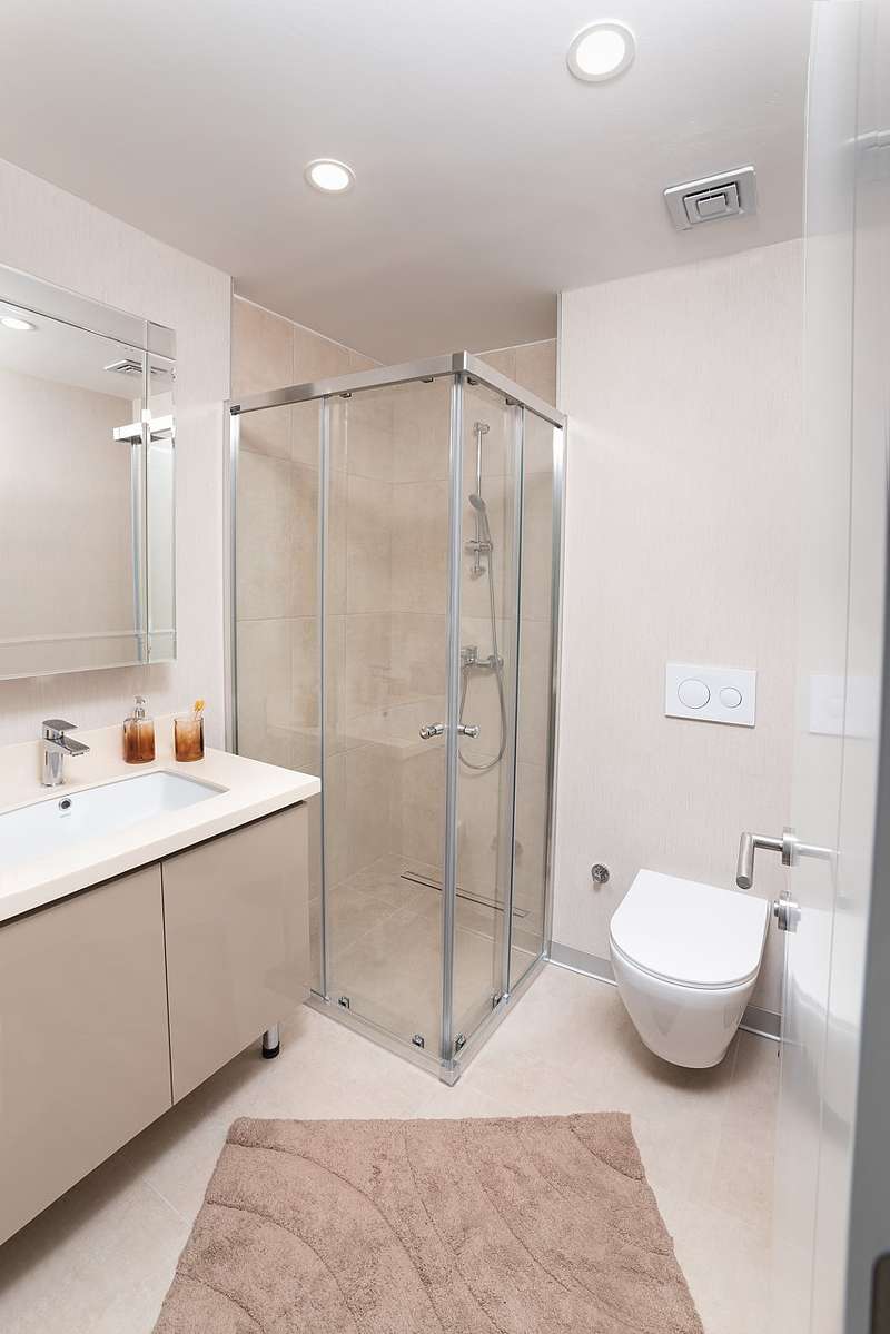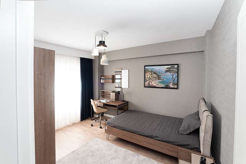 The apartments are situated in a complex consisting of two blocks. The complex features green landscaping, decorative fountains, children's play areas, a gym, Turkish bath, sauna, covered parking, 24/7 security, and security cameras.