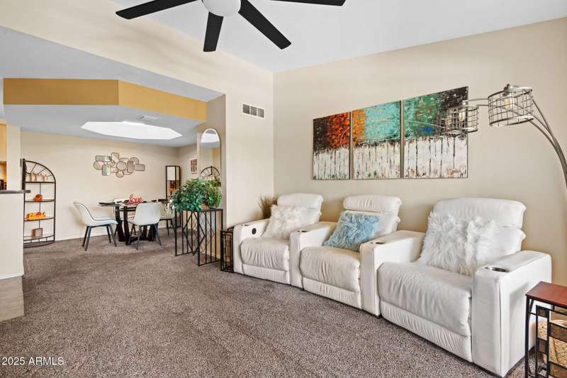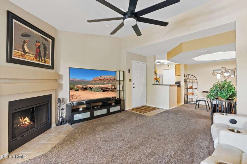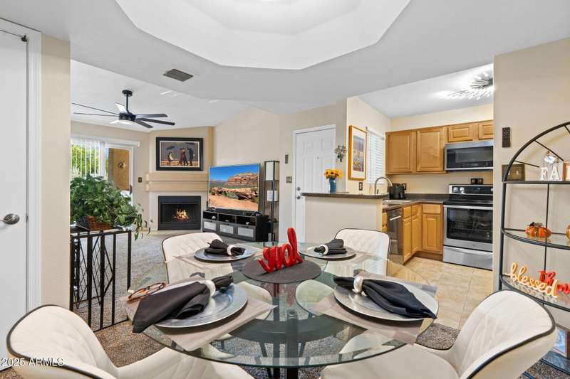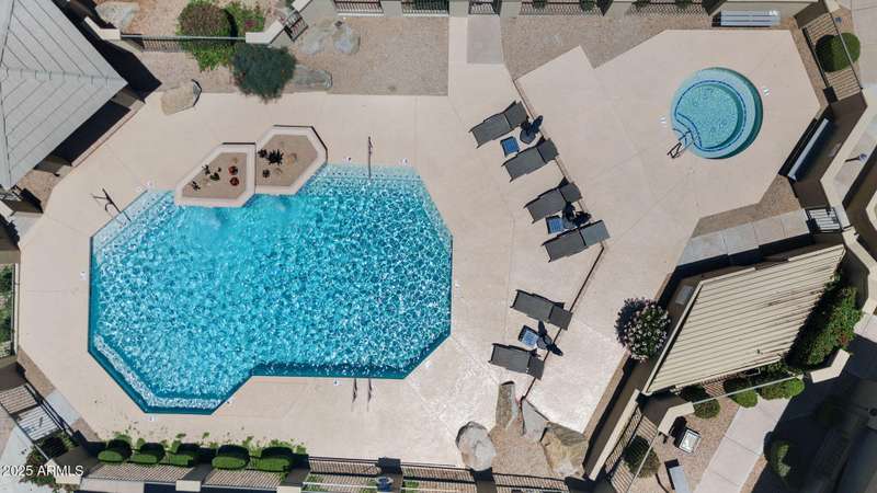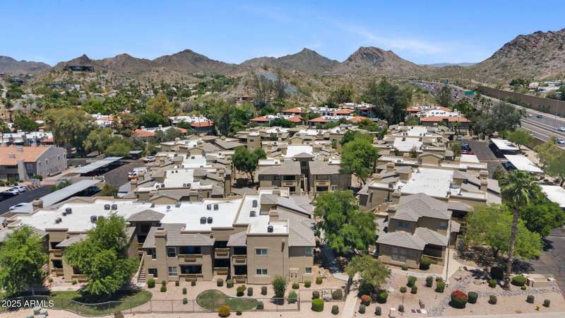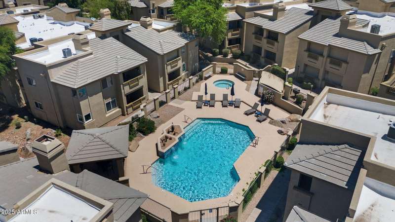 Nestled in a resort style community, this pristine condo blends comfort, convenience, and charm. Multiple upstairs balconies invite you to enjoy both sunrise and sunset views over the lush landscaped grounds, while the newly heated community pool creates the perfect year round retreat. The thoughtful split bedroom floor plan works beautifully for dual owners, roommates, or a guest and office setup. The secondary bedroom offers its own patio access, a corner window for natural light, and a walk in closet. The spacious primary suite features an oval soaking tub, mirrored closet doors, and a French door opening to the patio. Inside, you will find neutral tones, tiled floors, coved ceiling accents in the dining area, and a cozy wood burning fireplace. An interior laundry room adds convenience, while all new appliances and a newer AC from 2020 bring peace of mind. Located just minutes from the 51 freeway, this home offers quick access to all the dining, shopping, and recreation that Phoenix has to offer. Whether you are looking for a full time home or a lock and leave getaway, this condo delivers a lifestyle that is easy to love.