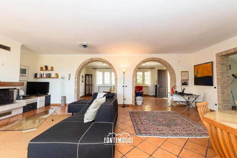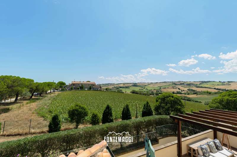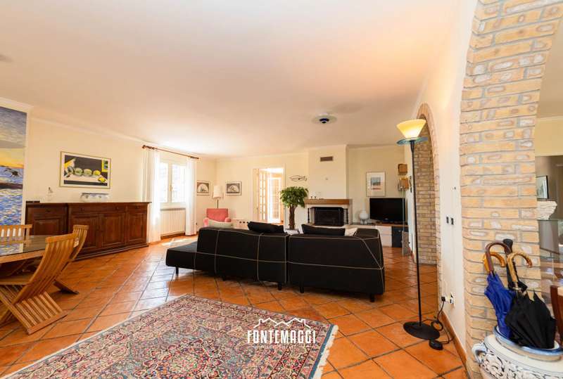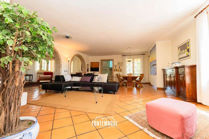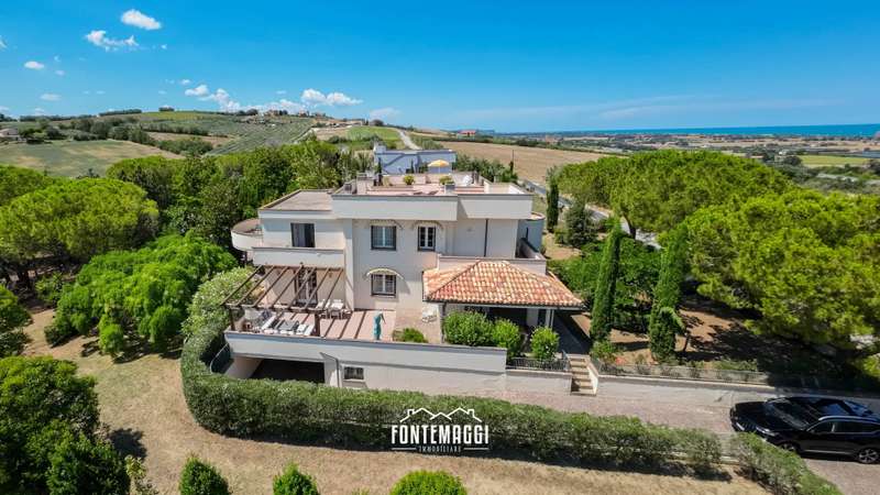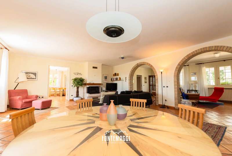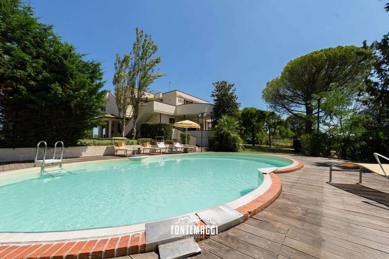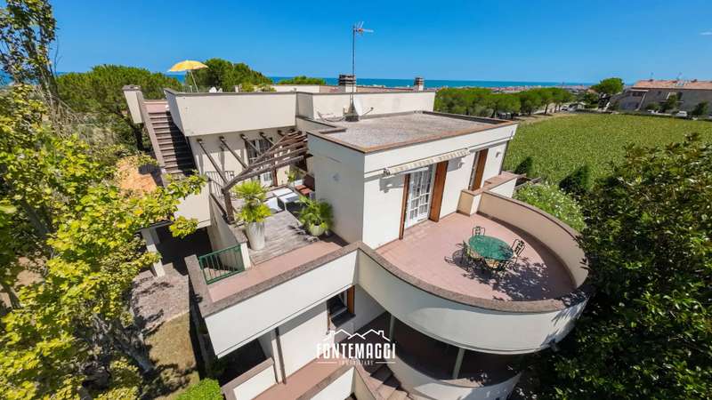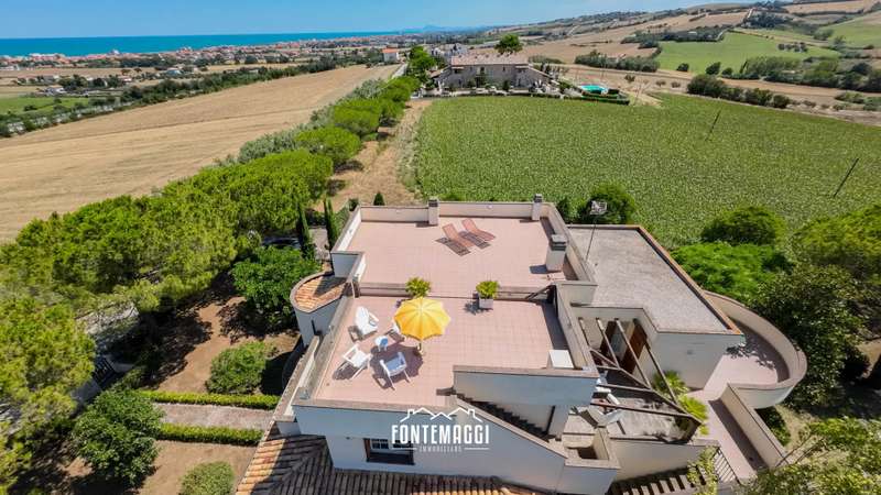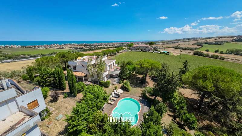 San Costanzo (PU) At 5 minutes by bike from the sea, in a hilly position with 180° panoramic view of the Adriatic Sea, from San Bartolo to Conero, easily accessible and well connected to the main roads. We offer for sale 325sqm villa built in the 90s surrounded by 1500sqm fenced park with swimming pool, garage in the basement and beautiful terrace with sea view. The property is arranged on three floors: On the ground floor of 168sqm we find a spacious living area with a large entrance hall, living room with fireplace, large bathroom, large kitchen with access to two terraces, one equipped as a living room and one as a dining room overlooking the pool. On the second floor of 155sqm the sleeping area consists of two double bedrooms with sea view balcony, twin bedroom, bathroom with shower, living room or fourth bedroom at the need with small bathroom. Adjacent to this floor is a guest area consisting of living area, bedroom and bathroom. Two bodies can be joined and have in common a terrace, which has been connected directly to the garden (an independent entrance without passing through the house). The same terrace also leads to the panoramic terrace of 120sqm with sea and hill views, ideal for enjoying moments of relaxation or celebration with friends. In the basement of 100sqm we find a garage with laundry, a cellar and a storage room with technical room. The property is completed by 19,000sqm of agricultural land, partly cultivated and partly grove. Dominant position overlooking the sea, with the possibility of getting to the beach by bicycle, well connected and easily accessible. The solution was built and used by a single family for summer and winter vacations. Concrete pillar structure, is in excellent condition, routine maintenance is required. Internally ready for use, it is sold Partially Furnished. Ideal as an accommodation facility or main residence, divisible into two or more units. Request 595,000€. "APE F" IPE: 123 kwh/sqm/year