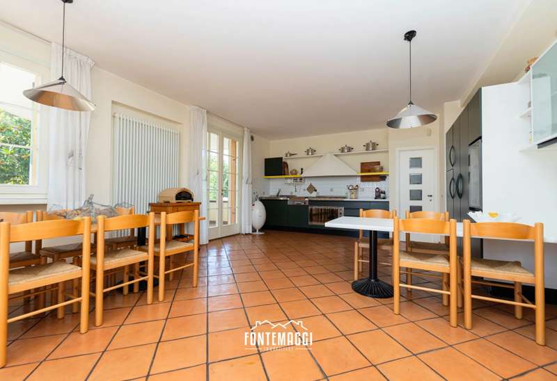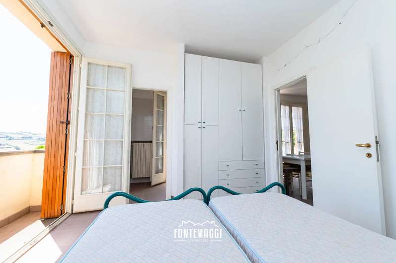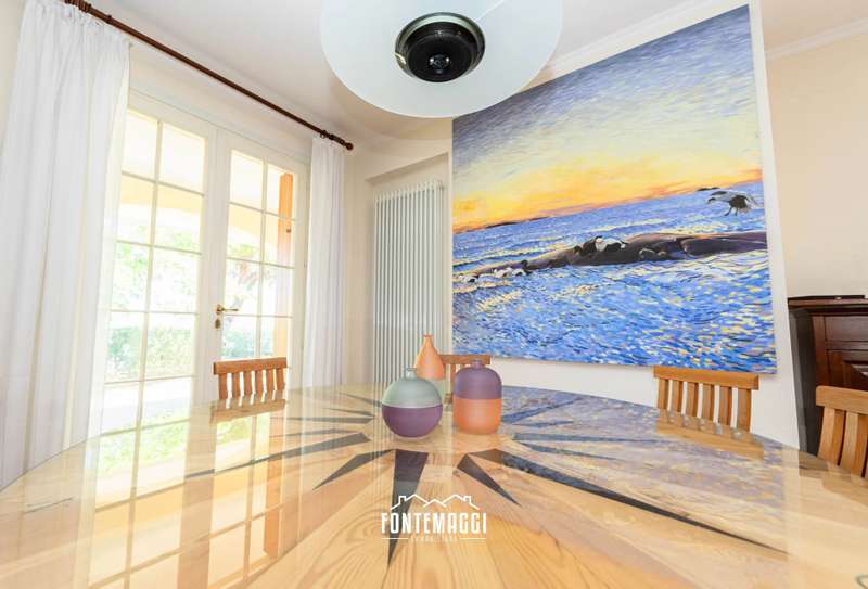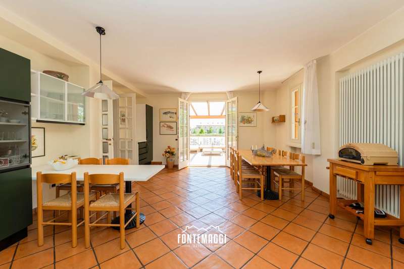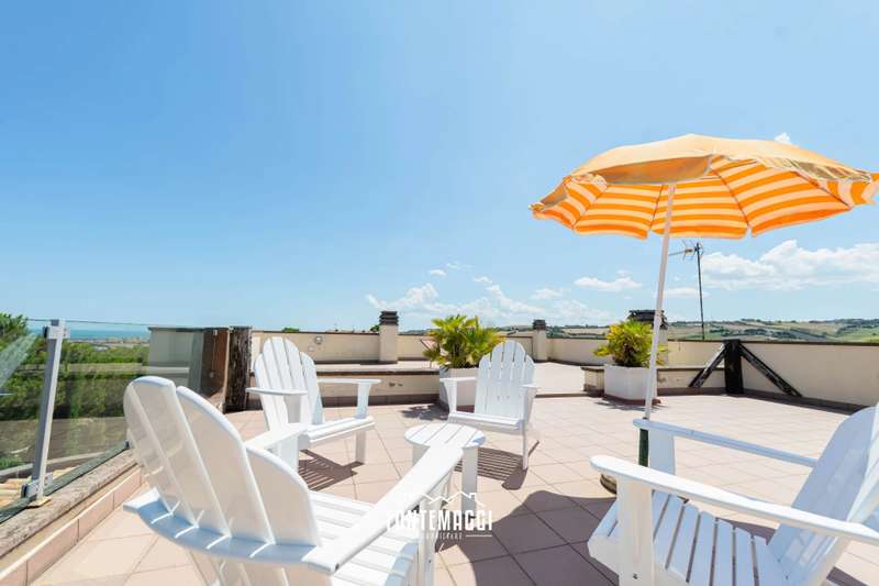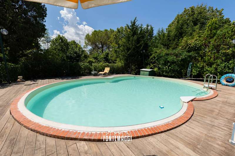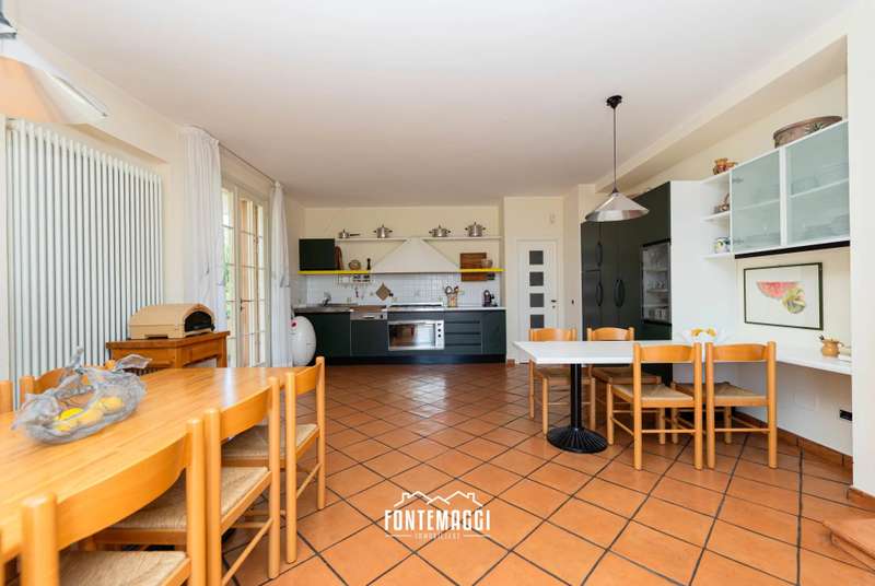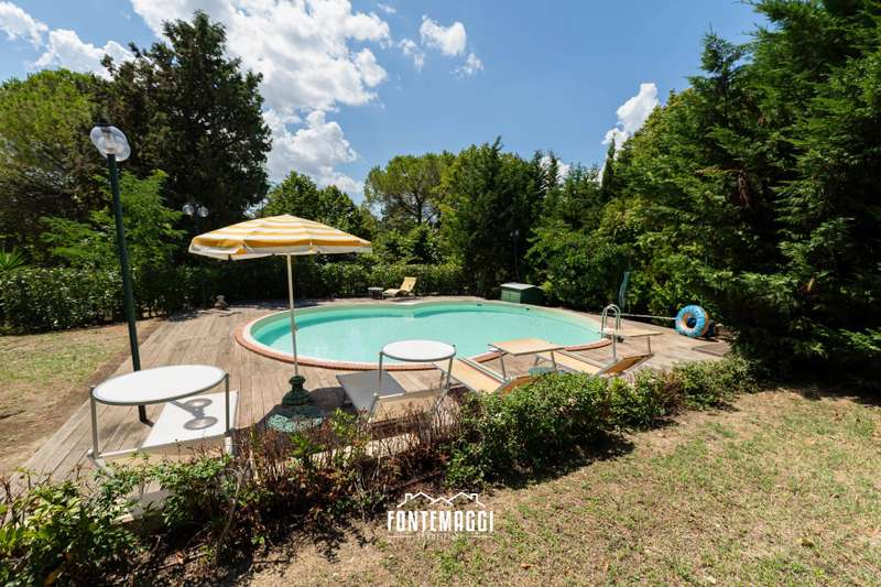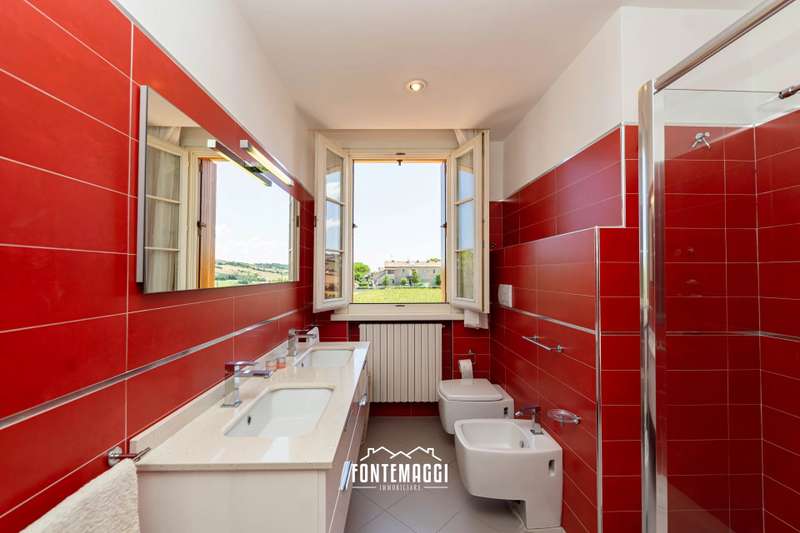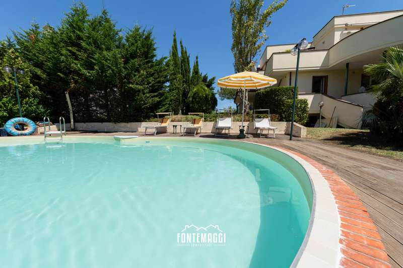 San Costanzo (PU) At 5 minutes by bike from the sea, in a hilly position with 180° panoramic view of the Adriatic Sea, from San Bartolo to Conero, easily accessible and well connected to the main roads. We offer for sale 325sqm villa built in the 90s surrounded by 1500sqm fenced park with swimming pool, garage in the basement and beautiful terrace with sea view. The property is arranged on three floors: On the ground floor of 168sqm we find a spacious living area with a large entrance hall, living room with fireplace, large bathroom, large kitchen with access to two terraces, one equipped as a living room and one as a dining room overlooking the pool. On the second floor of 155sqm the sleeping area consists of two double bedrooms with sea view balcony, twin bedroom, bathroom with shower, living room or fourth bedroom at the need with small bathroom. Adjacent to this floor is a guest area consisting of living area, bedroom and bathroom. Two bodies can be joined and have in common a terrace, which has been connected directly to the garden (an independent entrance without passing through the house). The same terrace also leads to the panoramic terrace of 120sqm with sea and hill views, ideal for enjoying moments of relaxation or celebration with friends. In the basement of 100sqm we find a garage with laundry, a cellar and a storage room with technical room. The property is completed by 19,000sqm of agricultural land, partly cultivated and partly grove. Dominant position overlooking the sea, with the possibility of getting to the beach by bicycle, well connected and easily accessible. The solution was built and used by a single family for summer and winter vacations. Concrete pillar structure, is in excellent condition, routine maintenance is required. Internally ready for use, it is sold Partially Furnished. Ideal as an accommodation facility or main residence, divisible into two or more units. Request 595,000€. "APE F" IPE: 123 kwh/sqm/year