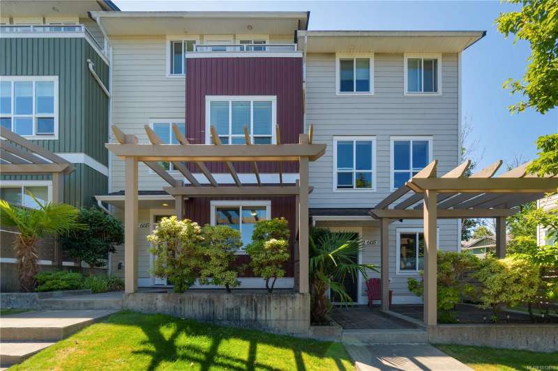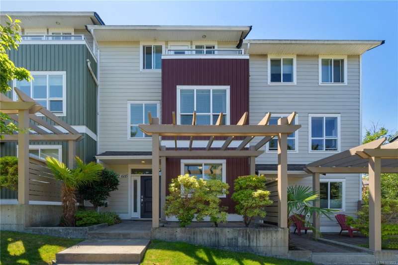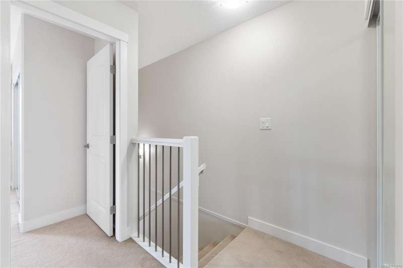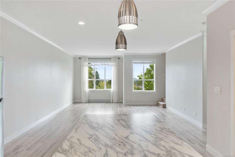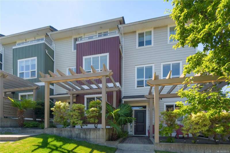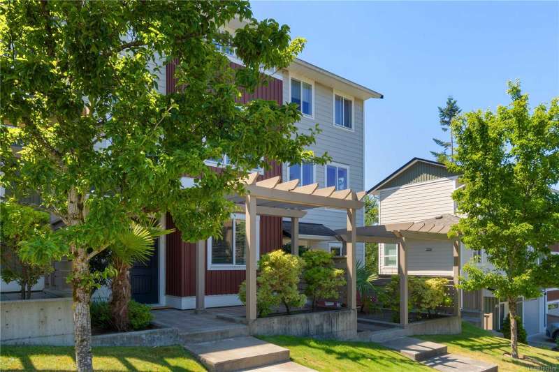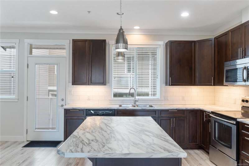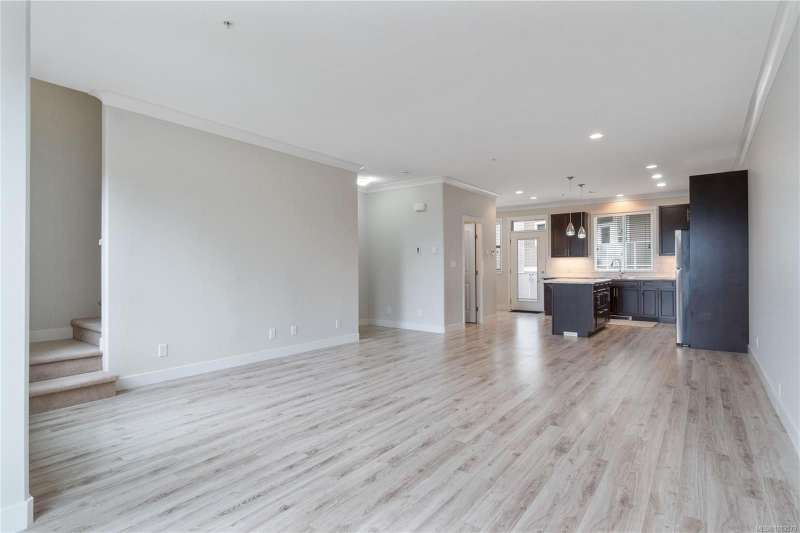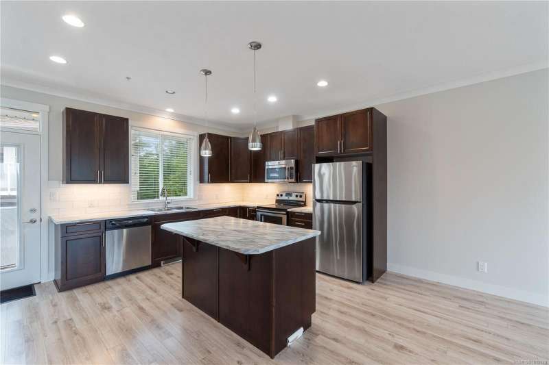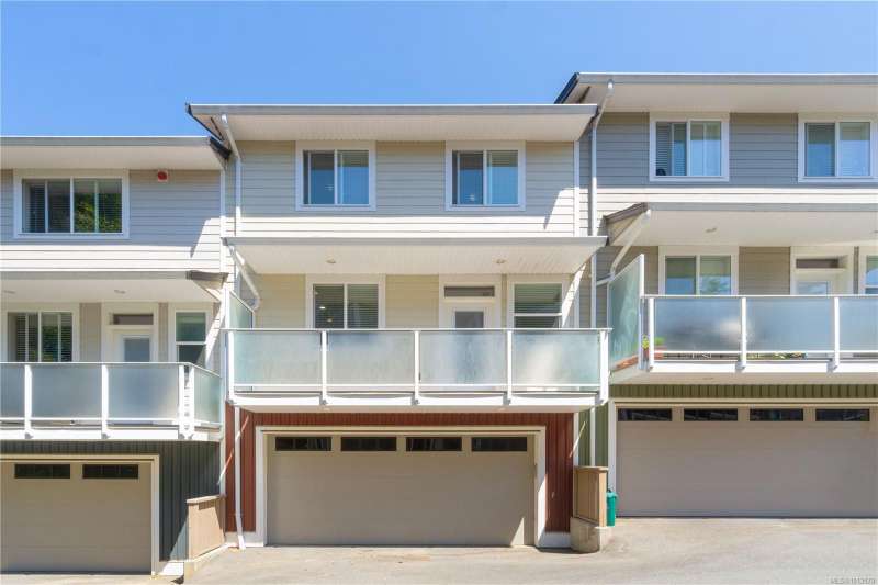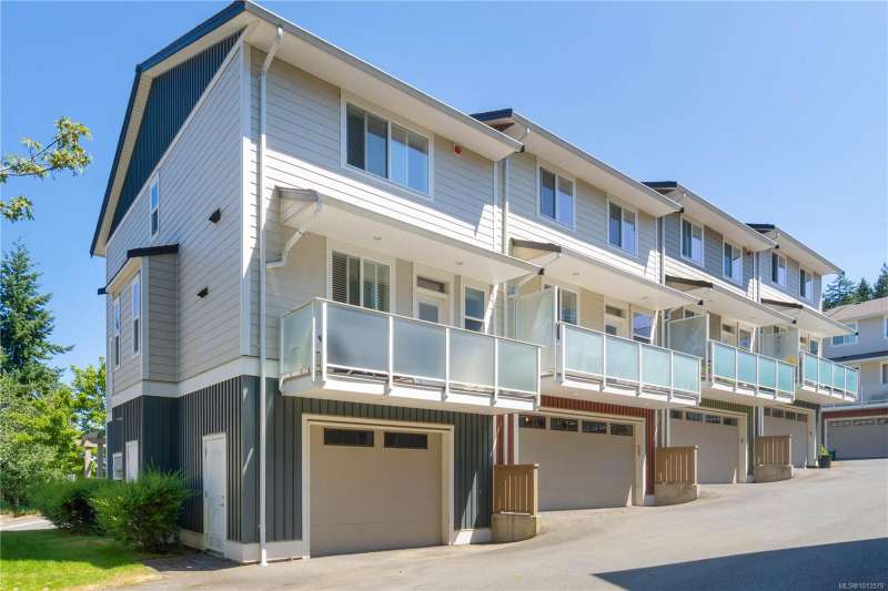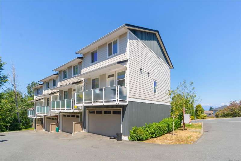 Amazing value in North Nanaimo! This move in ready 3-bed + den North Nanaimo townhome is ready for a new owner. Thoughtfully designed across 3 levels, the main floor features 9' ceilings, heated floors, and large windows that flood the space with natural light. The open-concept kitchen offers shaker-style cabinetry, a subway tile backsplash, stainless steel appliances, and a large island with breakfast bar. Upstairs, the primary bedroom includes an ensuite and private deck with distant ocean views, plus two more bedrooms and a 4-piece bath. The ground floor includes a large den/ flex space and access to the large double garage. Situated on a quiet street in North Nanaimo, this home is conveniently close to a wide range of amenities including Woodgrove Centre, Costco, grocery stores, restaurants, schools, parks, walking trails, and transit. All measurements are approximate and should be verified if important.