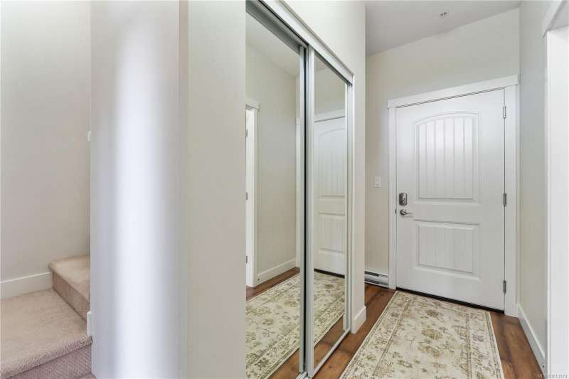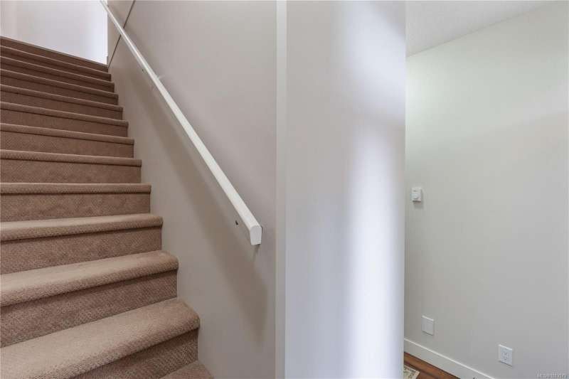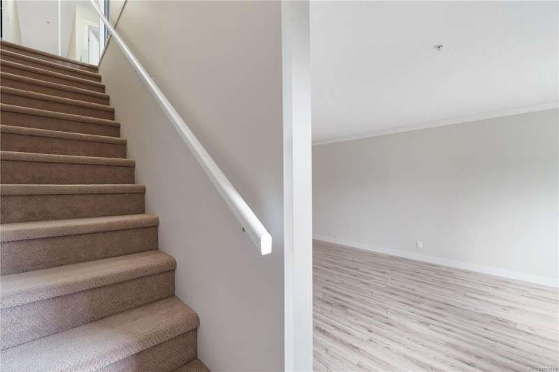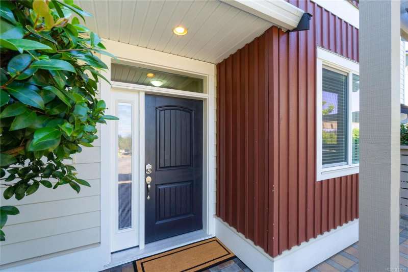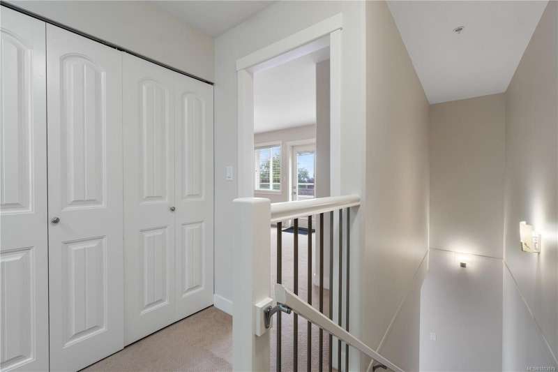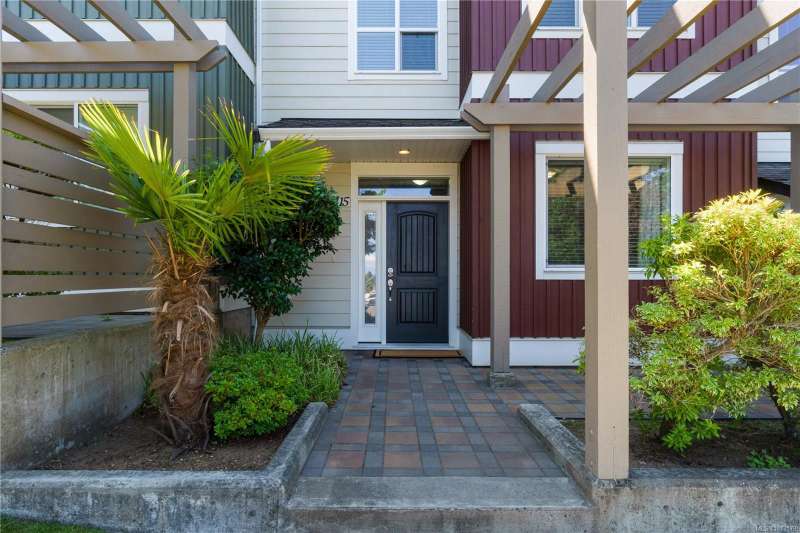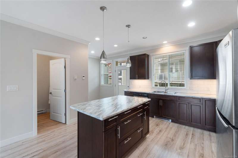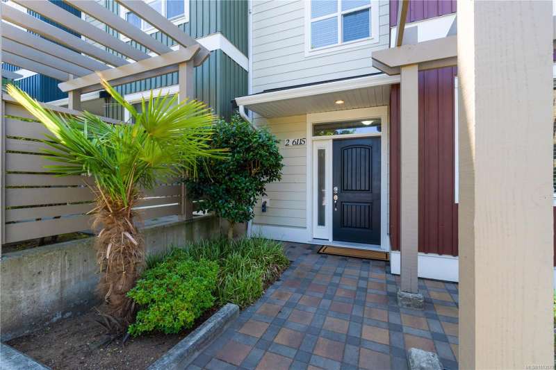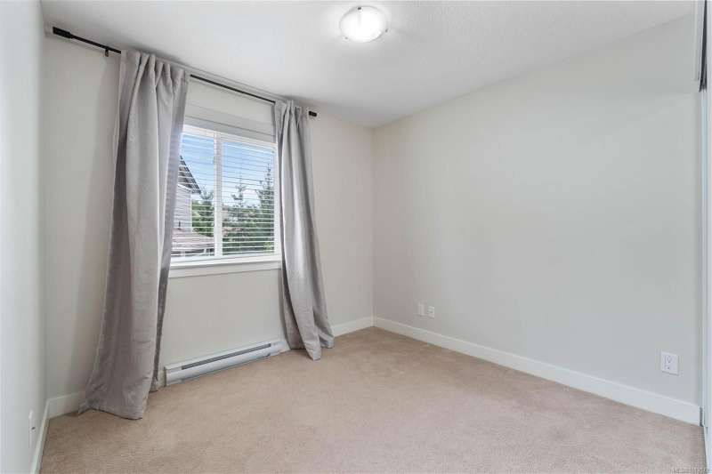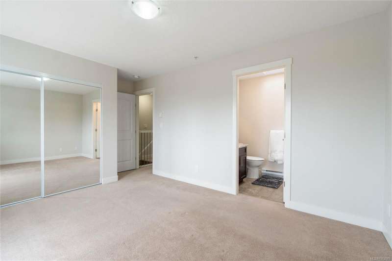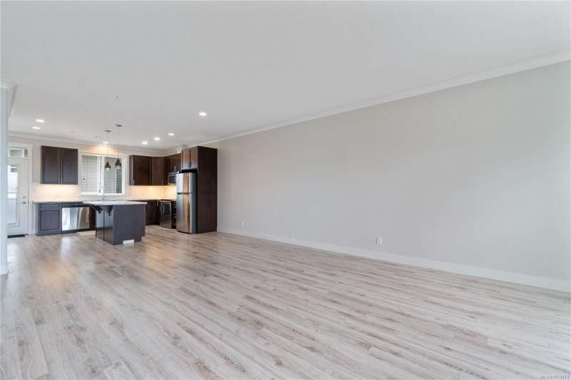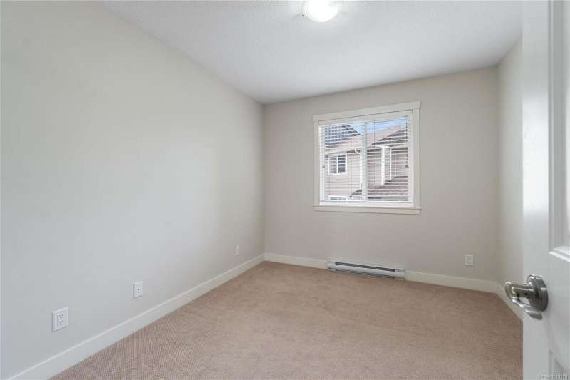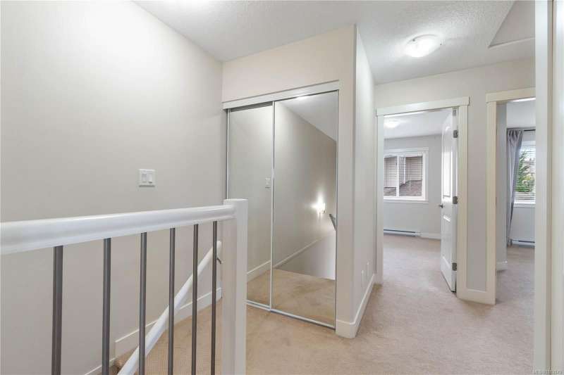 Amazing value in North Nanaimo! This move in ready 3-bed + den North Nanaimo townhome is ready for a new owner. Thoughtfully designed across 3 levels, the main floor features 9' ceilings, heated floors, and large windows that flood the space with natural light. The open-concept kitchen offers shaker-style cabinetry, a subway tile backsplash, stainless steel appliances, and a large island with breakfast bar. Upstairs, the primary bedroom includes an ensuite and private deck with distant ocean views, plus two more bedrooms and a 4-piece bath. The ground floor includes a large den/ flex space and access to the large double garage. Situated on a quiet street in North Nanaimo, this home is conveniently close to a wide range of amenities including Woodgrove Centre, Costco, grocery stores, restaurants, schools, parks, walking trails, and transit. All measurements are approximate and should be verified if important.