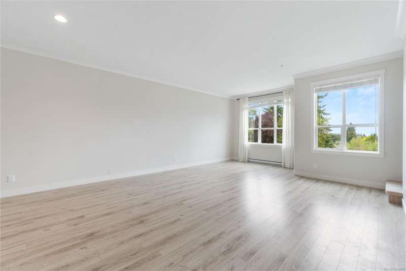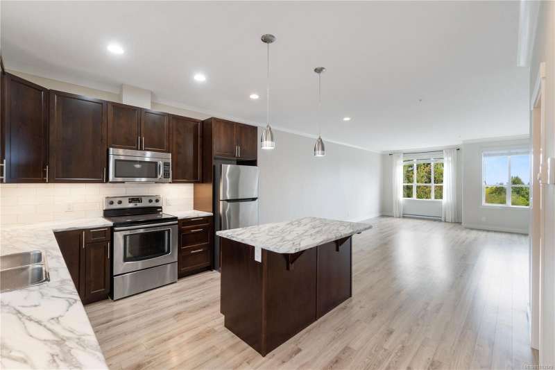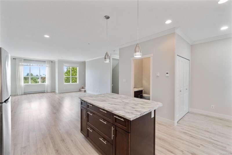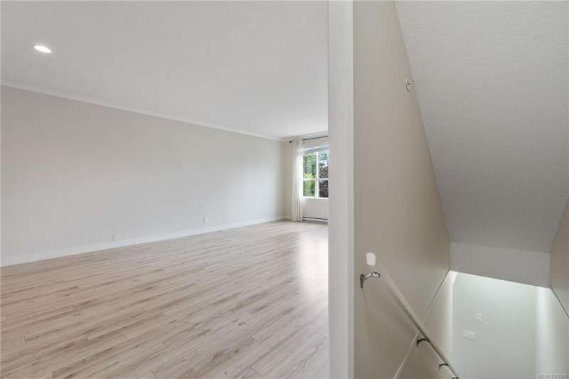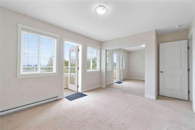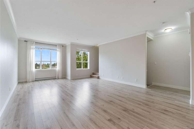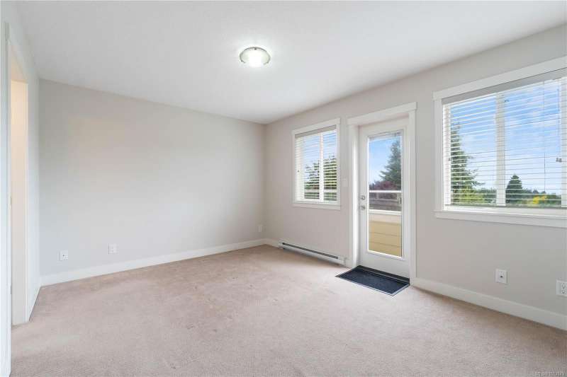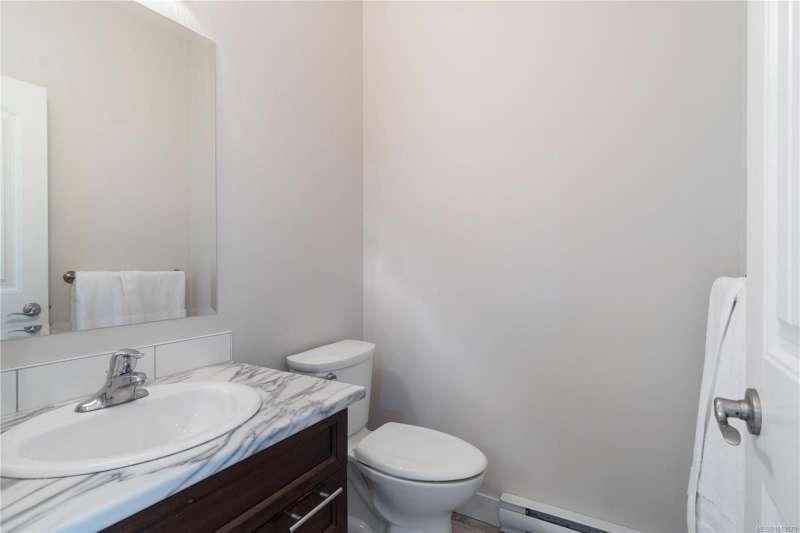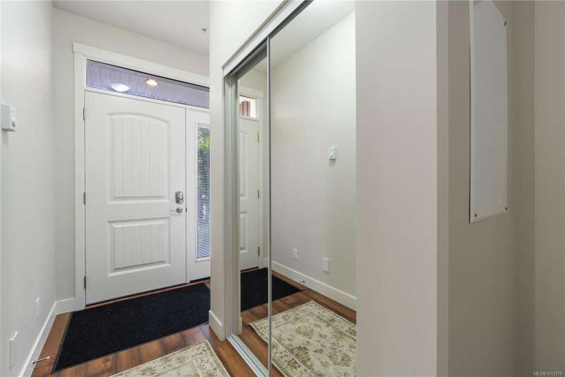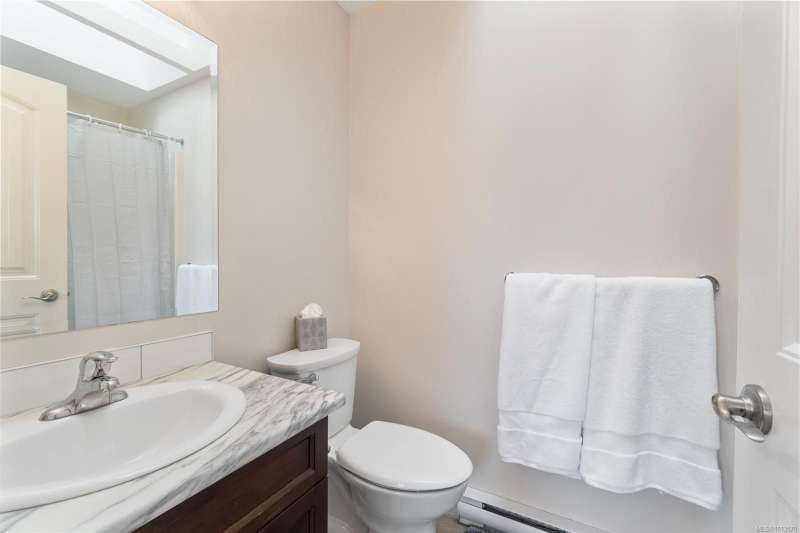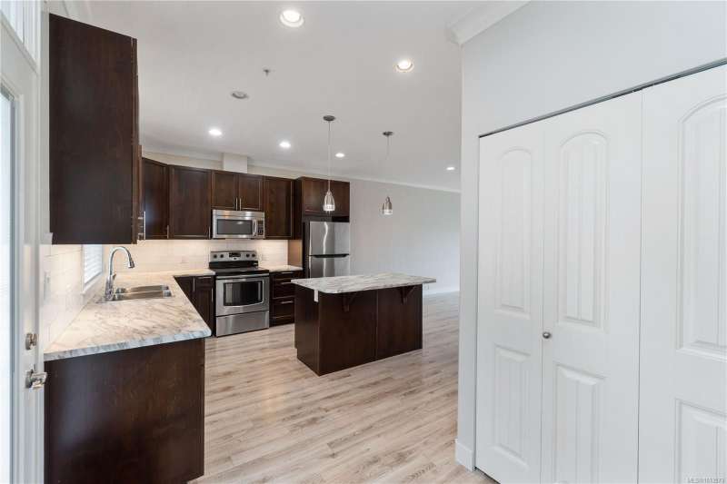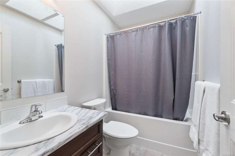 Amazing value in North Nanaimo! This move in ready 3-bed + den North Nanaimo townhome is ready for a new owner. Thoughtfully designed across 3 levels, the main floor features 9' ceilings, heated floors, and large windows that flood the space with natural light. The open-concept kitchen offers shaker-style cabinetry, a subway tile backsplash, stainless steel appliances, and a large island with breakfast bar. Upstairs, the primary bedroom includes an ensuite and private deck with distant ocean views, plus two more bedrooms and a 4-piece bath. The ground floor includes a large den/ flex space and access to the large double garage. Situated on a quiet street in North Nanaimo, this home is conveniently close to a wide range of amenities including Woodgrove Centre, Costco, grocery stores, restaurants, schools, parks, walking trails, and transit. All measurements are approximate and should be verified if important.