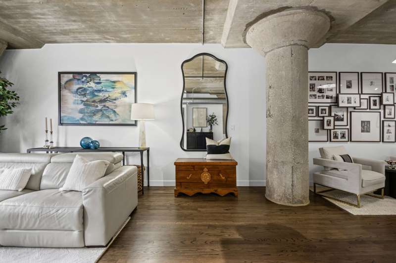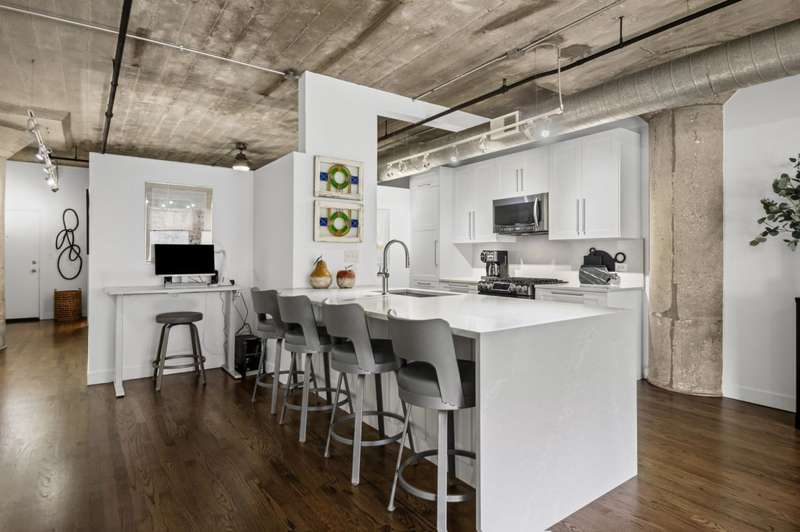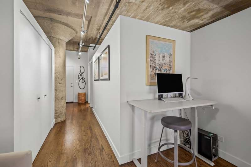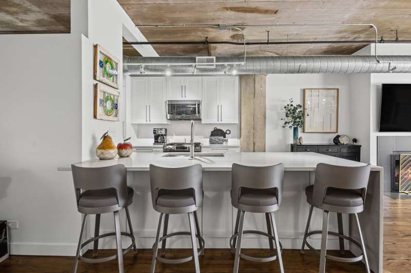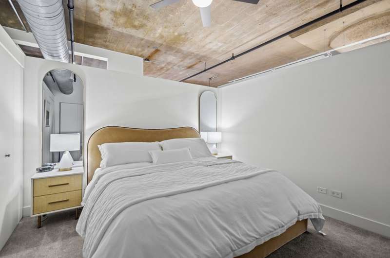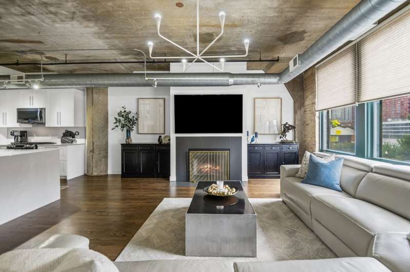 In the heart of fabulous River North, once again welcoming you to the iconic Ontario Street Lofts! This special one -bedroom one bath residence has been completely meticulously renovated to the nines, blending modern luxury with authentic loft character. The striking white chef's kitchen sporting custom designed cabinets and a stunning quartz island, doubling as both an generous prep space then seamlessly doubles as a dining table, perfect for entertaining or everyday meals . Spacious bedroom with neutral finishes, ceiling fan and and updated bath with rain forest shower. The open concept floorplan offers over 1100 sq ft. with hardwood floors, wood burning fireplace with marble surround , concrete ceiling and pillars, custom window treatment, nest thermostat, in- unit laundry and beautiful south sunlight throughout the day and at night a dazzling view of the city! Unit also includes one indoor heated parking space #28 with no extra tax or assessment and private storage locker #323, pets welcomed.