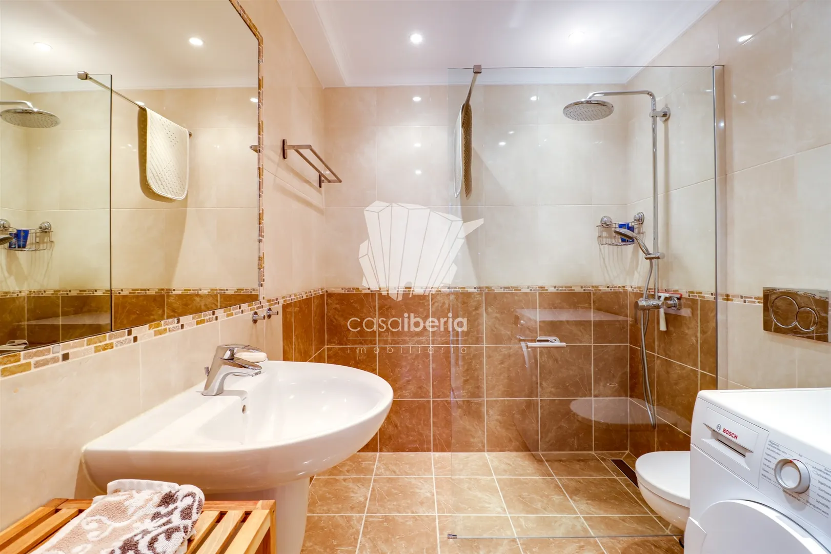 The property has a spacious living/dining room with a fireplace, a fully equipped kitchen, 2 bedrooms, one of which is en suite with fitted wardrobes, and an additional bathroom. Both bathrooms have been renovated this year with modern showers
