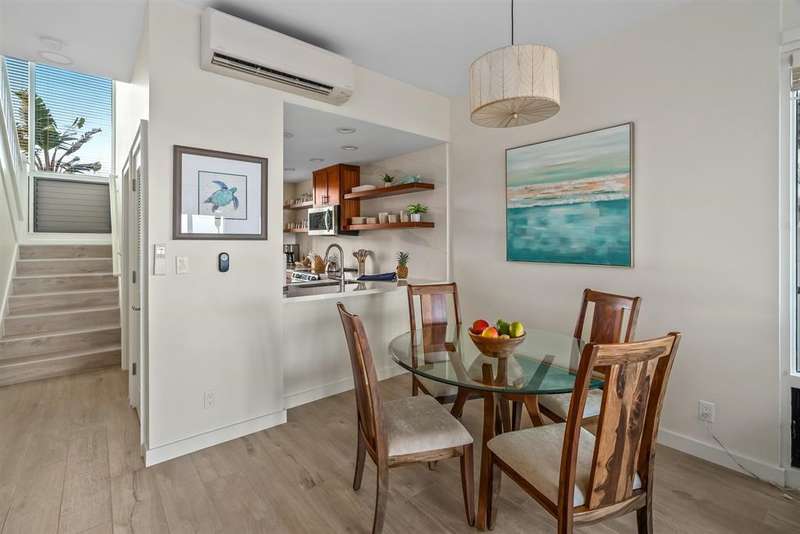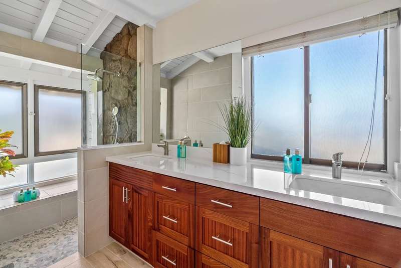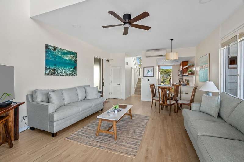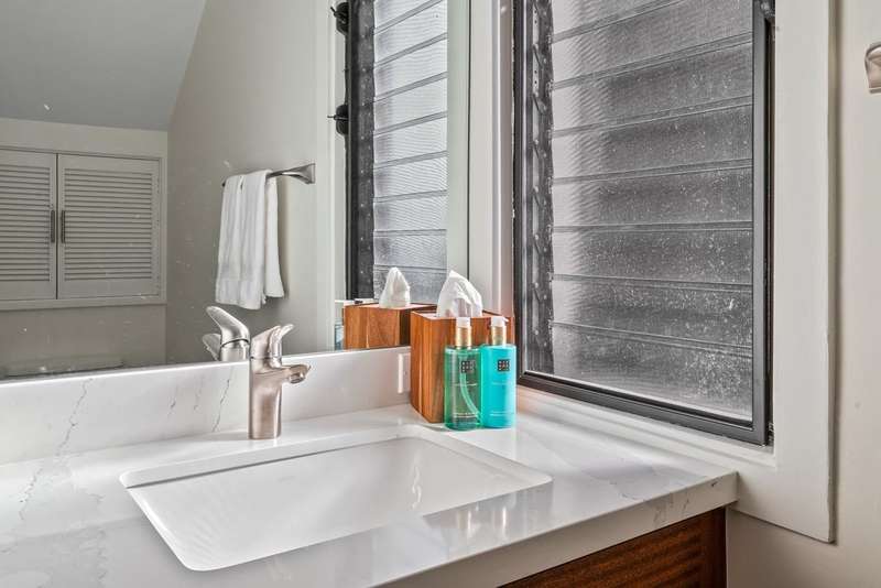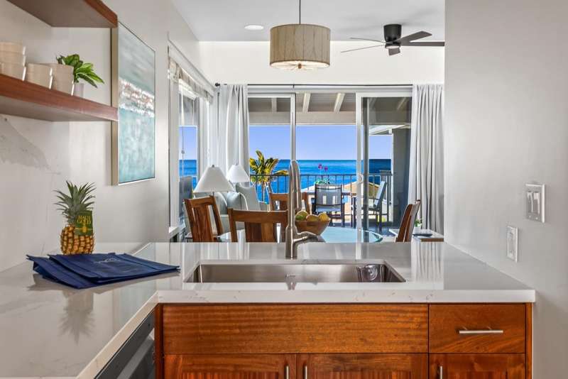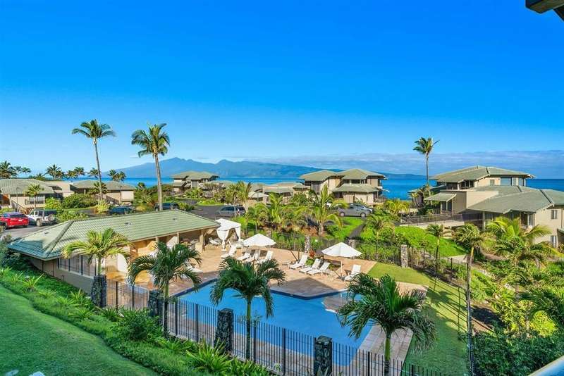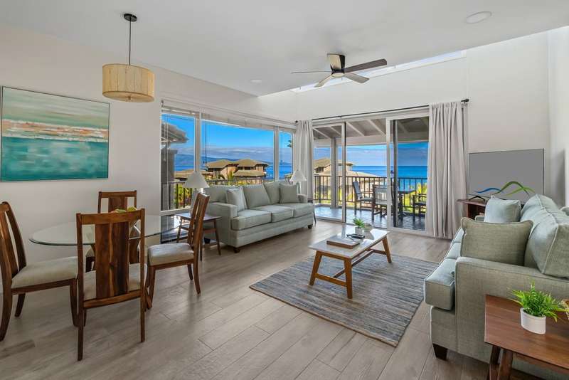 Welcome to Kapalua Bay Villas 33-B2! Remodeled from top to bottom, this bright one-bedroom, 1.5 bath corner unit showcases sweeping ocean, Molokai, and sunset views. Located on the desirable bridge level, there are no steps from the parking area to the entry. Completed in 2023, the full renovation features a contemporary island design with Sapele cabinets, porcelain tile throughout, quartz countertops, farmhouse sink, floating kitchen shelves, new appliances, new sliding doors, brand new split AC, high-end remote blackout blinds, and designer furnishings. The primary suite is located on the upper level with a private lanai for sunset views, lounge seating, and a luxurious bathroom with a walk-in lava rock shower. The main level offers high ceilings and an open-concept great room with kitchen, dining, and living areas, all oriented to the ocean, plus a covered lanai for dining and whale watching. Resort amenities include three ocean view pools, two tennis courts, BBQs, and direct access to the Kapalua Coastal Trail. Walking distance to Oneloa Bay and close to world-class golf, restaurants, and spa services.