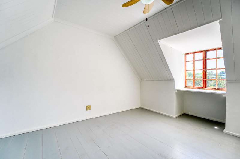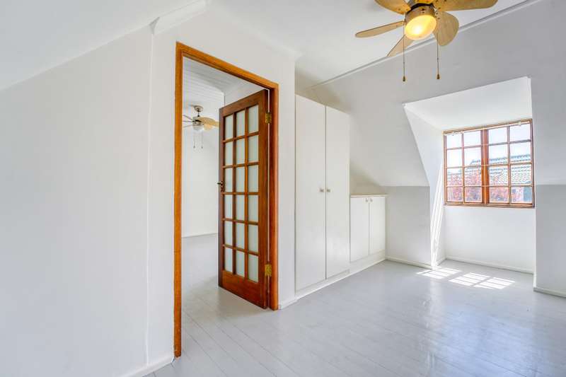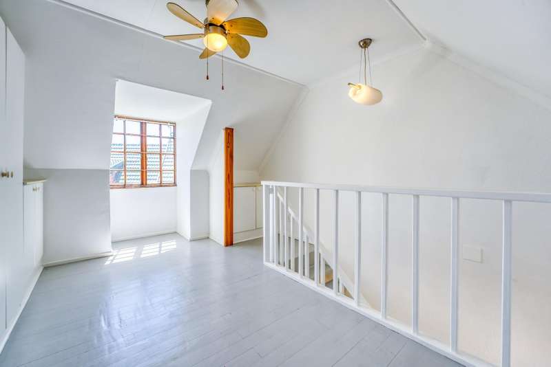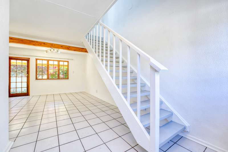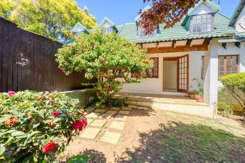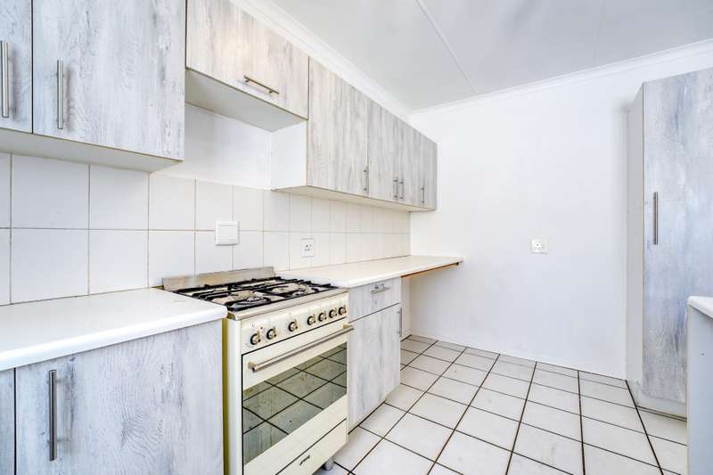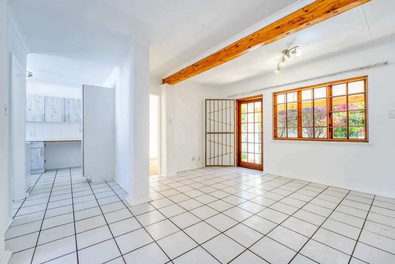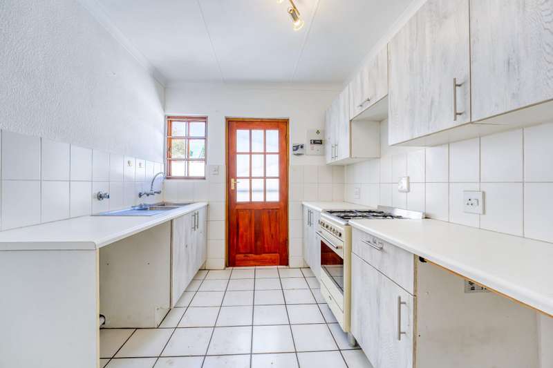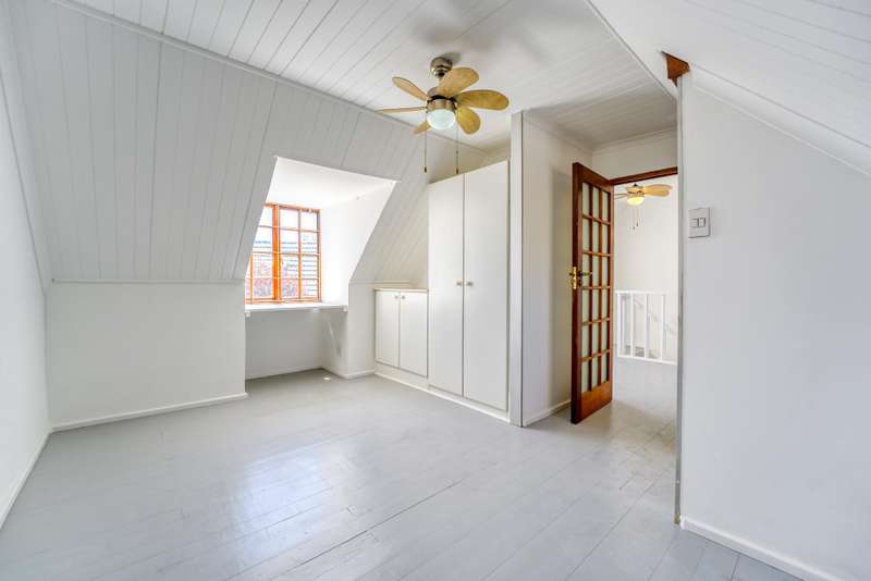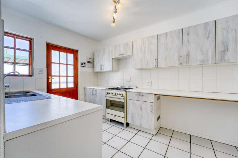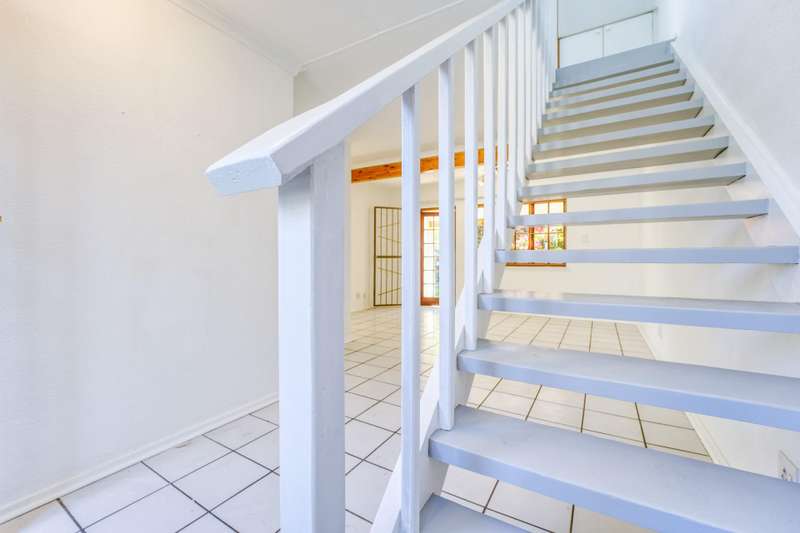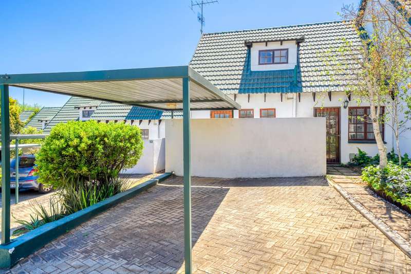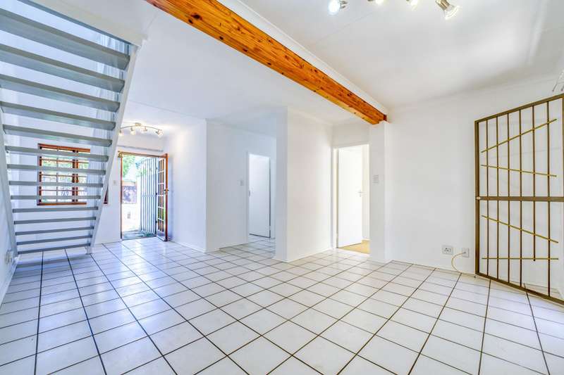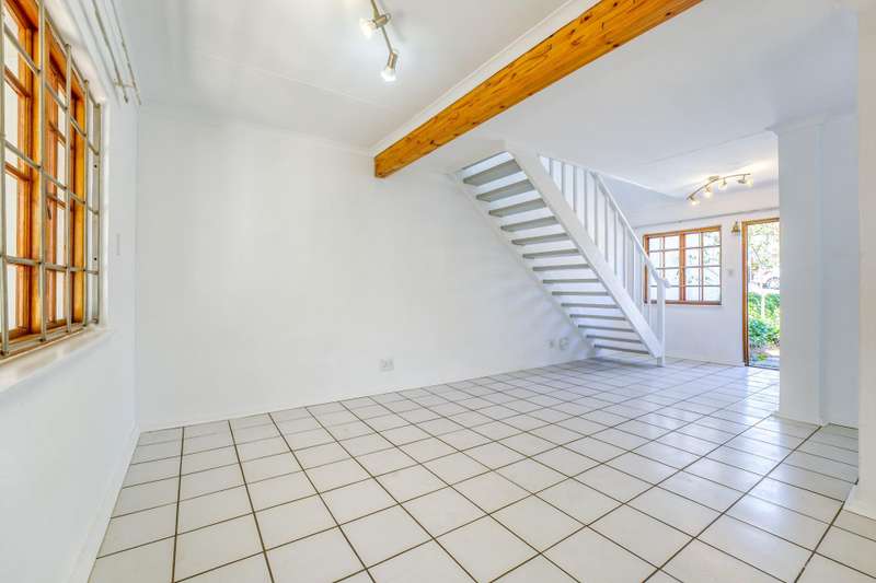 This charming property in Devon Valley, Weltevreden Park, offers a comfortable and practical living space. The kitchen is well-equipped with light wood-grain cupboards, white tiled walls and floors, and a free-standing oven with a gas hob. It also features a double sink and a door leading to the outside. The living area is spacious and bright with white tiled floors and white walls, creating a clean and airy feel. A prominent wooden beam adds a touch of character to the ceiling. The stairs, with white wooden railings and light grey treads, lead up to the second level. Upstairs, the master bedroom, features light grey wooden floors and white walls, creating a bright and inviting atmosphere. It includes built-in cupboards and a ceiling fan, ensuring comfort. The exterior of the property is equally appealing, featuring a well-maintained garden with communal pool in the complex ,The property is surrounded by trees providing privacy and for peace of mind there is 24 hour security.