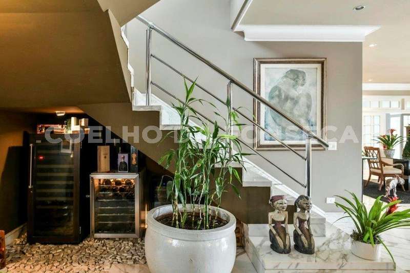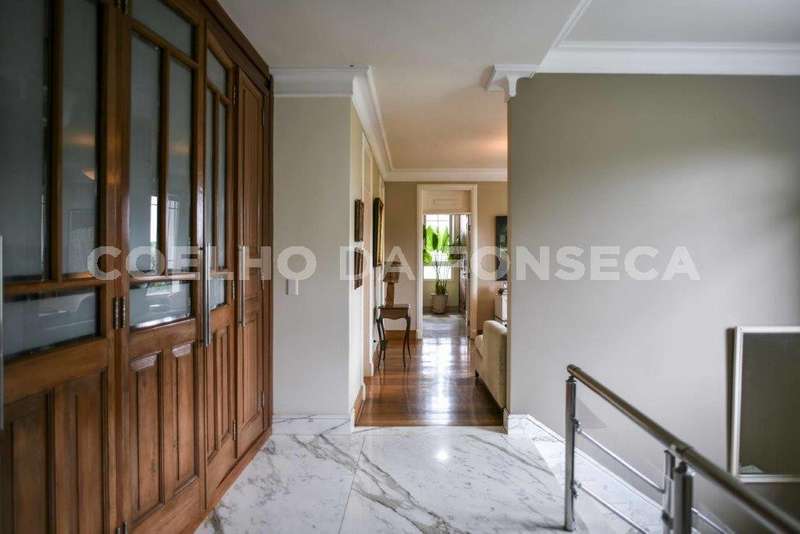 No piso superior, 5 dormitórios sendo 4 suítes com closet, 3 hidromassagens, espaço fitness ou ateliê com lareira e ambiente de descanso, sala íntima com lareira e mini despensa, além de ar condicionado central e elevador.