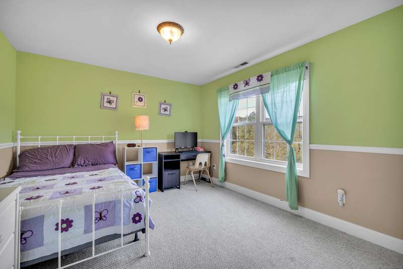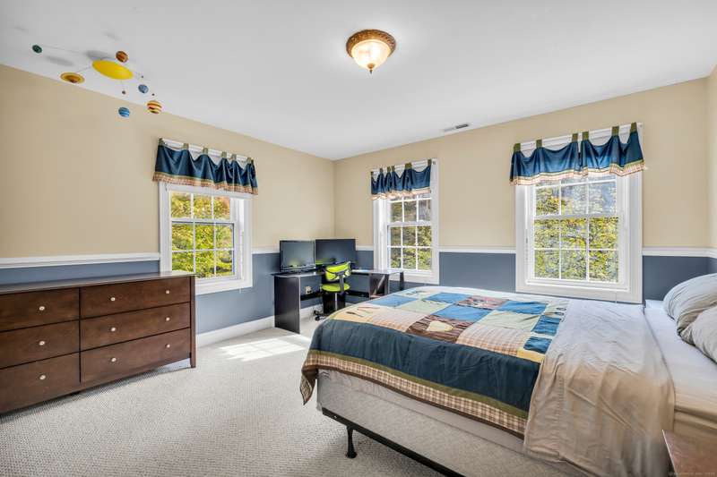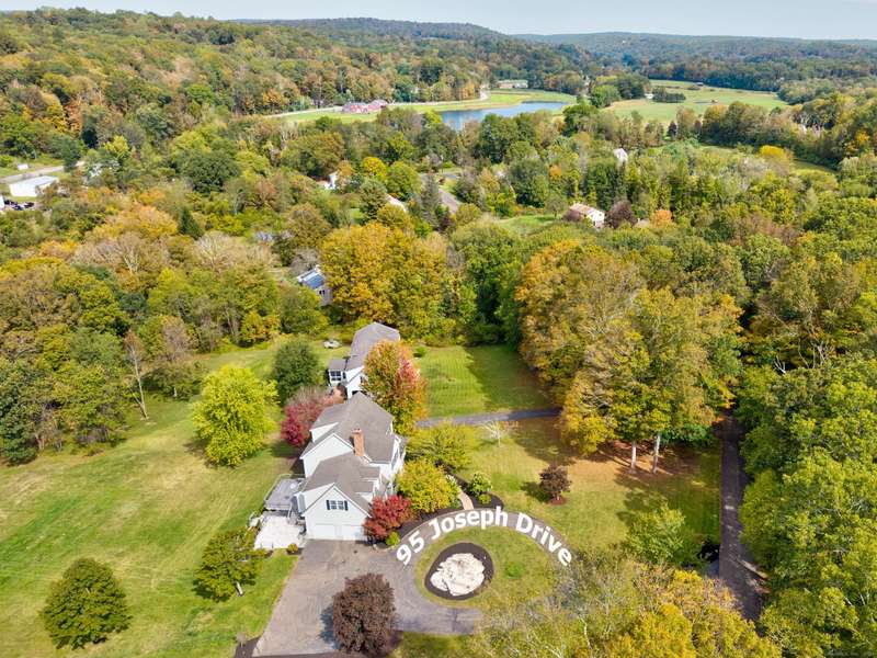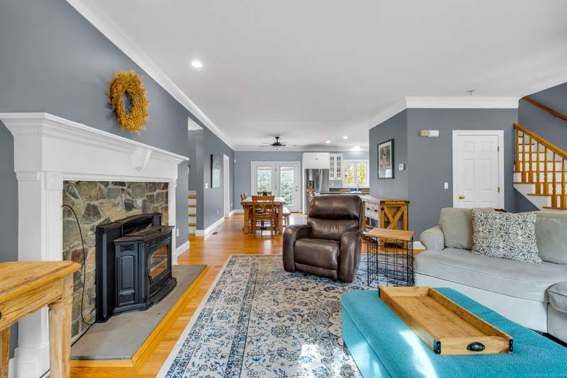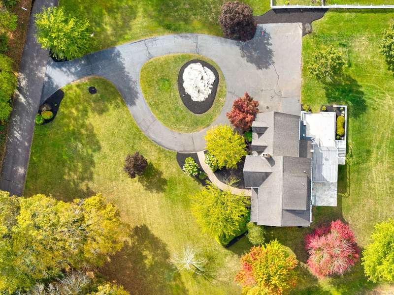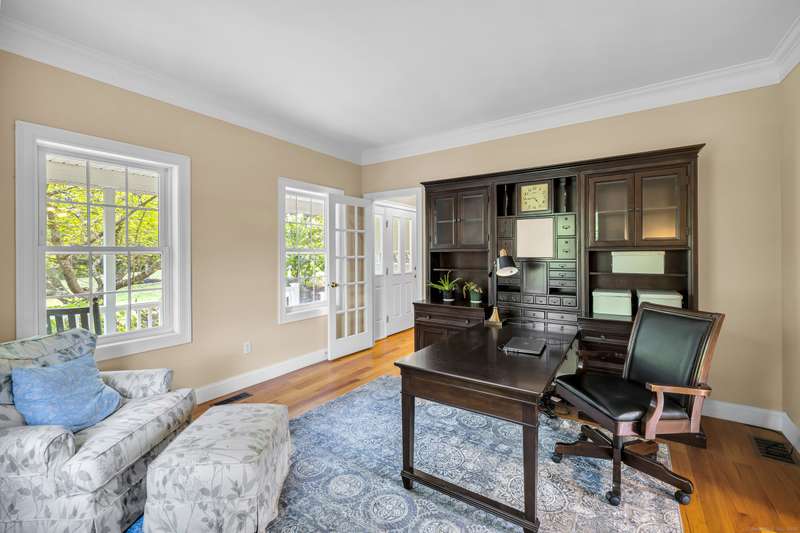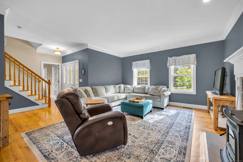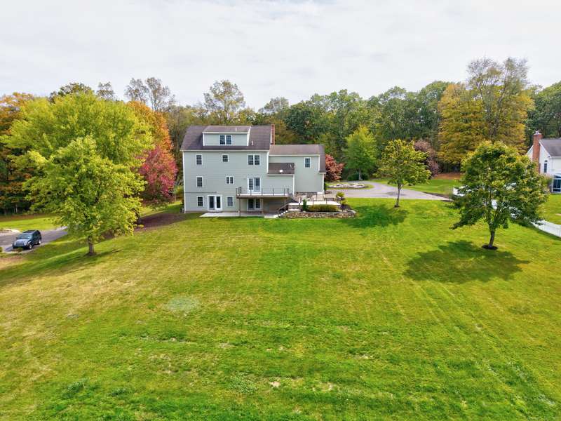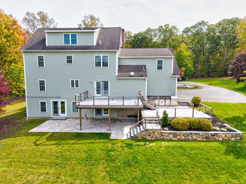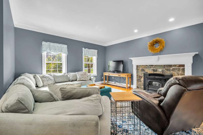 Nestled on a serene 2.19-acre lot at the end of a cul-de-sac on a private road, this Colonial is flanked by similar homes, offering a peaceful and picturesque setting. Featuring 4 bedrooms and 3.5 baths across three finished levels. A circular driveway and paver walkway lead to a charming covered front porch; perfect for morning coffee or welcoming guests. Inside, the foyer opens to a living room with a wood-burning fireplace and stone surround, flowing into the dining area and kitchen. The light-filled kitchen features custom Crystal Cabinet Works soft-close cabinetry, soapstone countertops, stainless steel appliances, including a Viking Professional double oven with 6-burner cook-top, and a center island. Additional main-level highlights include a dedicated home office, formal dining room with French doors, powder room, and laundry room. A secondary staircase leads to a versatile bonus room; perfect for a second office, guest space, or recreation area. Upstairs, the master bedroom in