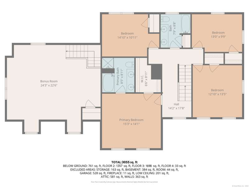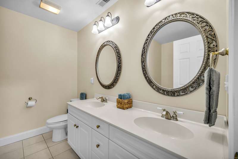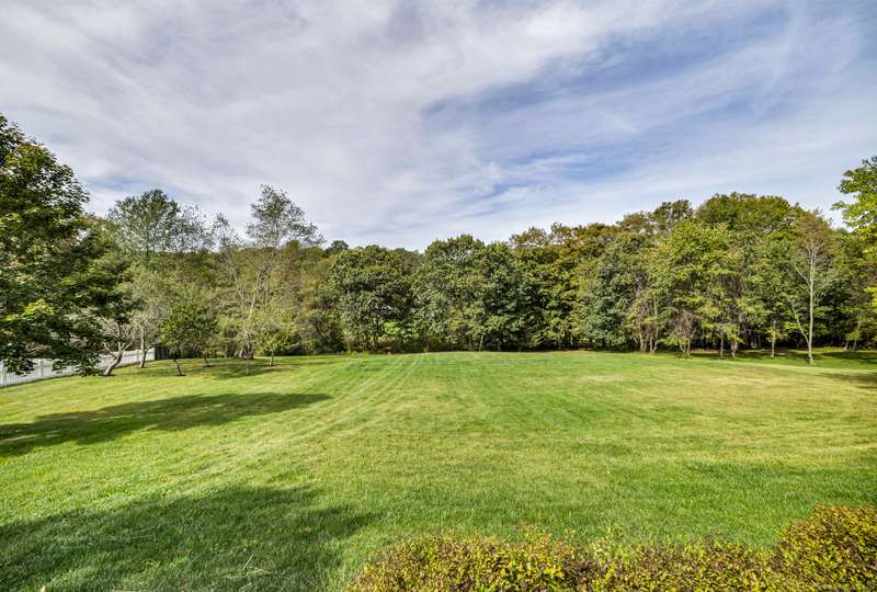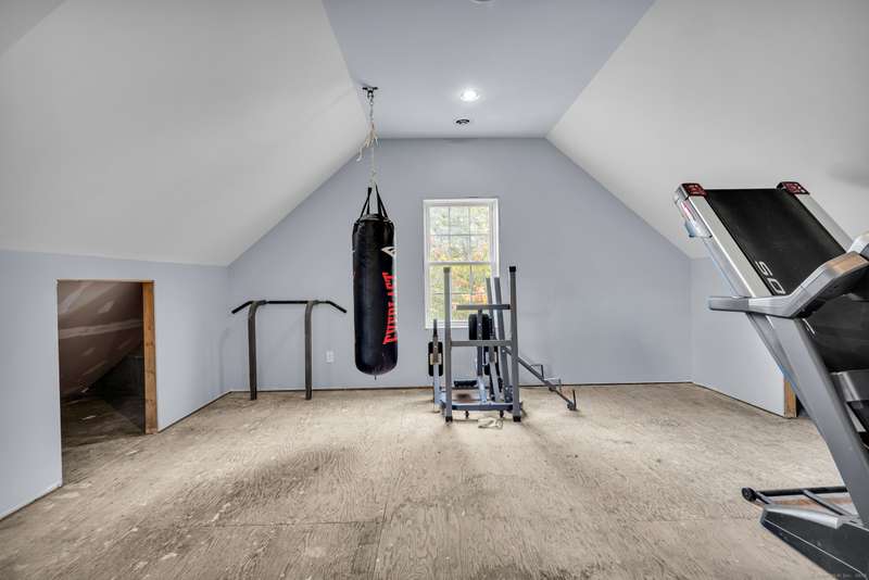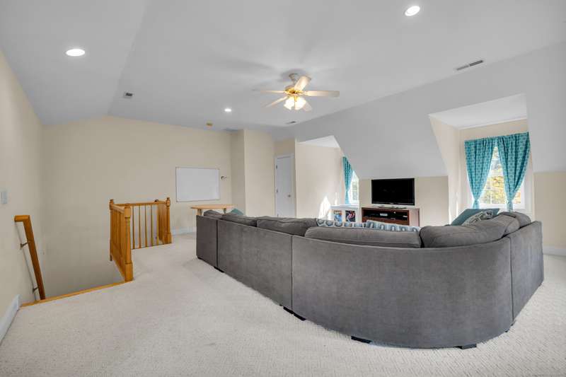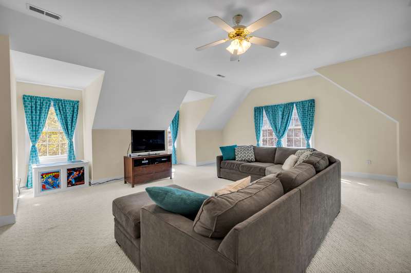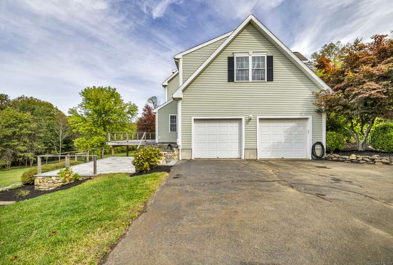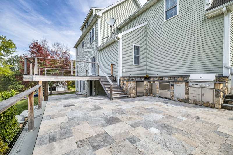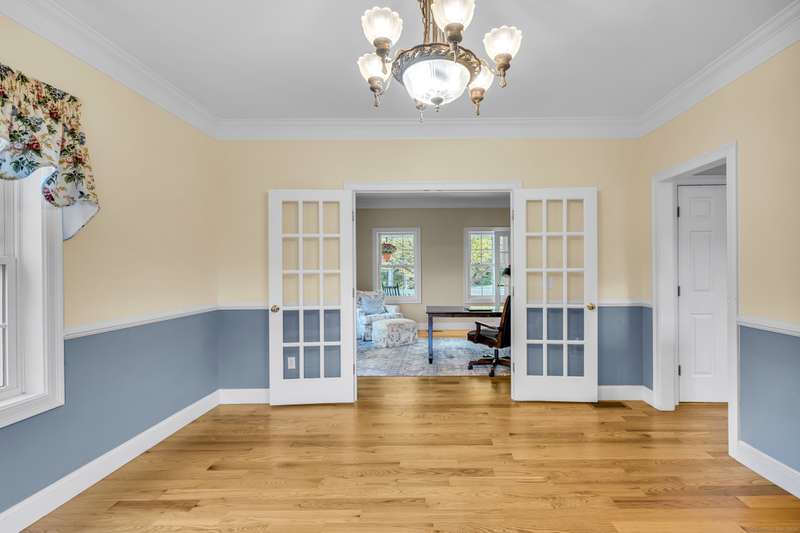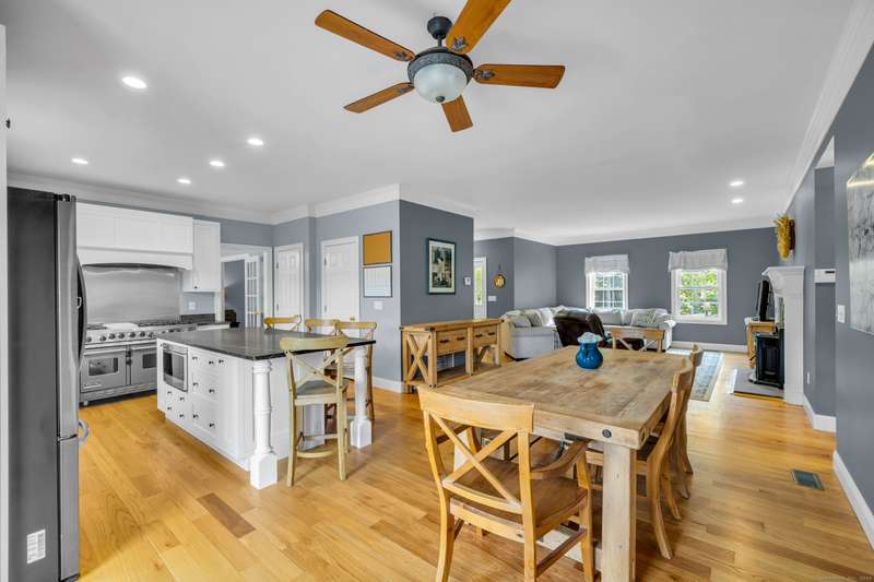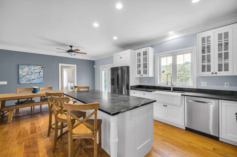 Nestled on a serene 2.19-acre lot at the end of a cul-de-sac on a private road, this Colonial is flanked by similar homes, offering a peaceful and picturesque setting. Featuring 4 bedrooms and 3.5 baths across three finished levels. A circular driveway and paver walkway lead to a charming covered front porch; perfect for morning coffee or welcoming guests. Inside, the foyer opens to a living room with a wood-burning fireplace and stone surround, flowing into the dining area and kitchen. The light-filled kitchen features custom Crystal Cabinet Works soft-close cabinetry, soapstone countertops, stainless steel appliances, including a Viking Professional double oven with 6-burner cook-top, and a center island. Additional main-level highlights include a dedicated home office, formal dining room with French doors, powder room, and laundry room. A secondary staircase leads to a versatile bonus room; perfect for a second office, guest space, or recreation area. Upstairs, the master bedroom in