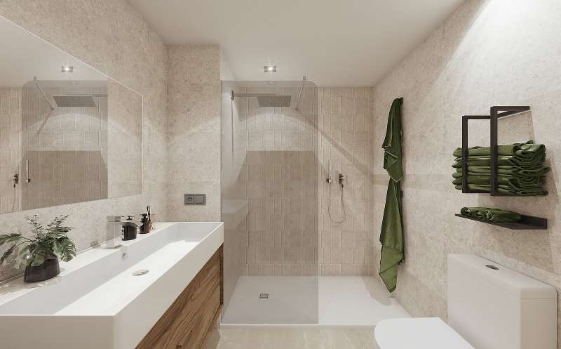 Inside the apartments are bright and contemporary, with open-plan layouts and large windows ensuring natural light throughout. Porcelain flooring in soft sand tones continues seamlessly from the interiors to the terraces. Kitchens are fitted with sleek cabinetry in oak and white, Silestone worktops and Bosch appliances, while bathrooms feature elegant oak-finished units, flush shower trays and high-quality fittings by Jacob Delafon. Energy efficiency is a hallmark, with aerothermal hot water systems, ducted hot and cold air conditioning, mechanical ventilation, and a community photovoltaic installation contributing to an A energy rating. The modern design, together with thoughtful details such as fitted wardrobes, LED lighting, and fibre-optic cabling, creates a stylish and practical home for year-round living.