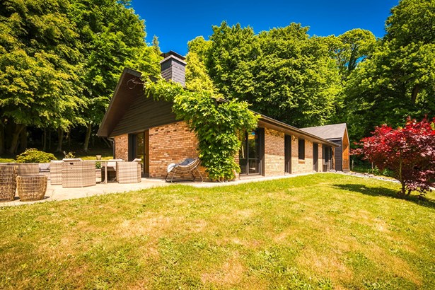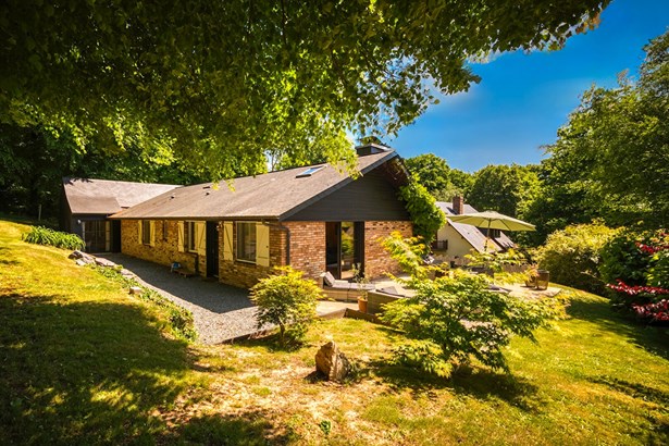 The rock garden bordering the gravel driveway enhances the elevated position of the house while maintaining a natural look that aligns perfectly with the wooded and preserved character of the surroundings.