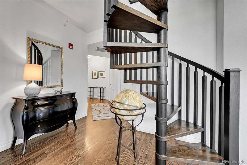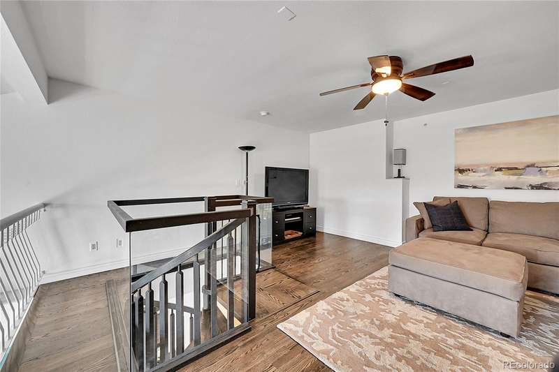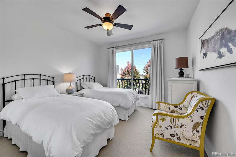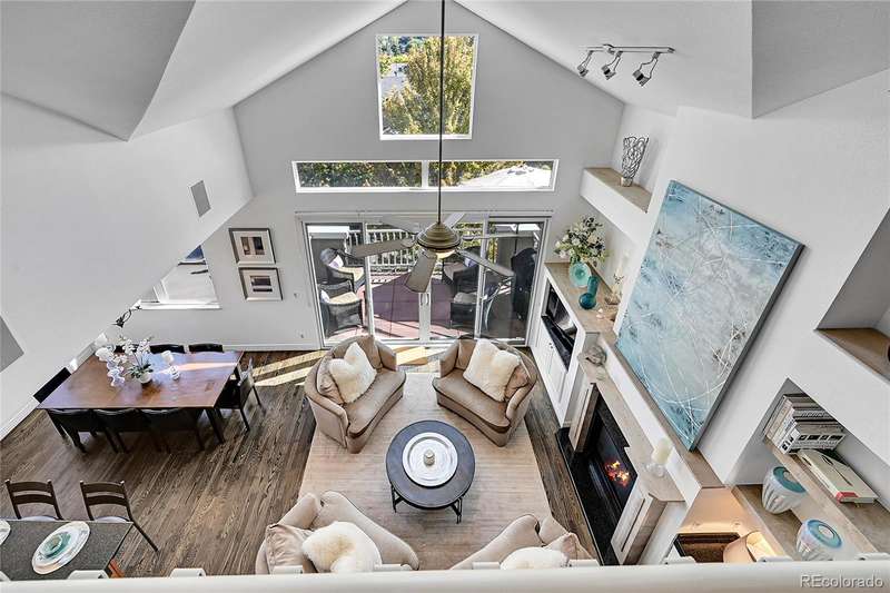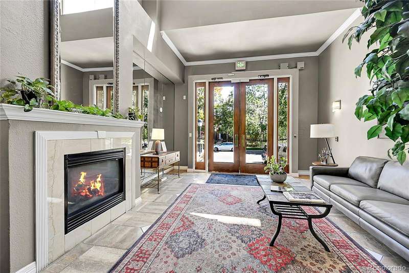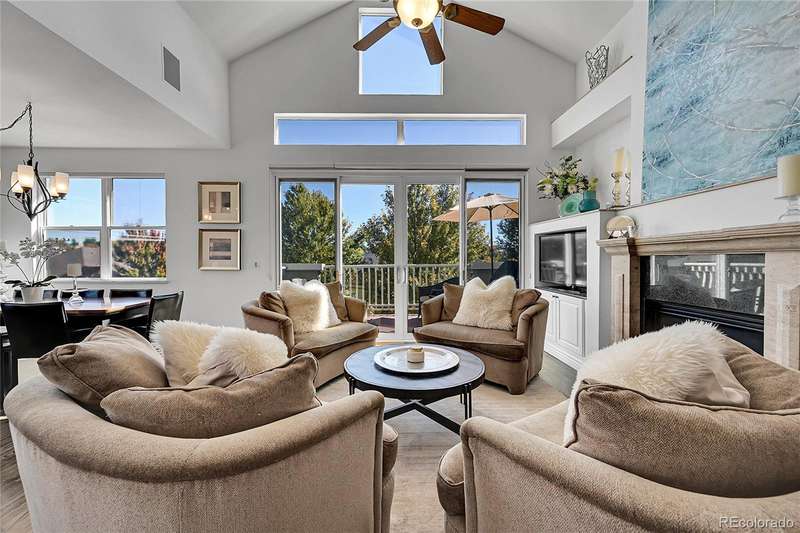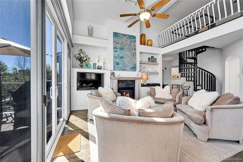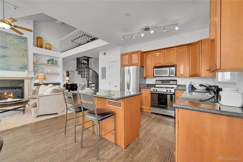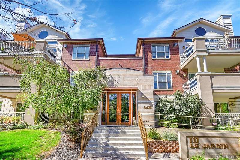 This exceptional top floor condominium situated in the prestigious Le Jardin complex in Cherry Creek presents a remarkable opportunity for discerning buyers. Offering 2 well-appointed bedrooms and 2 bathrooms plus a loft overlooking the living room within 1,545 square feet, this residence combines elegance with modern living. The expansive living room features a high vaulted ceiling, hardwood floors, with superb natural light, creating an inviting environment. The kitchen, equipped with stainless steel appliances and dark stone countertops, flows seamlessly into the dining area, perfect for both casual and formal dining experiences. The primary bedroom suite boasts an ensuite bathroom with a double vanity and luxurious shower with custom built in cabinetry in the closet area. Residents can enjoy a private balcony, ideal for outdoor dining or relaxation while overlooking wooded views of the neighborhood and skyline. The property includes 2 deeded parking spaces in the private garage, ensuring convenience in urban settings. The community offers a host of amenities, including a fitness center and beautifully landscaped outdoor spaces, enhancing your living experience. Located in the vibrant Cherry Creek neighborhood, this property offers easy access to up-scale shopping, dining, and recreational activities, making it an ideal choice for those seeking a sophisticated urban lifestyle. These coveted top floor corner condominiums rarely come on the market, don't wait to set up your private tour!