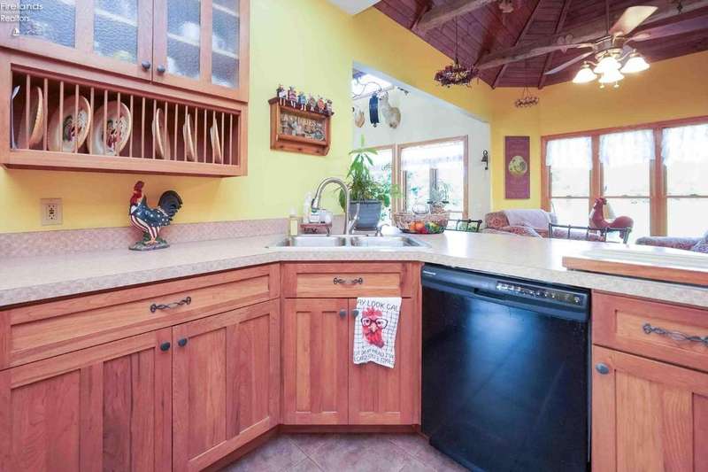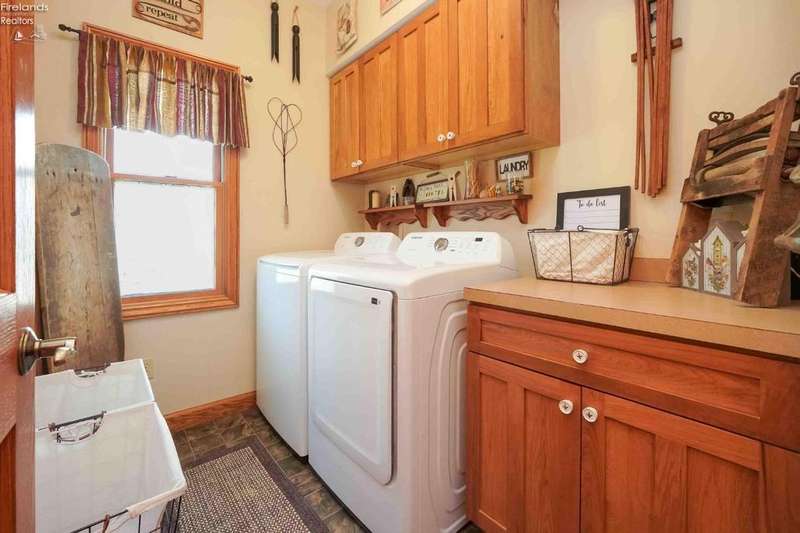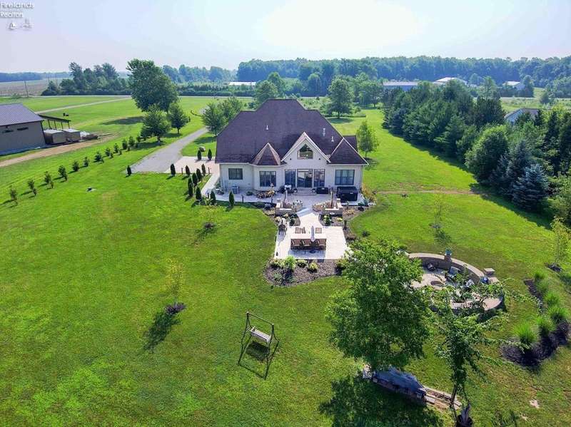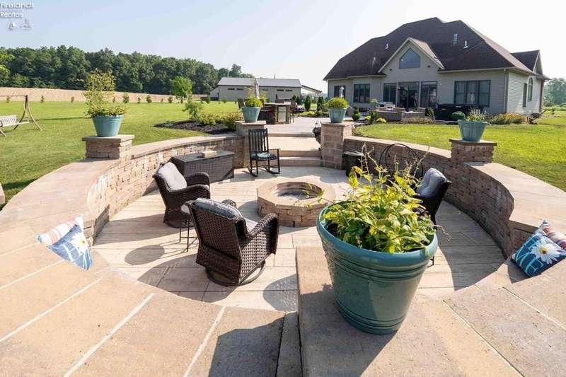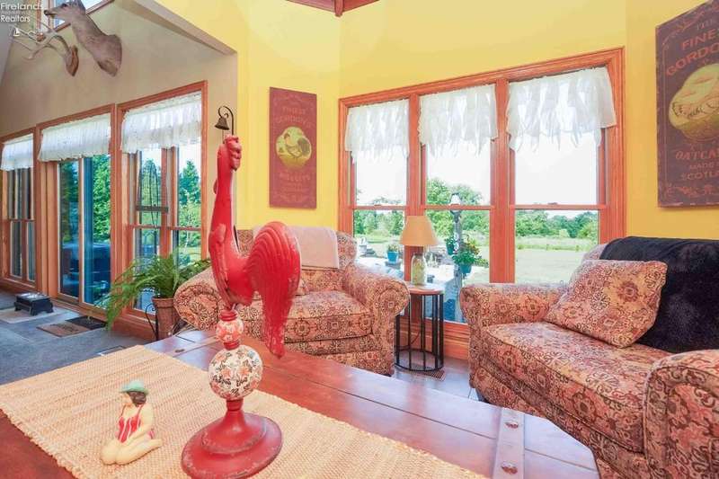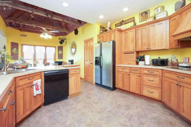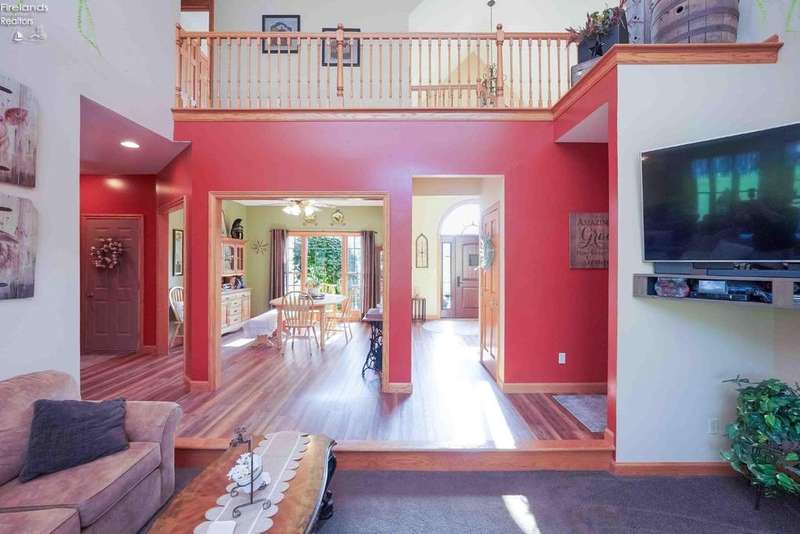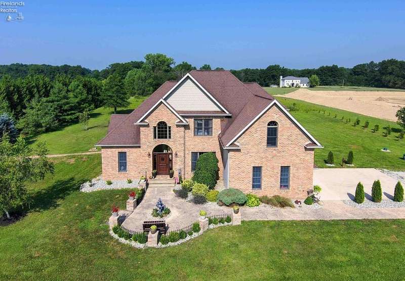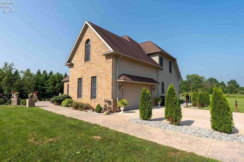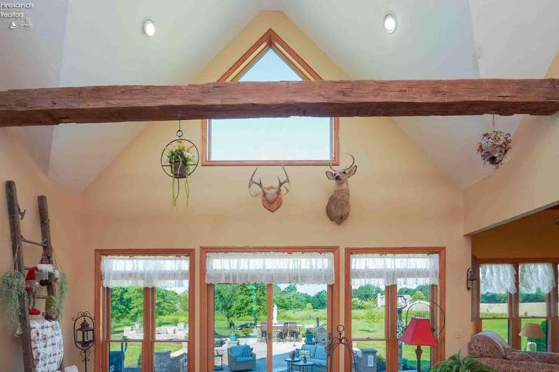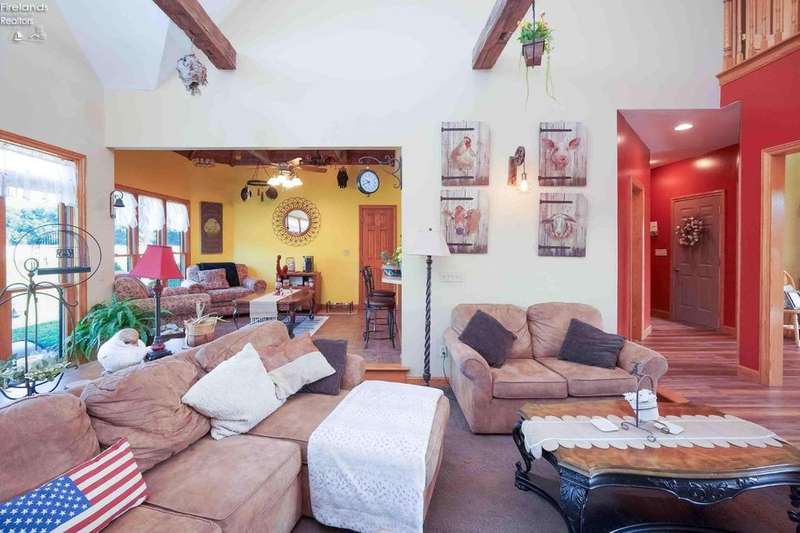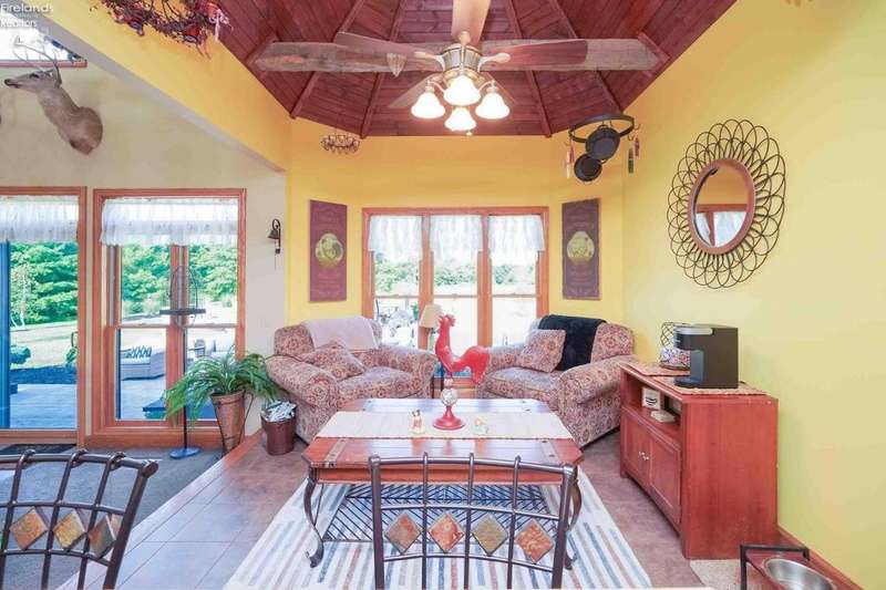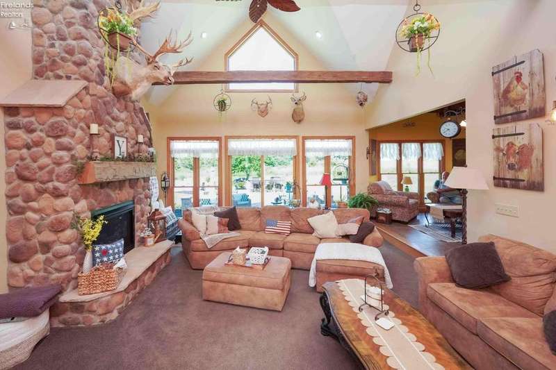 Escape to your own private retreat with this stunning country home, perfectly situated on 5 sprawling acres. Boasting 4 (possibly 5) bedrooms and 3 full bathrooms, this residence offers a harmonious blend of comfort, elegance, and rustic charm. From the moment you arrive, you'll be captivated by serene surroundings and a promise of a life in harmony with nature. The heart of this home is undoubtedly the main living area, where you'll find the luxurious master suite that features a tray ceiling with can lighting, double windows looking out onto the wooded backyard which add a touch of whimsy and warmth. The en suite bathroom is a true oasis, complete with relaxing soaking tub, a separate shower, double sinks, cathedral ceiling and a spacious walking in closet. The open floor plan seamlessly connects the living spaces all together. The sink in living room is a focal point, with its floor to ceiling windows offering breath-taking views. The stone gas fireplace provides a cozy ambience, while its decorative wooden beam and cathedral ceiling add architectural interest. Newly added to the vaulted ceiling in the Kitchen nook area is a tong and groove wooden planks ceiling which gives the area a cozy and inviting space and a touch of elegance. Completing the main level are a laundry room and additional full bath and a second bedroom. Venture outside and immerse yourself in the beauty of the surrounding landscape. Newly stamped and colored concrete walkways lead you to a new large patio that features a hot tub area, wet bar area and a sink in fire pit area with built in sitting. Patio area was recently constructed with nothing untouched. This area is an outdoor paradise for entertaining or just relaxing and watching the ever changing sky or nature. Additional features include scalloped siding on peak, six panel solid wood doors, all appliances remaining, 1st floor laundry, stunning lighting outside around home and 9ft basement ceilings. This home truly has it all!!!