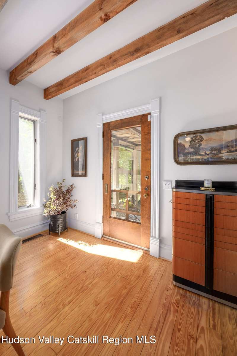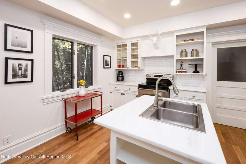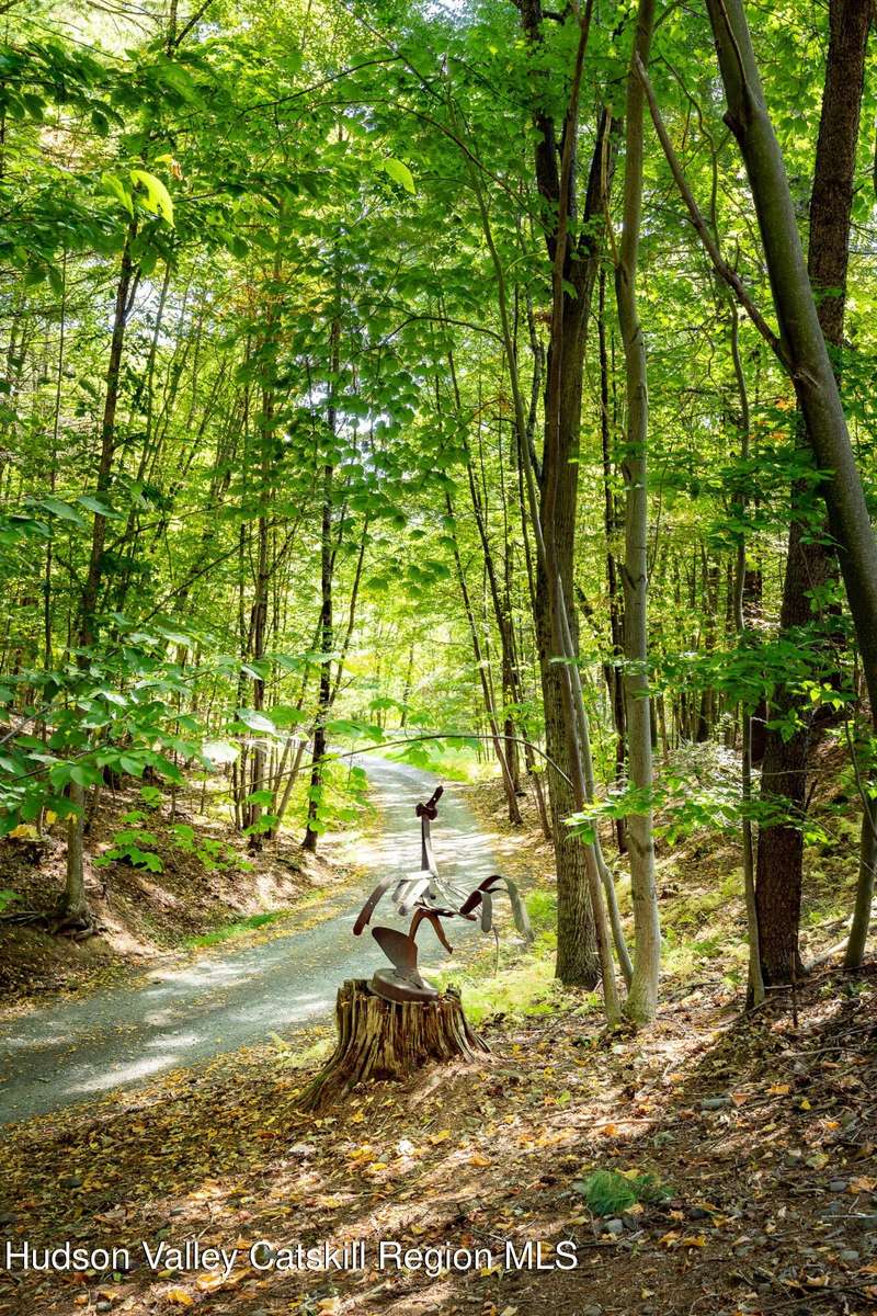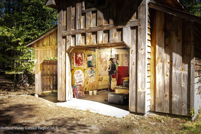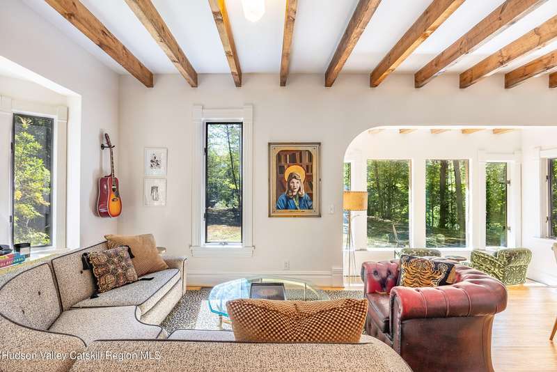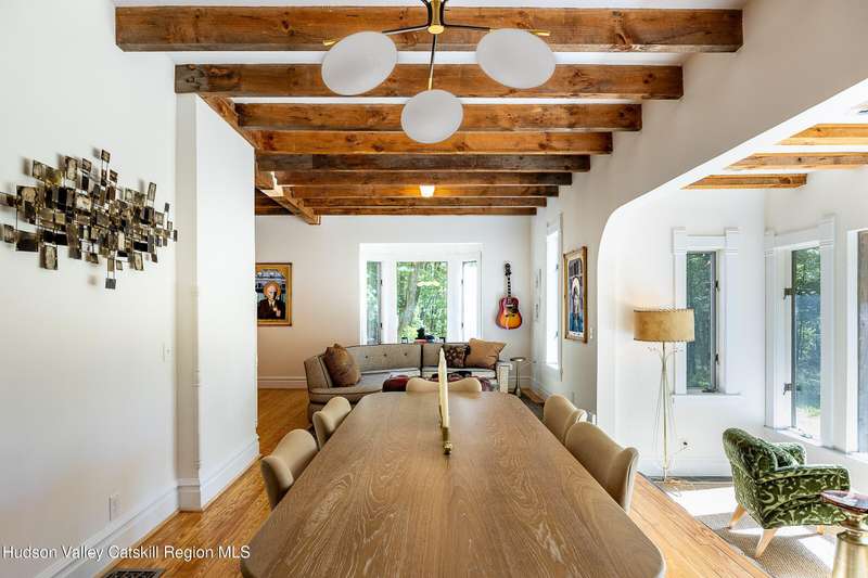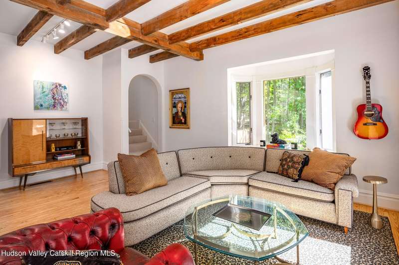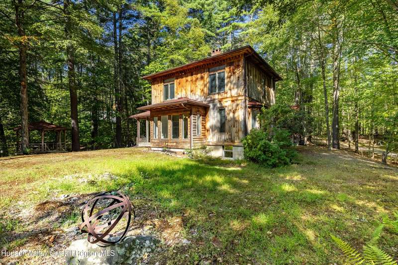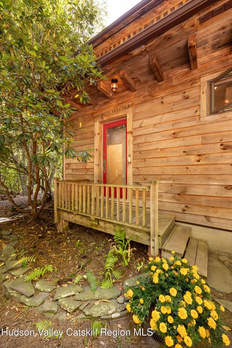 Quintessential Woodstock Contemporary tucked away on almost 4 bucolic, private acres minutes to the center of town. Perched at the end of a dead end lane on one of the areas loveliest roads is this 2 bedroom 1.5 bath home with extra flex space to expand. It is all in the details that makes this home such a delight. Hardwood floors and hand-hewn beams throughout create a timeless backdrop, Open-concept living room/ dining room with large windows bringing the natural surroundings in. Arched doorways and a sweet sitting alcove off the dining area add character and charm. Kitchen has solid wood/glass mullioned cabinets, marble countertops and stainless steel appliances offering the perfect blend of modern and retro. Half bath off the kitchen with ample room to expand off the mudroom if desired. Upper level has two gracious bedrooms and bathroom with space to reconfigure if you wish. Lower floor flex room with gracious laundry room ideal to add another full bathroom. This home is sweet just as it is but has space to be reimagined. The surrounding land is completely private, surrounded by old growth pines and open, sunny clearings perfect for a pool. Inviting gazebo overlooking neighboring spring fed pond for al fresco dining and taking in the natural, Catskill Mountain beauty. Detached, two-level 300 sq ft garage is currently being used as an art studio but could be converted to an all season office, studio, or an ADU. Per the Town rules as it is 3 acre zoning, this property is compatible with an additional living space being permitted. Whether you convert garage or build another structure, it is rare to have the acreage allowable for a legal ADU. Property abuts neighboring Angus Lane. There is ample space on the property to build an ADU to maintain autonomy for both homes or using existing garage to create a compound feel. This ideally located property is steps to Woodstock's best walking road to the majestic Cooper Lake, a few minute drive to the center of Woodstock to tap into all the creative community has to offer and a perfect base for all things in he Hudson Valley. Catch a. show at Levon's Barn or the Bearsville Theater and The Colony, have a great meal at Oriole 9, Silvia, Red Onion or one of the many eateries in town, walk the historic Byrdcliffe Arts Colony that still hosts artist residences every summer. The expansive Rail Trail and extensive hiking trails are all a stone's throw away. This property is under 30 minutes to Belleayre Ski area, Inness Resort and Arrowood Brewery, offering an outdoor venue with shows and festivals all summer. Wander Kingston's Stockade District with its lovely architecture, galleries, shops and eateries. Head to Camp Kingston for lunch, coffee, pinball and collective workspace, Rough Draft for books, libations and a cozy workspace and Rosies on the waterfront for eclectic eats. The UPAC offers a. historic venue with world- renowned shows all year round and the Hutton Brickyards has been reimagined into a beautiful, outdoor venue that hosts Field + Supply, music and arts festivals with Kingston's Greenline walking trail and over 500 acres of protected land by the Hudson River. This home offers the perfect balance of a serene upstate getaway yet close to all the Hudson Valley has to offer. It is rare to find such a private, quiet setting minutes to everything. A home ready to enjoy and begin to create your own Catskill retreat.