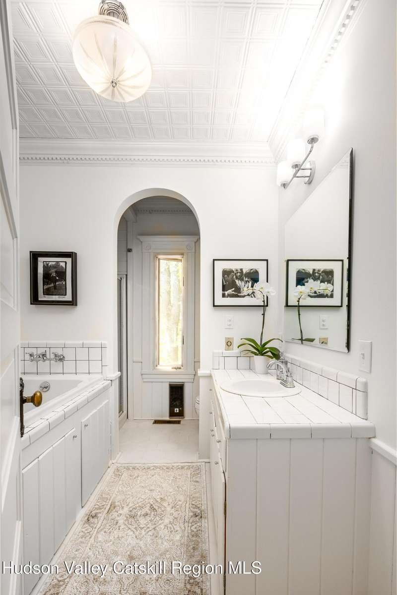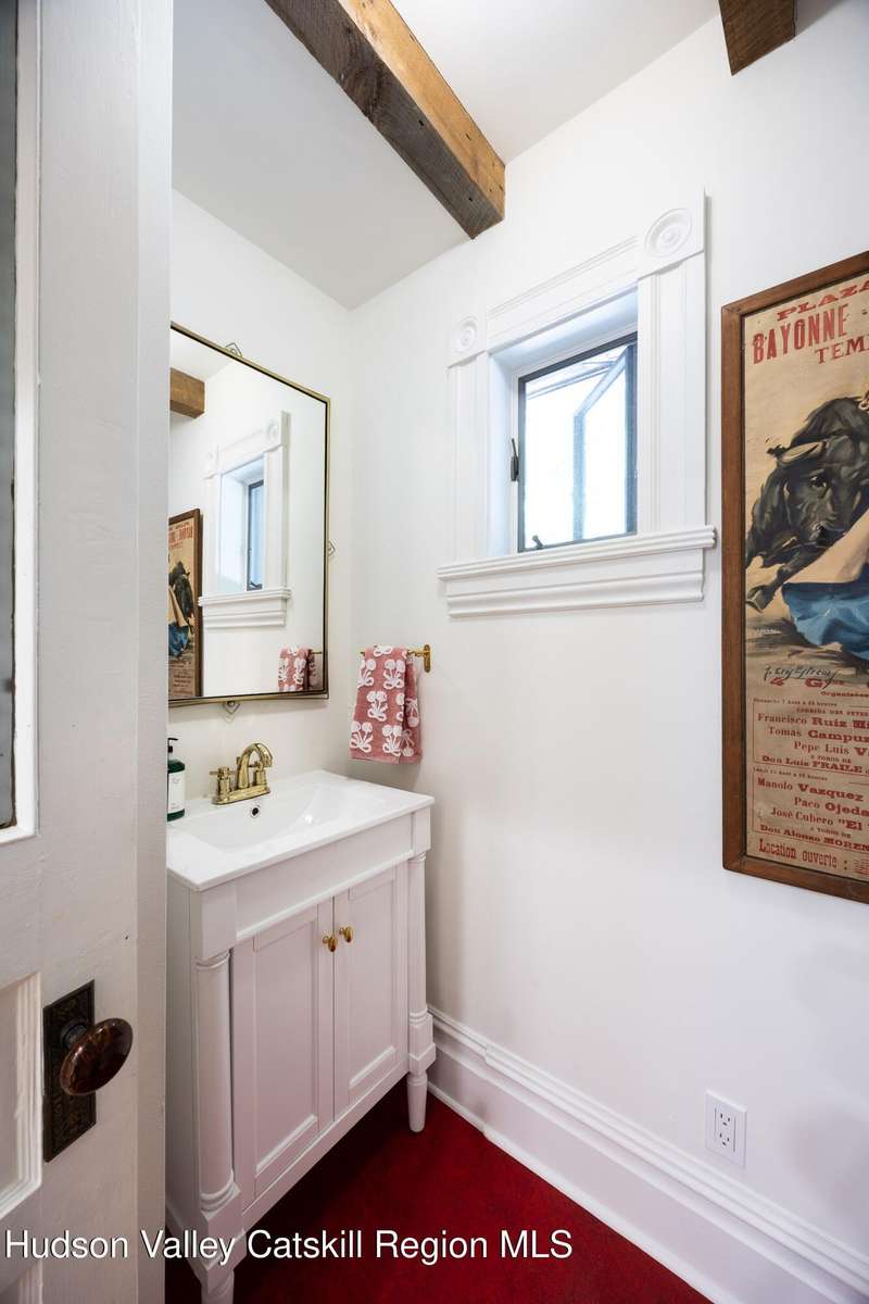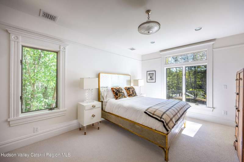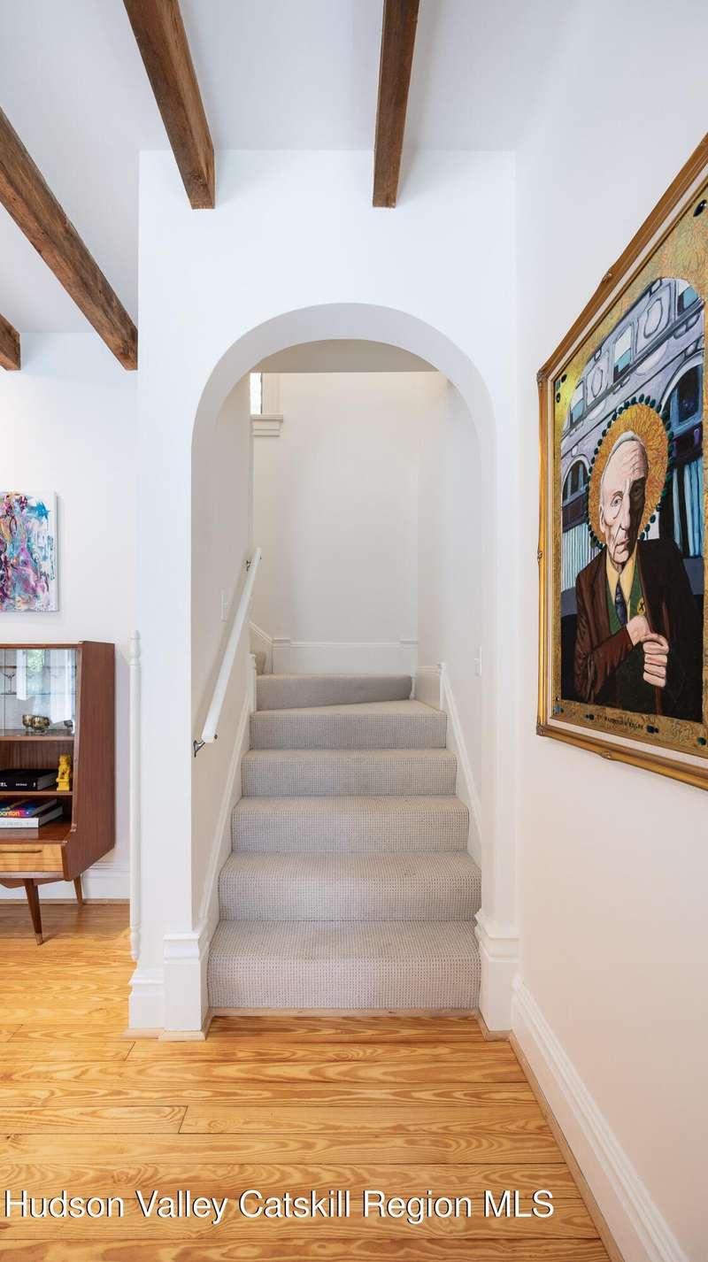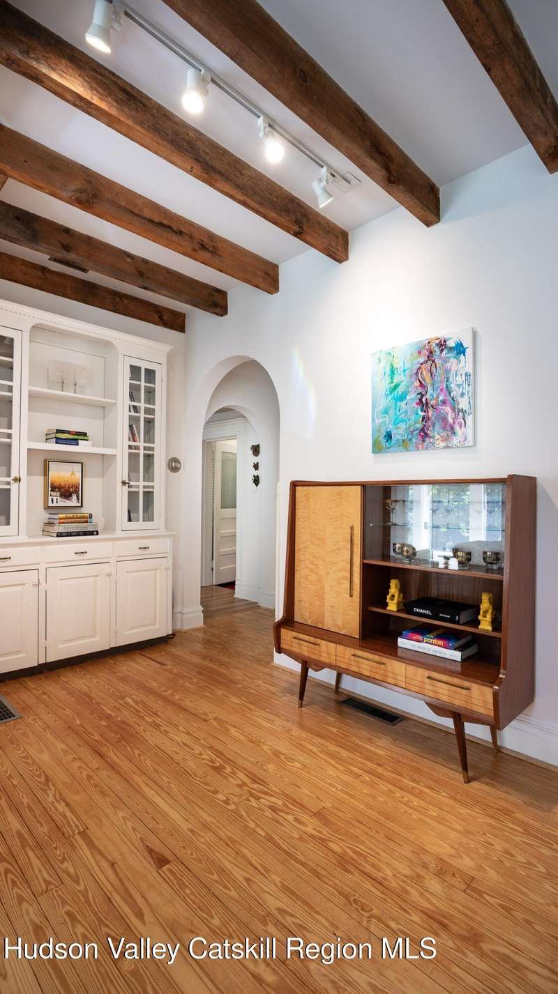 Quintessential Woodstock Contemporary tucked away on almost 4 bucolic, private acres minutes to the center of town. Perched at the end of a dead end lane on one of the areas loveliest roads is this 2 bedroom 1.5 bath home with extra flex space to expand. It is all in the details that makes this home such a delight. Hardwood floors and hand-hewn beams throughout create a timeless backdrop, Open-concept living room/ dining room with large windows bringing the natural surroundings in. Arched doorways and a sweet sitting alcove off the dining area add character and charm. Kitchen has solid wood/glass mullioned cabinets, marble countertops and stainless steel appliances offering the perfect blend of modern and retro. Half bath off the kitchen with ample room to expand off the mudroom if desired. Upper level has two gracious bedrooms and bathroom with space to reconfigure if you wish. Lower floor flex room with gracious laundry room ideal to add another full bathroom. This home is sweet just as it is but has space to be reimagined. The surrounding land is completely private, surrounded by old growth pines and open, sunny clearings perfect for a pool. Inviting gazebo overlooking neighboring spring fed pond for al fresco dining and taking in the natural, Catskill Mountain beauty. Detached, two-level 300 sq ft garage is currently being used as an art studio but could be converted to an all season office, studio, or an ADU. Per the Town rules as it is 3 acre zoning, this property is compatible with an additional living space being permitted. Whether you convert garage or build another structure, it is rare to have the acreage allowable for a legal ADU. Property abuts neighboring Angus Lane. There is ample space on the property to build an ADU to maintain autonomy for both homes or using existing garage to create a compound feel. This ideally located property is steps to Woodstock's best walking road to the majestic Cooper Lake, a few minute drive to the center of Woodstock to tap into all the creative community has to offer and a perfect base for all things in he Hudson Valley. Catch a. show at Levon's Barn or the Bearsville Theater and The Colony, have a great meal at Oriole 9, Silvia, Red Onion or one of the many eateries in town, walk the historic Byrdcliffe Arts Colony that still hosts artist residences every summer. The expansive Rail Trail and extensive hiking trails are all a stone's throw away. This property is under 30 minutes to Belleayre Ski area, Inness Resort and Arrowood Brewery, offering an outdoor venue with shows and festivals all summer. Wander Kingston's Stockade District with its lovely architecture, galleries, shops and eateries. Head to Camp Kingston for lunch, coffee, pinball and collective workspace, Rough Draft for books, libations and a cozy workspace and Rosies on the waterfront for eclectic eats. The UPAC offers a. historic venue with world- renowned shows all year round and the Hutton Brickyards has been reimagined into a beautiful, outdoor venue that hosts Field + Supply, music and arts festivals with Kingston's Greenline walking trail and over 500 acres of protected land by the Hudson River. This home offers the perfect balance of a serene upstate getaway yet close to all the Hudson Valley has to offer. It is rare to find such a private, quiet setting minutes to everything. A home ready to enjoy and begin to create your own Catskill retreat.