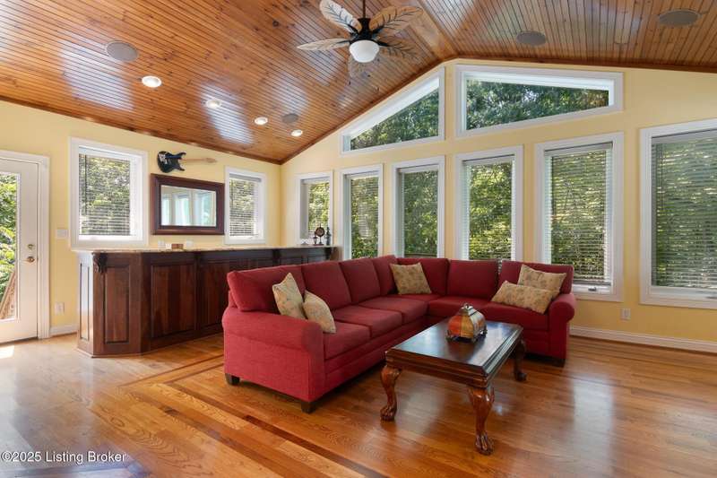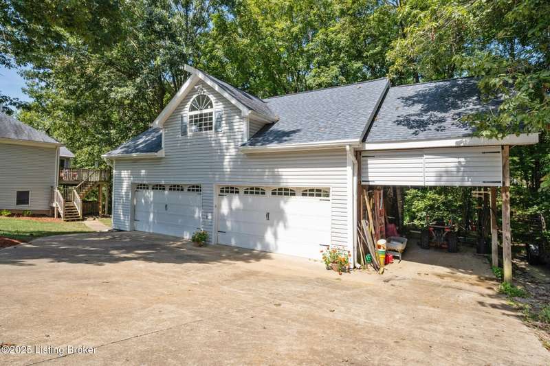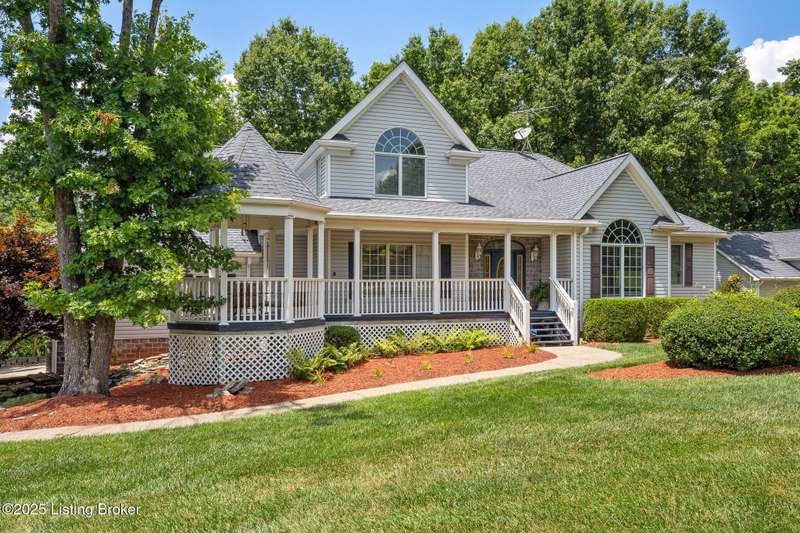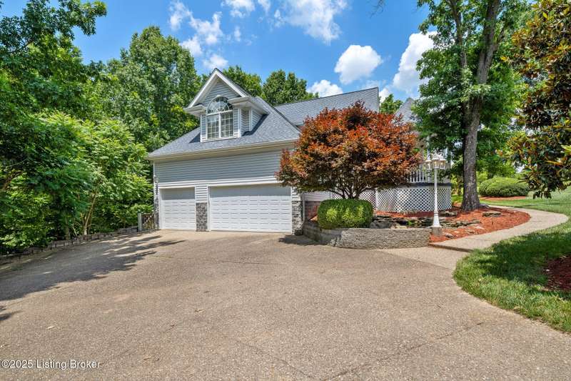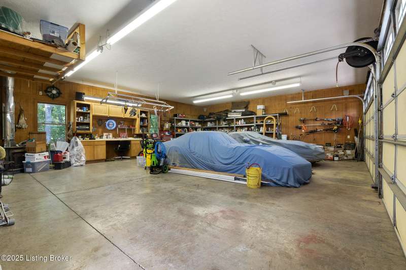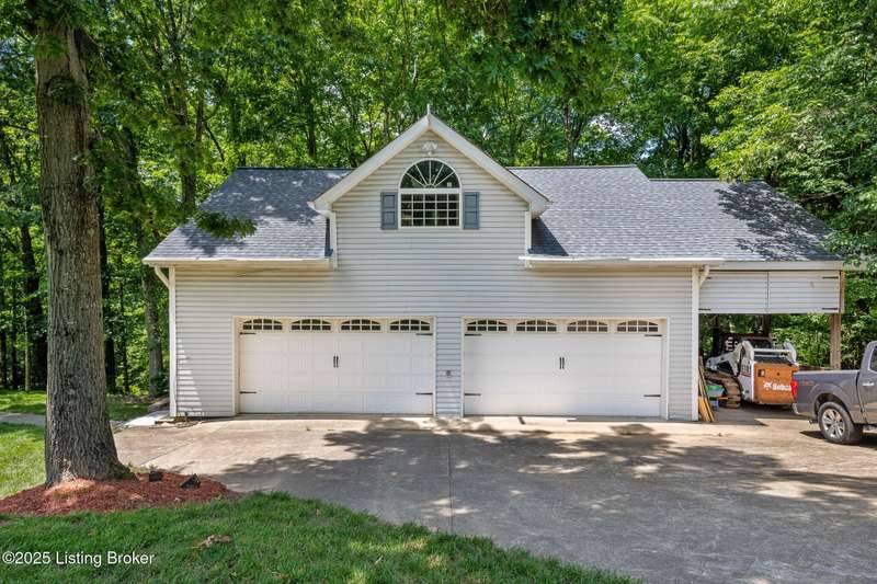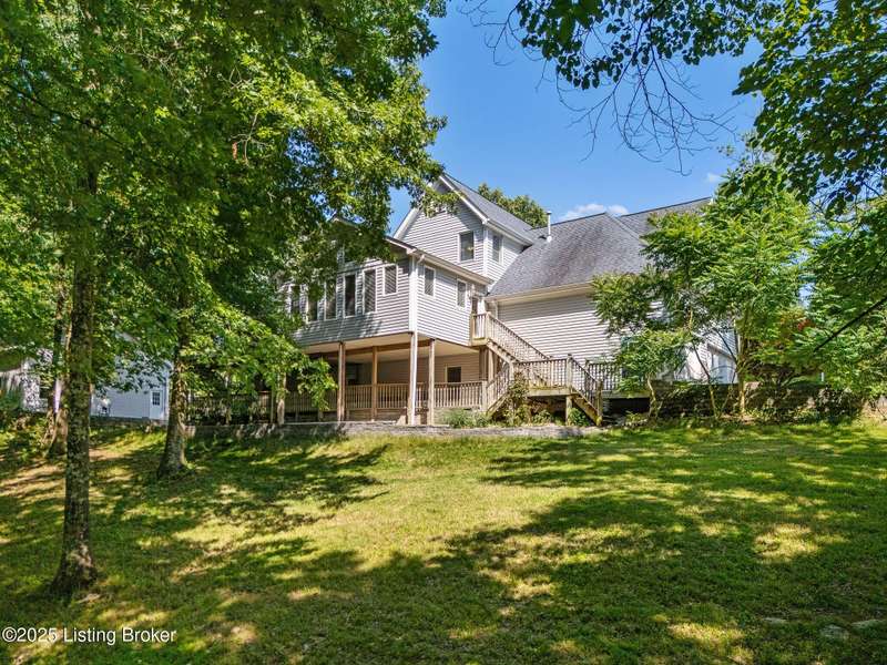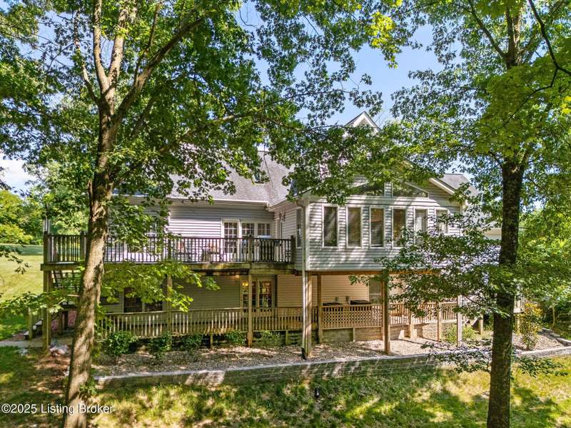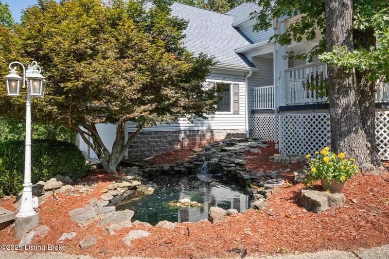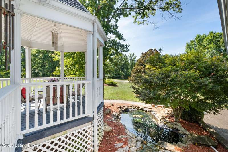 What a Spread! 4.5 Acres of Privacy and Possibility in Fisherville Woods. Room to breathe, room to live—this exciting custom-built home sits on 4.5 acres backing to trees in the sought-after 43-lot neighborhood, where streets curve with the hills and tree lines. You're just minutes from Pope Lick and Beckley Parks, but you'll feel a world away. Car lovers and hobbyists—take note. In addition to the attached 3-car garage with high ceilings, there's a 4-car detached garage/barn, with a covered extension, workshop, 200-amp service, seasonal half bath, natural light and 10-foot ceilings, ready for a car lift, or even your own private ''Top Golf.'' Buck stove and compressor remain. Welcome friends from the home's covered front porch and gazebo overlooking the waterfall pond. Guests flow easily from the foyer through the great room to the kitchen area and Florida room/den and out to the deck. Host holidays and family get togethers in the dining room with the wall of windows looking out to the front porch. The main level includes the spacious primary suite, home office, and flexible guest bath with shower that doubles as a second primary bath. With front and back stairs, the ingenious floor plan offers both open and private spaces. Enjoy multiple levels of living space with 9-foot ceilings on the first floor and lower level. Up the grand staircase, the loft above the two-story great room is ideal for study, music or reading and is close by the upstairs bedrooms and bath. A few steps down the back stairs, you'll find the bonus room, perfect as a second office, playroom, or bedroom. The back stairs lead to the garage access and the first-floor laundry room by the kitchen. The lower level, with large windows, houses a bedroom perfect for guests or teens, full bath, and wide open 35' by 18' rec/entertainment room walking out to the patio that runs the length of the home and accesses the walkway to the outbuilding. The larger of the two organized storage rooms walks up to the garage. This home was crafted with care by the owner/builder with 2x6 exterior walls with blown-in insulation, warranted Alcoa siding, 44 aluminum-clad casement windows and doors, rich moldings, solid oak flooring with walnut inlays on the main level, and solid cherry Vittitow cabinetry throughout, including a 12' bar in the Florida room/den. Dual heating and A/C units were installed in 2023 with 10-year transferable parts warranty add peace of mind. This is more than a home, it's a lifestyle!
