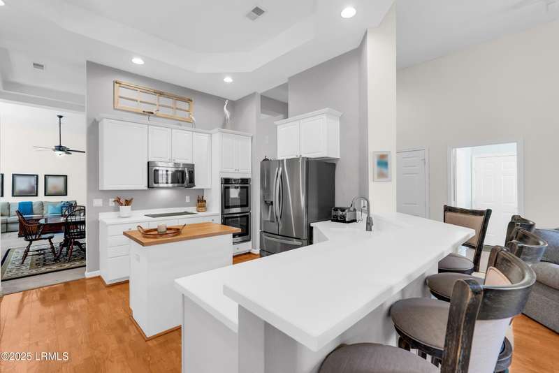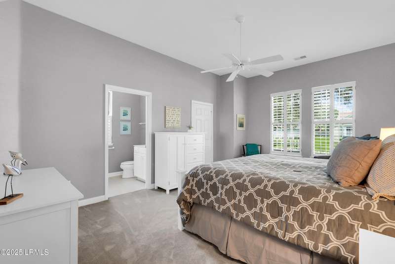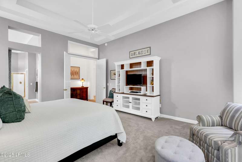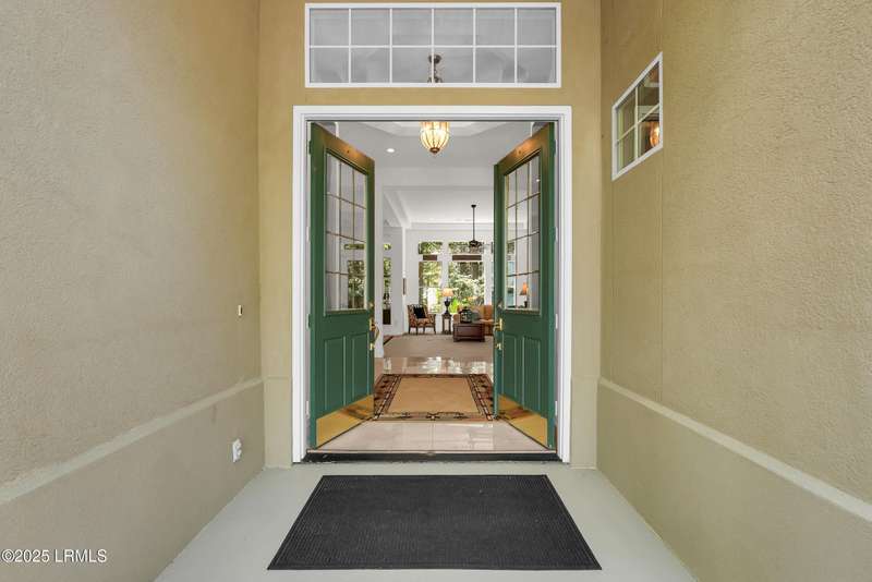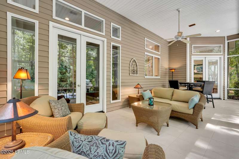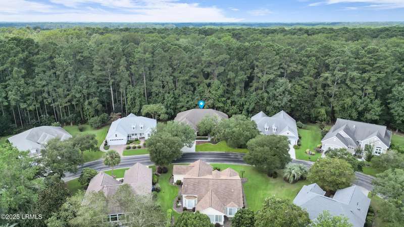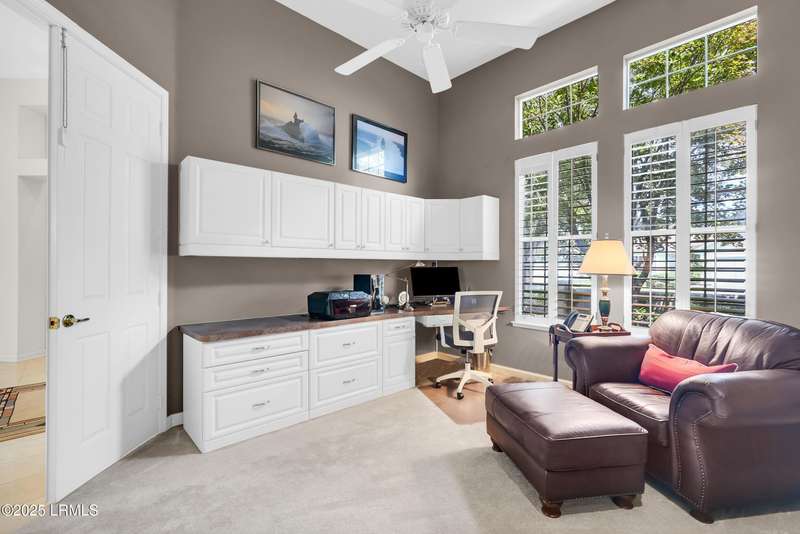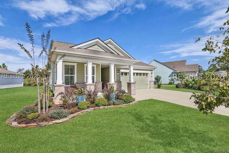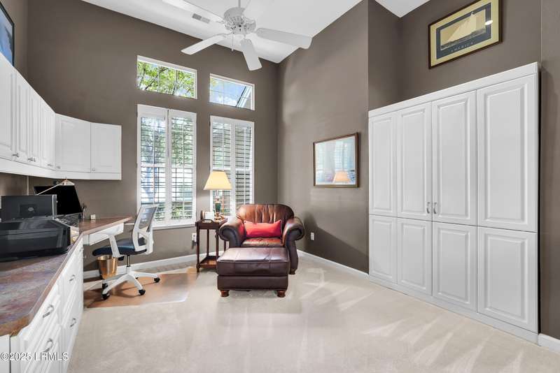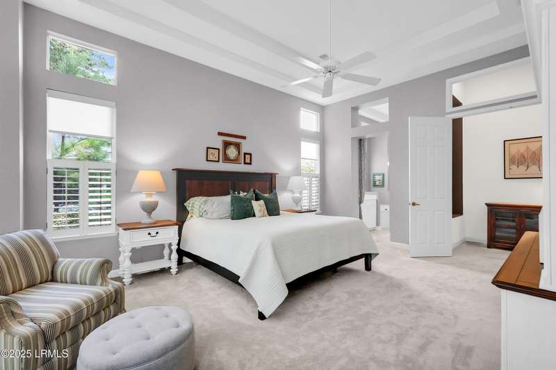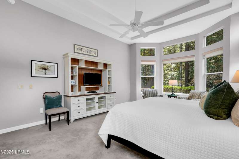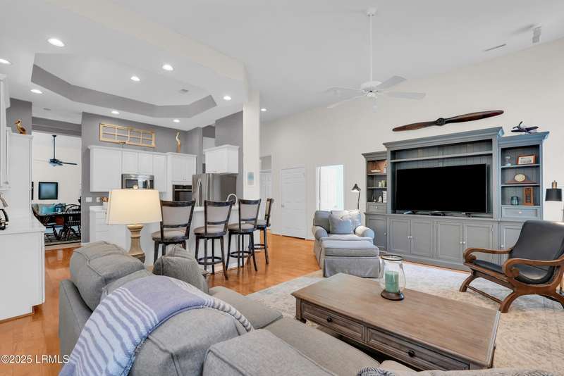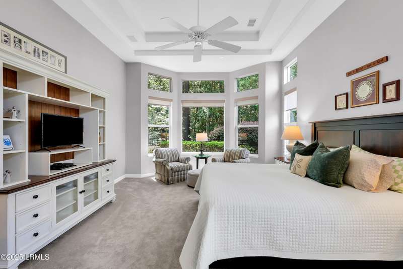 Located on a tranquil court in Sun City Hilton Head lies a rare and refined Del Webb Marion Webster Estate Model-a one story home showcasing soaring 12 foot ceilings and is enveloped by a serene wooded view. The expansive layout encompasses 2 bedrooms, 2.5 bathrooms and includes a versatile den/office/library thoughtfully equipped with a Murphy bed, offering the option of a third bedroom. This home includes two living rooms, one is equipped with built ins and a cozy fireplace. Other upgrades include a new A/C, two car garage PLUS golf cart garage, a spacious primary suite w/a closet equipped with custom shelving & an expanded screen lanai which is the perfect space to unwind while admiring views of the water fountain and secluded woods. There are too many upgrades to list, this home is a