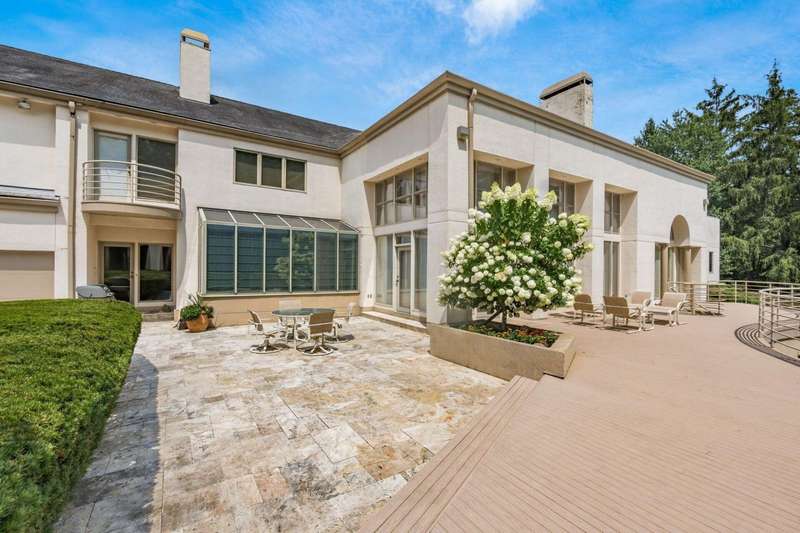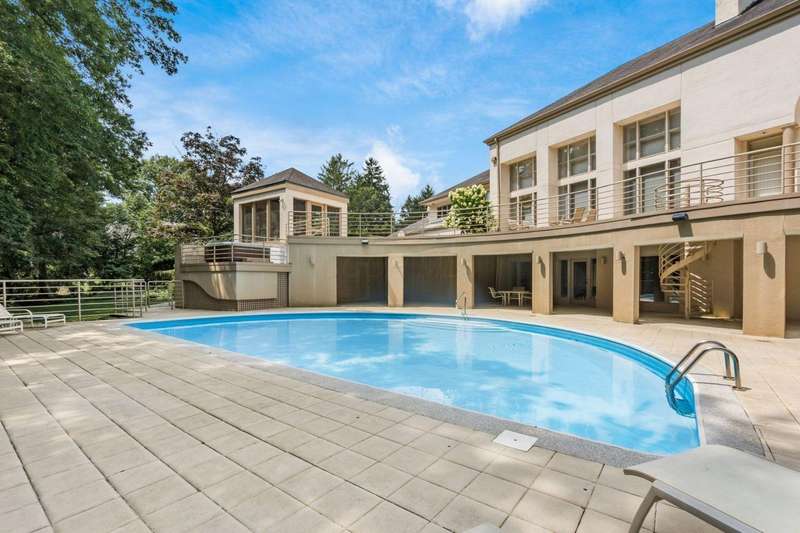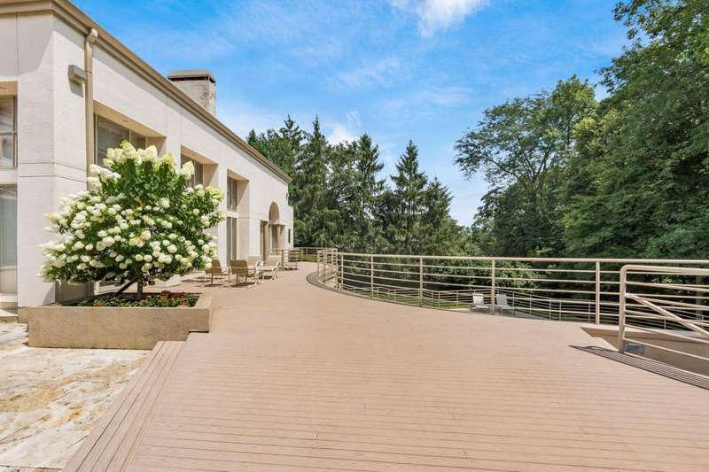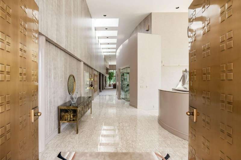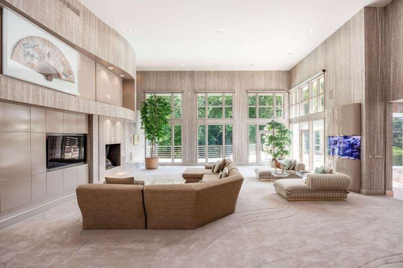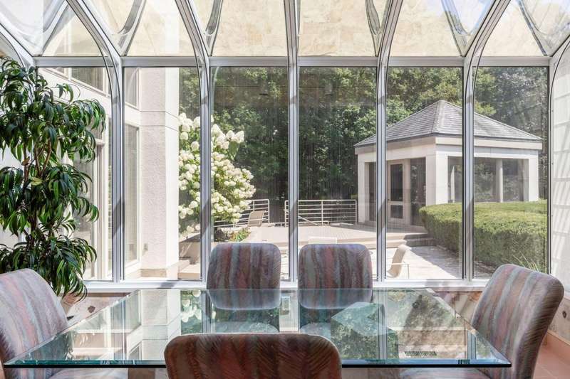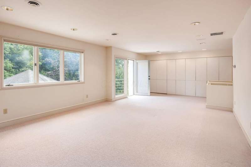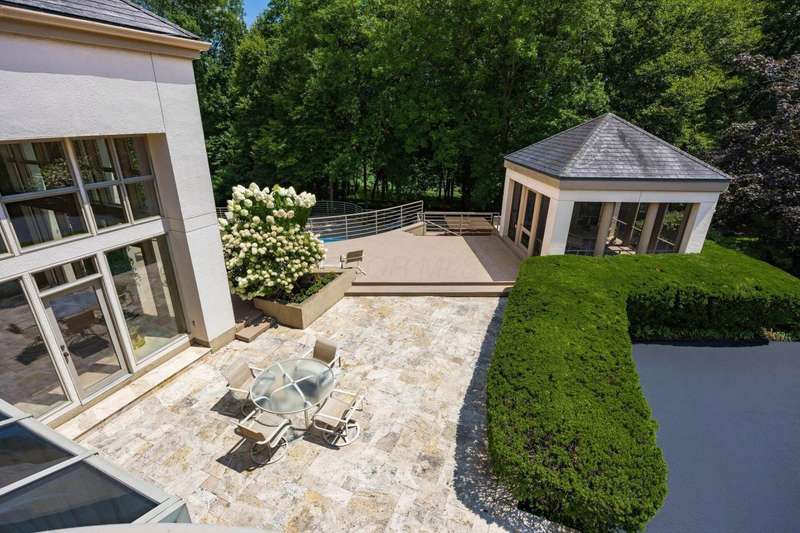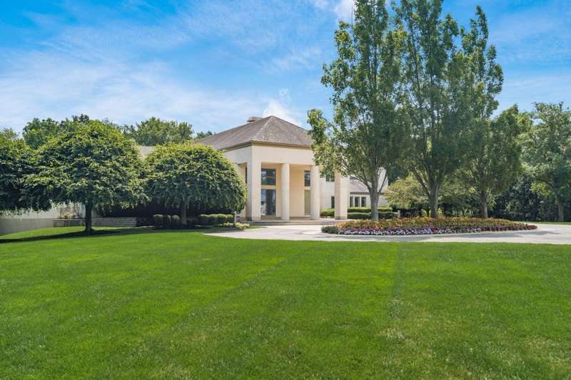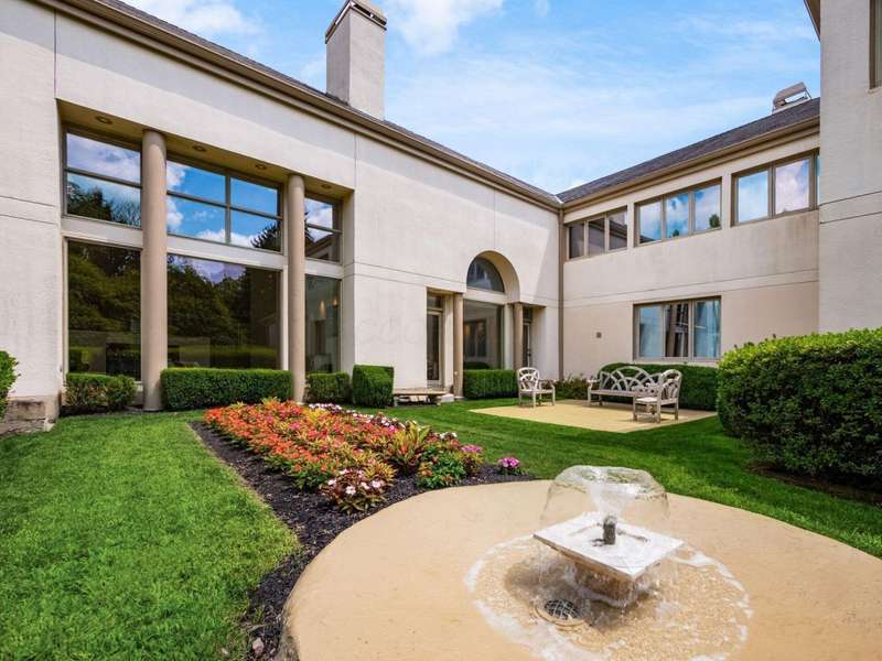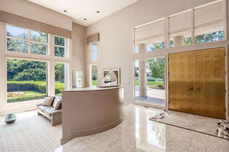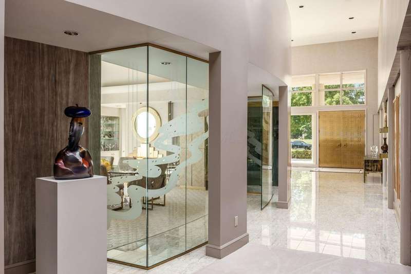 Proudly offered by the original owner, this architecturally striking home in the heart of the Estates at Muirfield Village overlooks the 5th hole of the Muirfield Village Golf Course. Offering expansive living spaces with dramatic 20-foot ceilings, floor-to-ceiling windows, sunken living room with views of a custom water feature perfectly placed outside a wall of windows and a curved marble staircase. Designed for both grand-scale entertaining and comfortable everyday living, the home features five fireplaces, a fully equipped bar, a card room, and a stunning etched-glass enclosed dining room. The great room is complete with a custom built-in saltwater aquarium. The luxurious first-floor primary suite includes a private sitting room with fireplace, a large bath, and a quiet secluded office. A private apartment on the main level includes a full kitchen, living area, bedroom, bathroom and a dedicated exterior entrance for added privacy and independence. Upstairs, four spacious bedrooms feature ensuite baths and access to a central lounge with a wet bar, creating the perfect space for guests or family to relax and unwind. The walk-out lower level is an entertainer's dream with a full bar, cabana rooms for pool guests, a billiards area, an indoor basketball or pickleball court and for Golf lovers a 6 hole putting/driving area. The lower level leads to the outdoor pool deck, screened-in gazebo and a four-car garage accessed via a motor court and the meticulously landscaped grounds.Truly a rare opportunity to own a modern estate in one of Ohio's most sought-after golf communities.