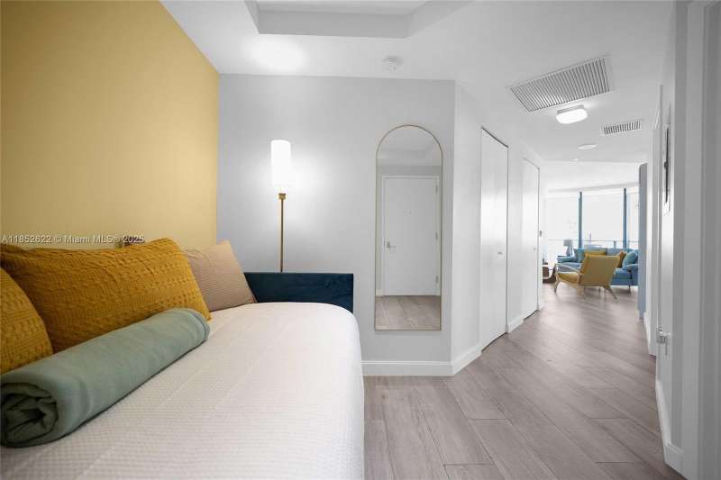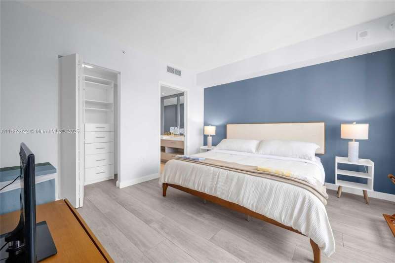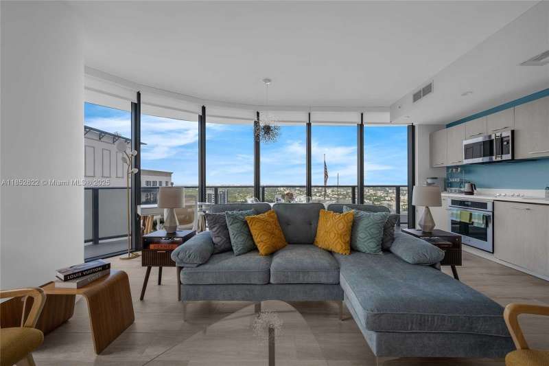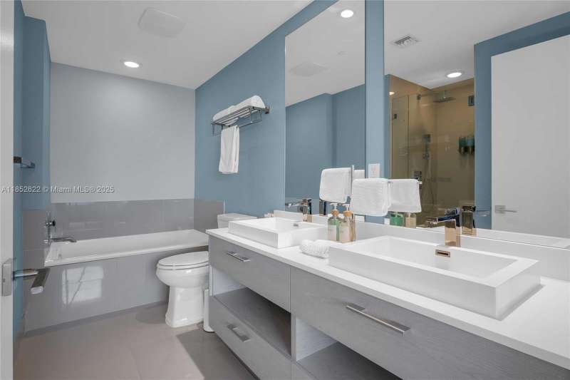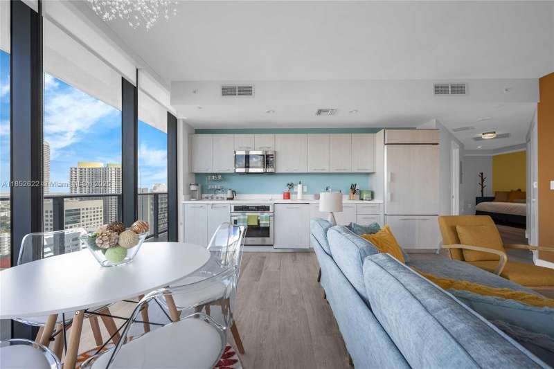 Experience stunning sunrise-to-sunset views from this fully furnished, high-floor corner residence in the heart of Brickell. This 2-bedroom + den, 2-bathroom unit offers 1,053 SF of modern living space with a spacious split floor plan, floor-to-ceiling impact windows, and wraparound balcony. Move-in ready and fully equipped — includes glassware, tableware, cookware, silverware, and all essentials. Just bring your suitcase. The primary suite features a king-size bed and a spa-style bathroom with soaking tub, walk-in shower, and double vanity. Interior highlights include European cabinetry, GE Monogram appliances, imported porcelain tile floors, and 9' ceilings. Residents enjoy resort-style amenities including a rooftop sky pool,full-service spa with sauna, steam room, and jacuzzi.