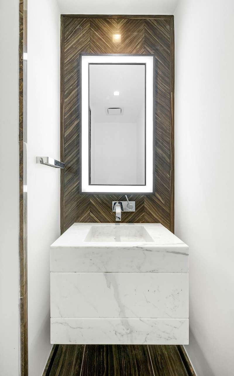 A chic powder room stuns with a sculptural ;stone vanity, carved stone sink, marble flooring, and a striking herringbone ;accent wall, making a perfect statement for guests.