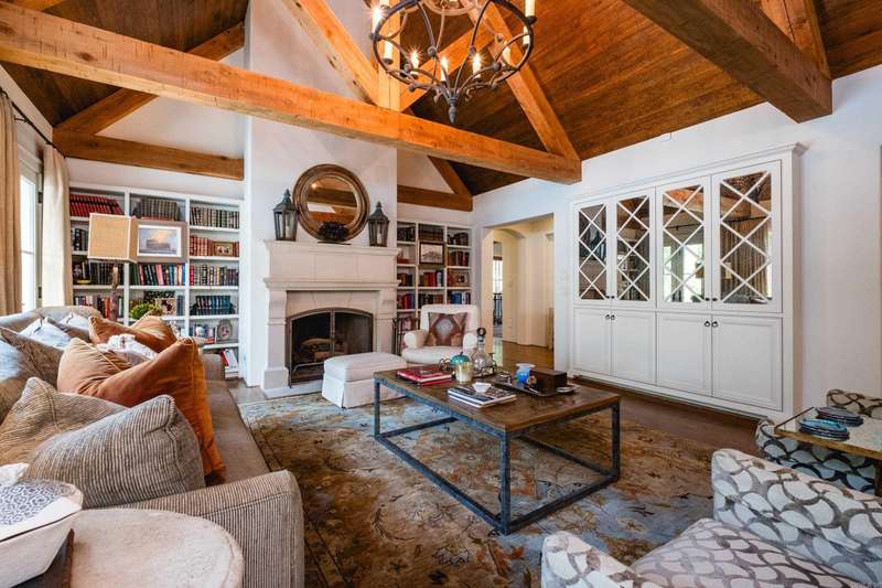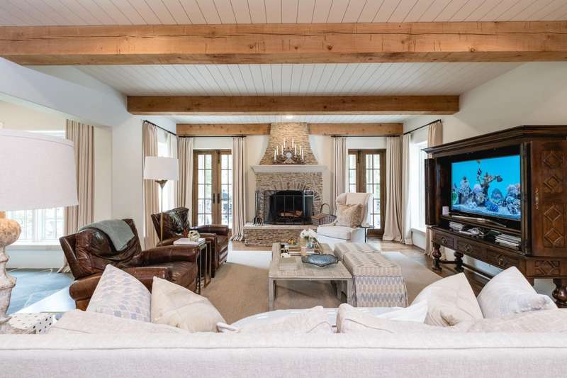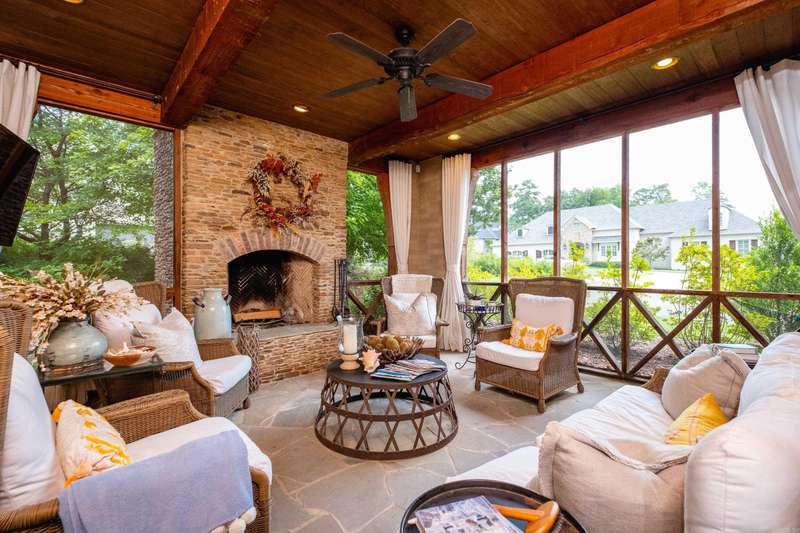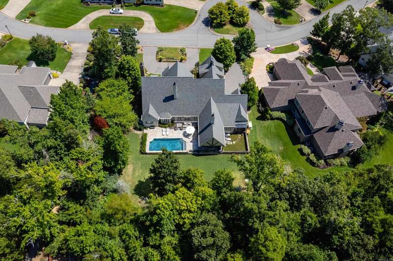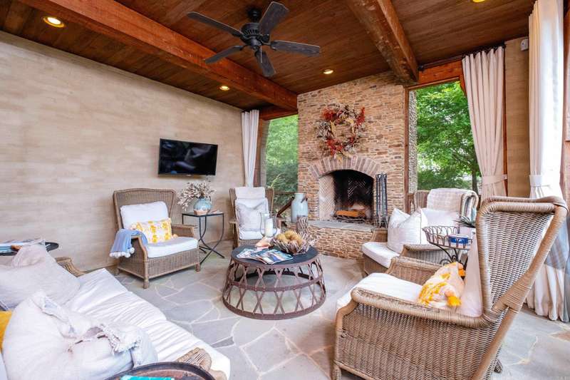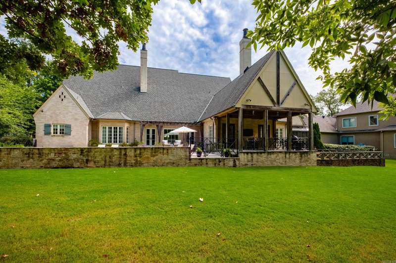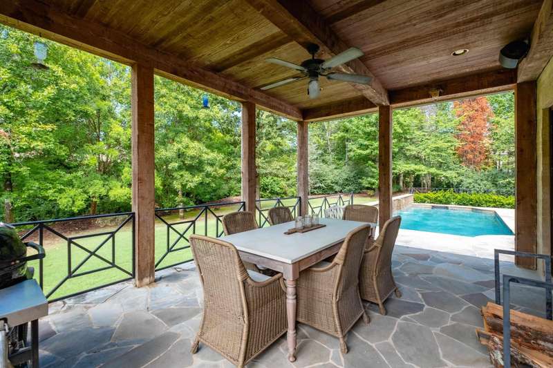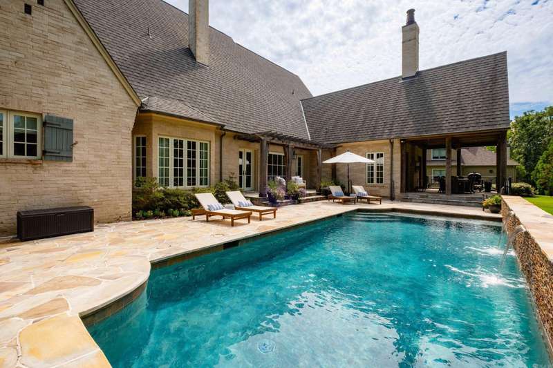 Stunning custom built estate home offering timeless design and modern comfort thru out. Featuring a rock and brick exterior, this residence is rich in character with natural stone and site finished hardwood floors, wood beamed ceilings, and warm, inviting spaces. The great room impresses with a soaring wood vaulted ceiling, wood burning fireplace, and a wall of French doors overlooking the backyard oasis. Formal and informal living areas showcase refined design and functionality. The gourmet kitchen is a showstopper with gorgeous counter space, high end appliances, and a spacious layout open to the hearth room, perfect for everyday living and entertaining. Step onto the covered back deck and enjoy views of the pool with waterfall, stone patio, and lush landscaping. A cozy screened in front patio with a wood burning fireplace extends the outdoor living. The luxurious primary suite includes a spa like bath and huge closet while upstairs offers a media/game room, guest suite, two additional bedrooms, full bath, cedar closet, and a dedicated study/work space. Oversized garages, greenhouse, and green features add to the value while blending beauty and practicality. Much more! Come see.
