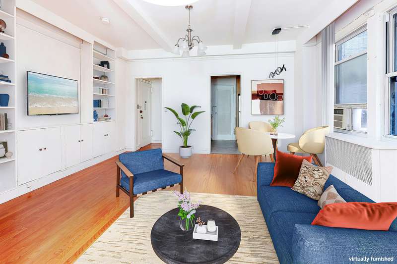Located in the Emery Roth designed prestigious Southgate complex, this over-sized studio features large living room windows, a windowed kitchen, a sleeping nook with Murphy bed, a walk-in closet, and another closet. Located on a quiet cul-de-sac in the exclusive  Beekman area, 400 E 52nd street is a full service, white glove, doorman building with a lovely private landscaped garden for tenants, laundry room, common storage room, and bike room.