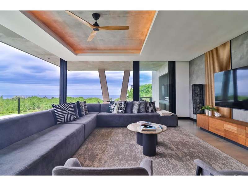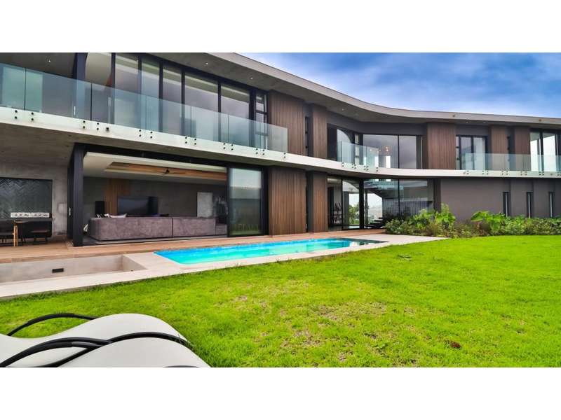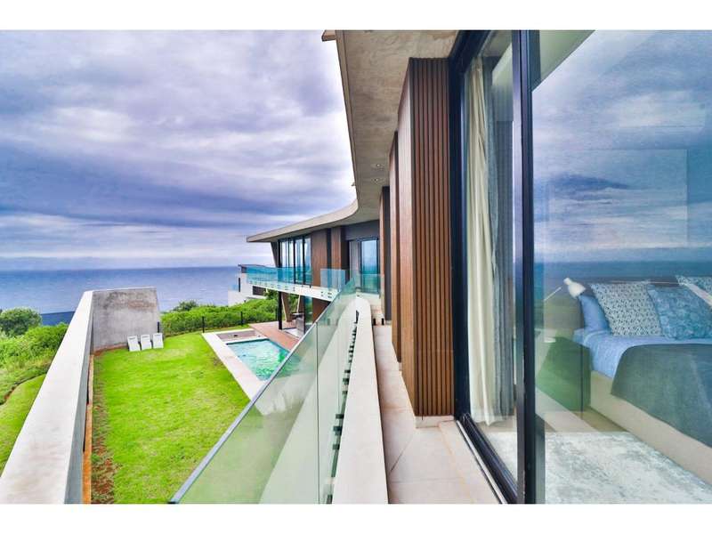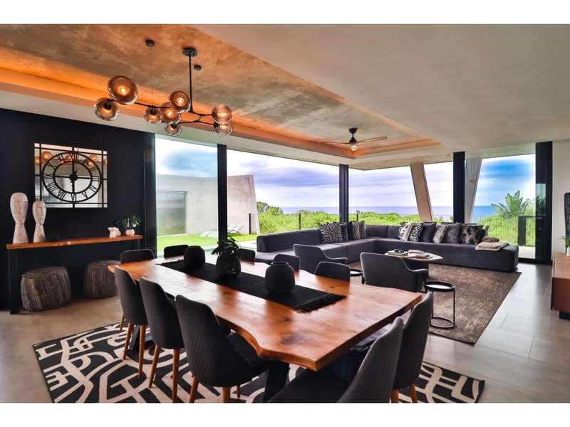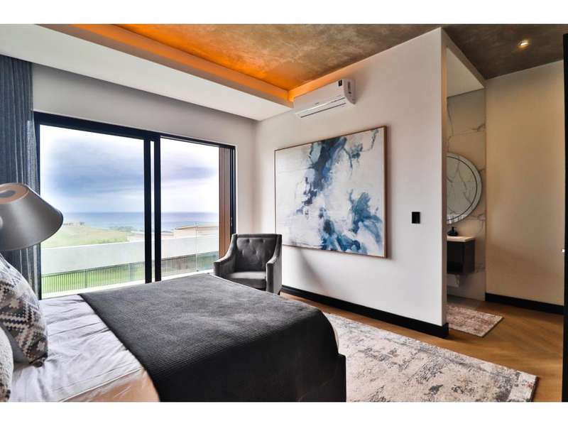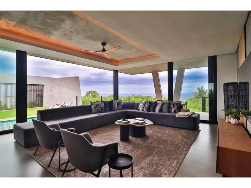 Perched in the prestigious Mont Clam Oceanside Estate in Sheffield Beach, this newly completed modern masterpiece offers the ultimate in luxury coastal living. Boasting the finest finishes throughout, the home captures breathtaking panoramic sea views from every angle. The striking architectural design seamlessly blends elegance and functionality, creating a haven of sophistication and comfort. The lower level is an entertainer?ÇÖs dream, featuring an open-plan kitchen and dining area that flow effortlessly into a spectacular living space. Expansive glass doors open to a lush garden, complete with a sparkling pool and fire pit, perfect for relaxation and social gatherings. A covered patio features a built in braai, and a triple garage adds convenience and security, completing this remarkable coastal home. Upstairs, four generously sized bedrooms await, each with its own en-suite bathroom, offering uninterrupted ocean vistas and access to private balconies. Natural light floods the interiors, enhancing through cleverly angled walls, a great sense of space and tranquility. Thoughtfully designed for modern living, the home ensures every detail is meticulously crafted to the highest standards. Full access to all Zululami and Seaton facilities, including private beach access, beach club, sports pavilions and more