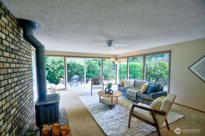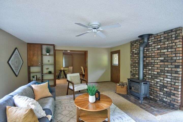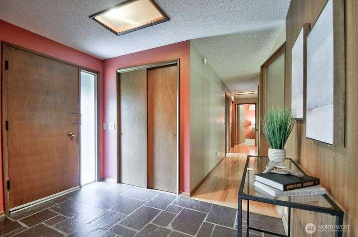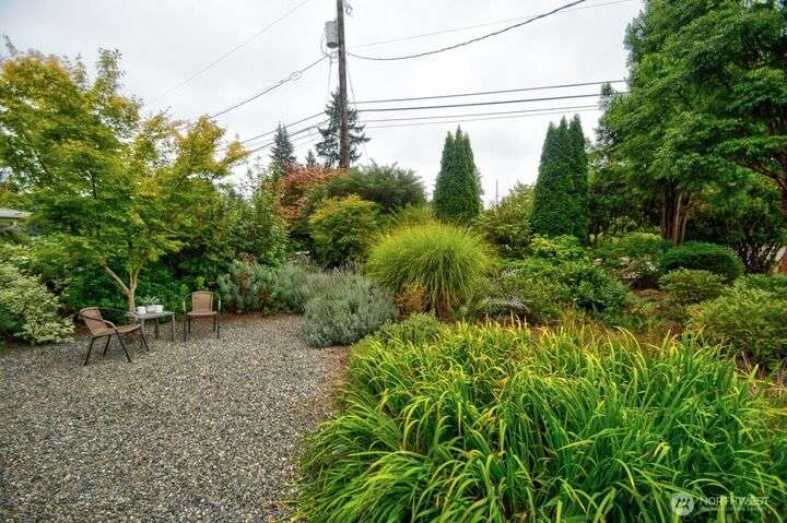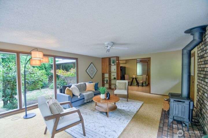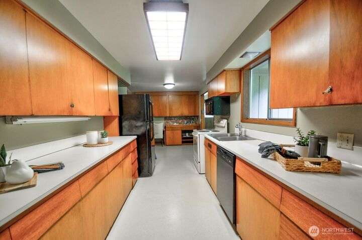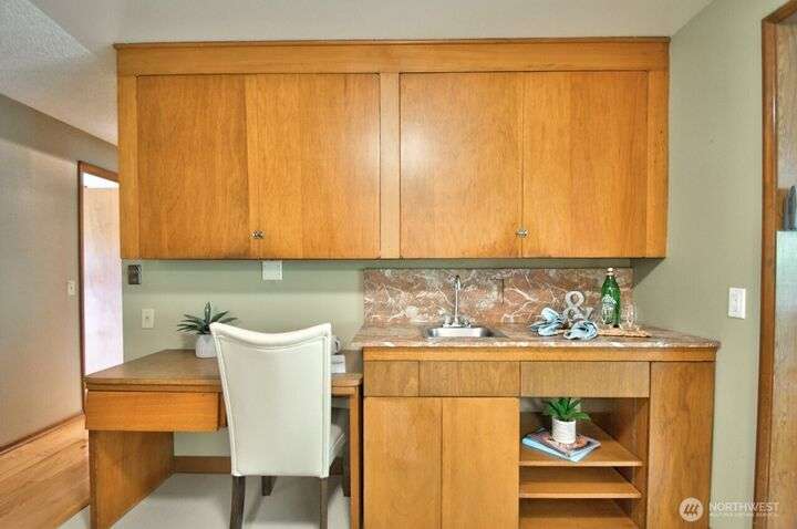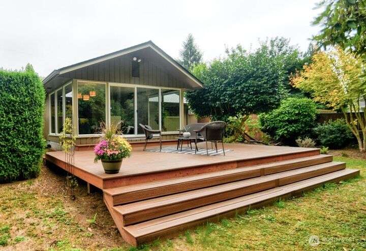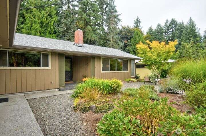Classic style of this 1950's neighborhood meets thoughtful updates! Enter to mid-century slate, paneling, stone work - original cabinetry, modern open floor plan. Living room features the warmth of a fireplace and views to the front gardens. True dining room space adjoins the kitchen with its generous counter space and well-honed cabinets from 1957. Built in desk & wet bar too! Primary suite w/updated bathroom, refreshed hall bath that honors the era + two more bedrooms complete the picture. Peaceful yard with large new deck - backing to green space for bird life and privacy, creating a gorgeous backdrop to outdoor entertaining and views from the sun room. So close to Oly schools & quick trip to the Capital, Downtown & amenities.