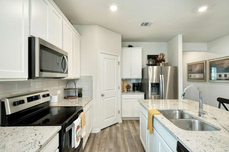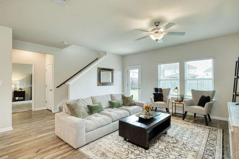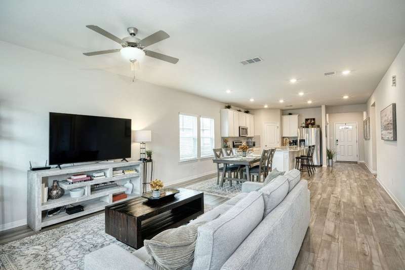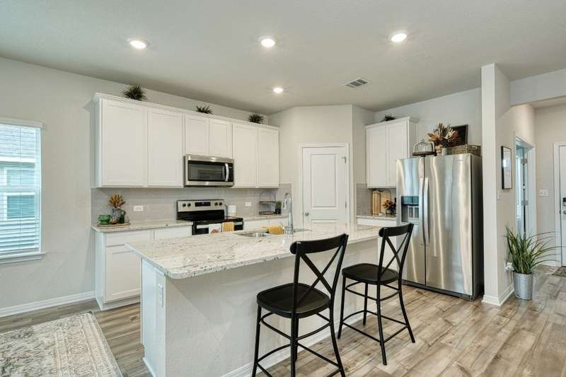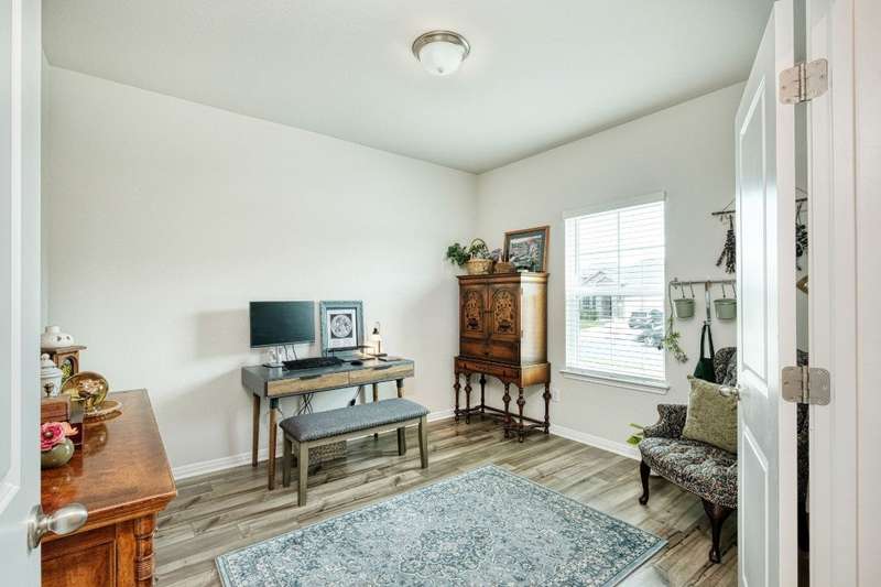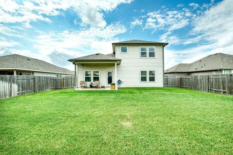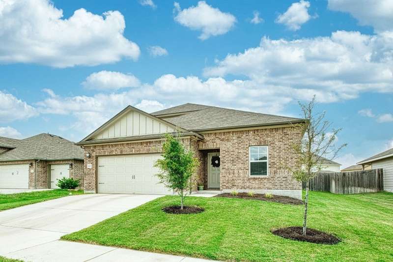 This charming, like-new two-story home boasts 3 spacious bedrooms, 2.5 bathrooms, and luxury finishes throughout. The open-concept main floor features luxury laminate flooring, a modern kitchen with a large island and white cabinets, perfect for entertaining. Enjoy the comfort of the primary bedroom located downstairs, which includes a large walk in shower and dual vanities in the primary bathroom. The front study offers the perfect space for a home office. Step outside to relax on the covered back patio, ideal for outdoor gatherings. With a great layout and ample living space, this home offers both style and function in a desirable Hutto location. Neighborhood amenities include kids splash pad, playground, & sport court. Near major employers and main roadways.