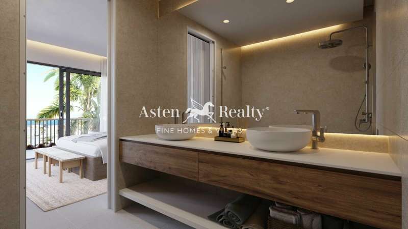 The upper floor houses two double bedrooms, each with its own en-suite bathroom and access to private terraces with planters, offering intimate outdoor spaces for relaxation.