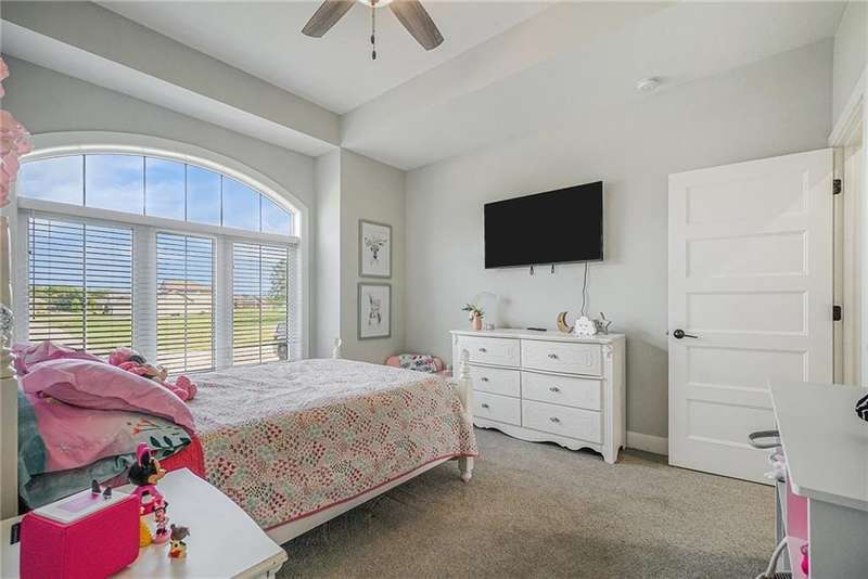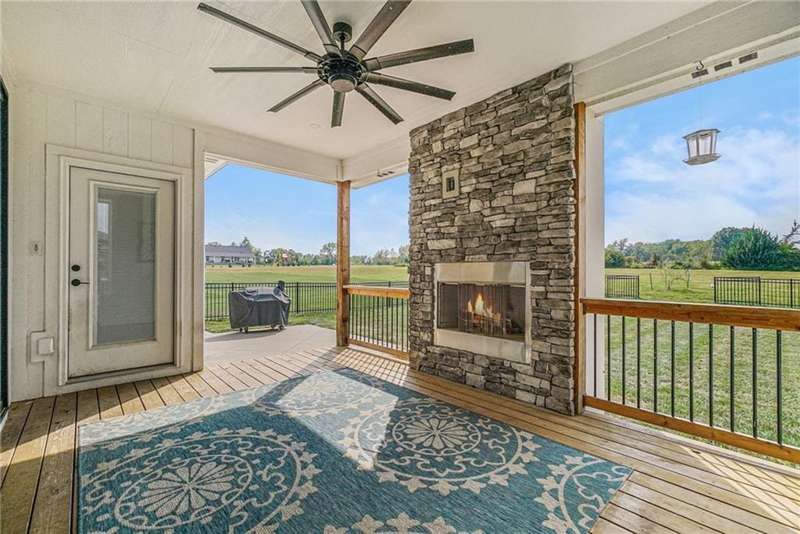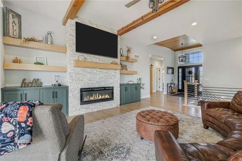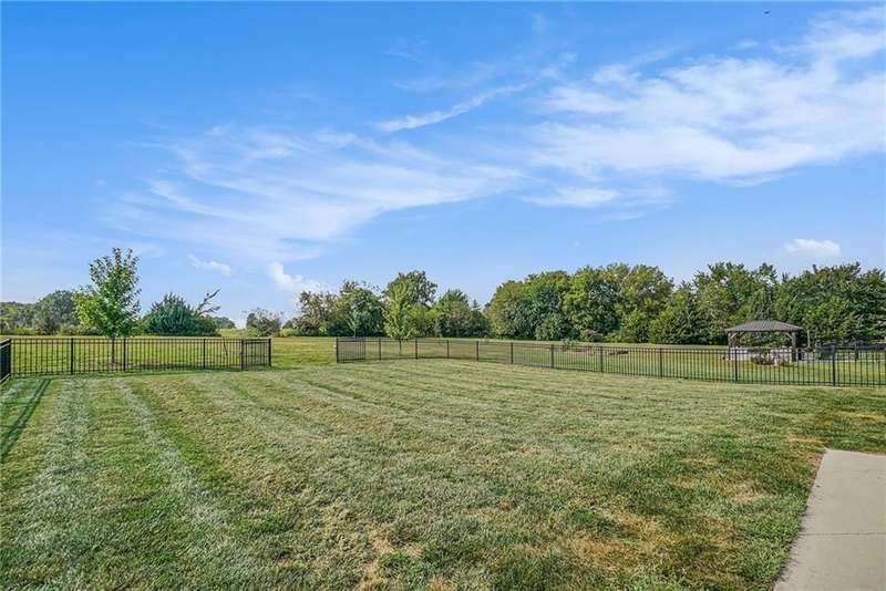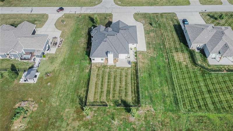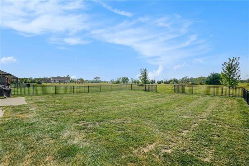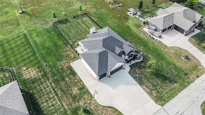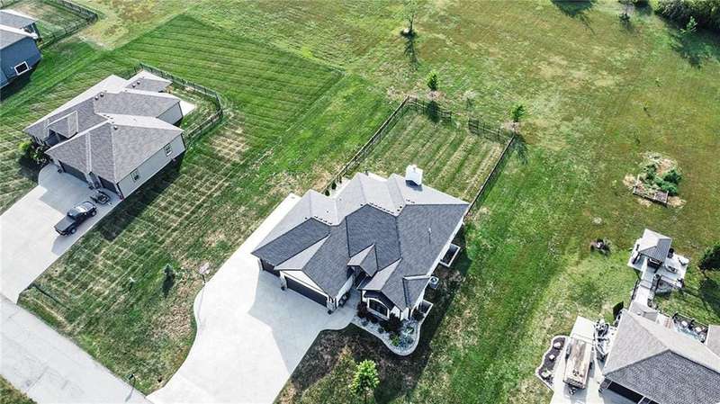 Beautiful 5-bedroom, 4.5-bath reverse 1.5-story home in the popular Shadow Glen of Peculiar. Sitting on 1 acre & backing to open farmland, this tastefully modern home, framed in 2x6 construction, features a fenced portion perfect for kids, pets, or a pool. The oversized 3-car garage with high ceilings includes a tandem bay for storage, a workshop, or even a golf simulator, plus a 40+ ft pad with a 50-amp connection for an RV or trailer.Inside, light, modern tones leading to a spacious open living, kitchen, & dining area. Living room showcases a stacked stone fireplace with custom shelving & cabinets. Chefs kitchen boasts a grand island, custom cabinetry, gas cooktop, double ovens, farm sink, & a large pantry with beverage fridge. Step outside to a covered deck with a stone fireplace & an expanded patio that connects to the garage & driveway.Main-level primary suite offers a spa-like bath with double vanity, tiled walk-in shower, & laundry access through the walk-in closet. Laundry room equipped with sink, cabinets & counters. A secondary bedroom with private ensuite bath & a convenient half bath complete the main level.Downstairs, enjoy a versatile flex space with a bar and space for a fridge, opening to a large media/theater room. Three generously sized bedrooms with walk-in closets & two full baths complete the lower level.Shadow Glen continues to be a perfect place to escape the city or raise a family; providing a great blend of residents. Large lots allow for privacy but still holds the feeling of community. Quick access to I49/71HWY & desirable Ray-Pec Schools.