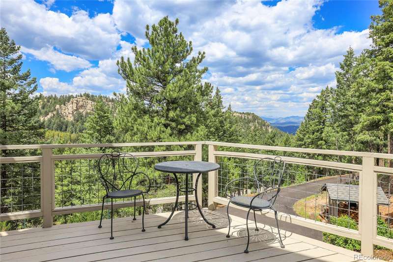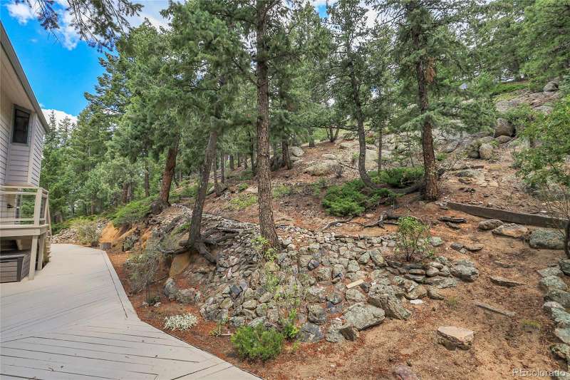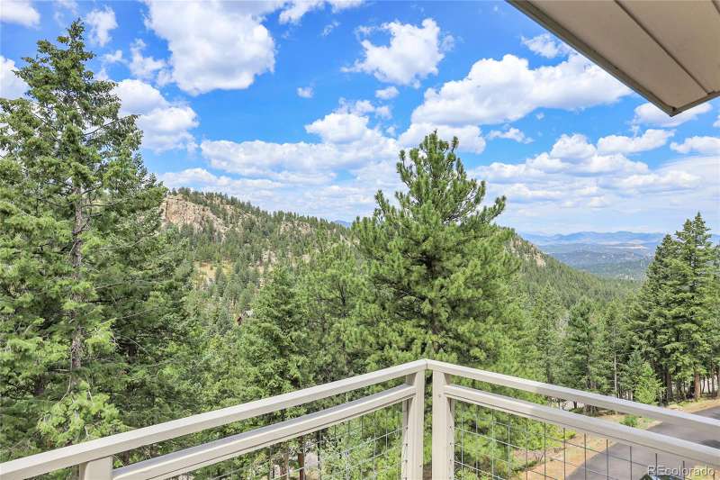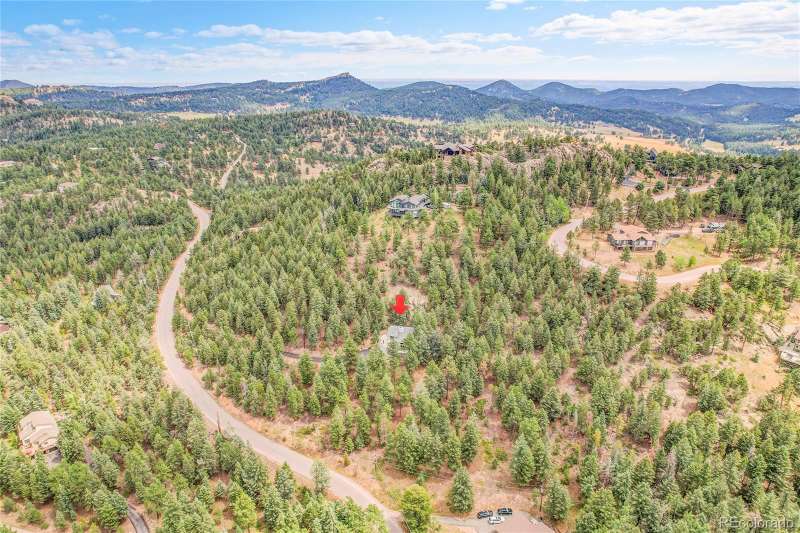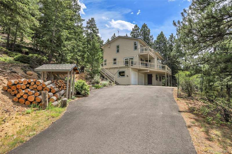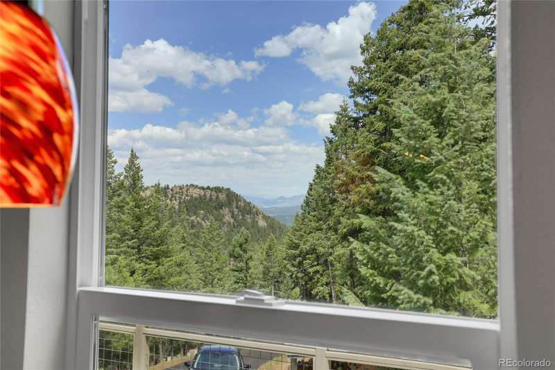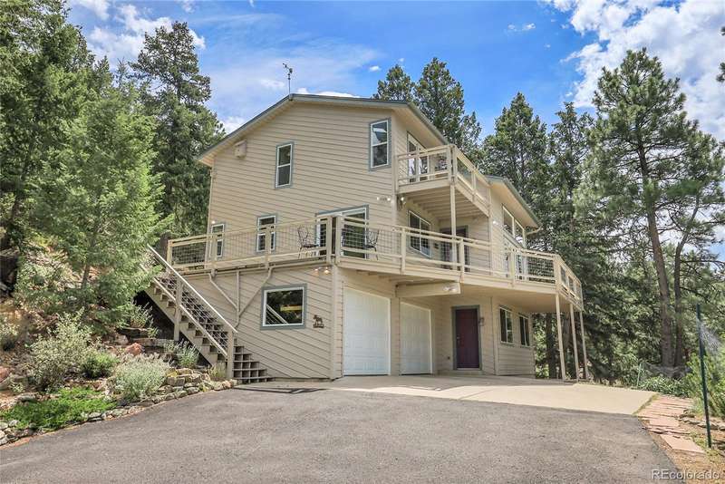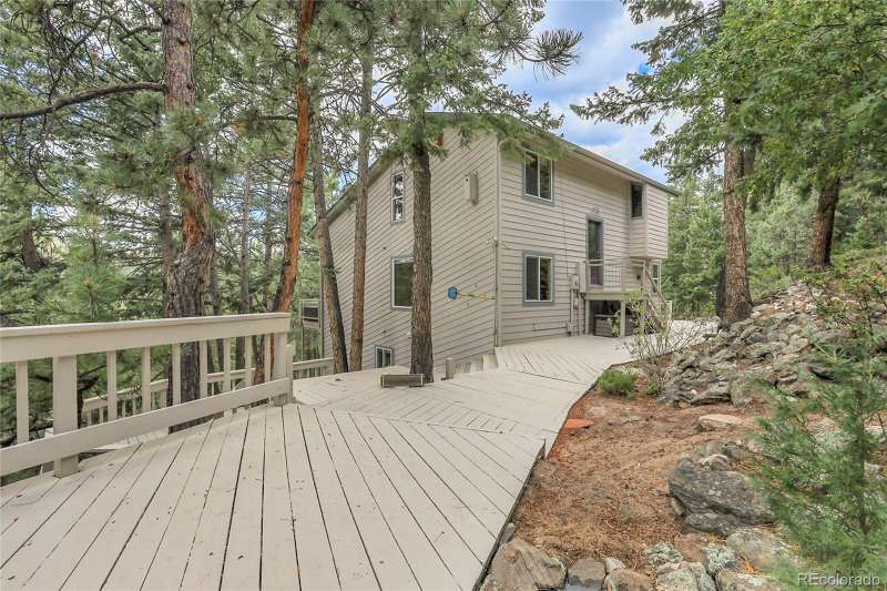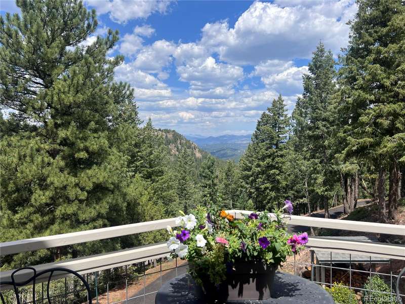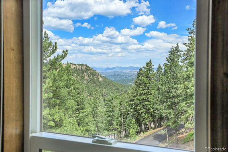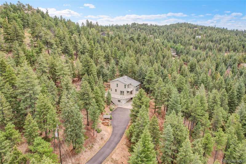 This is where privacy, natural beauty, and ease of living come together in a well-cared-for mountain retreat. Nestled on almost 4 acres with snowcapped views, this thoughtfully updated home offers a special opportunity to enjoy the best of Colorado living-quiet surroundings, big skies, & frequent wildlife all just minutes to neighborhood amenities. A paved driveway & easy year-round access take you to this lovely home. Step onto the expansive deck - whether you want sun or shade, you will enjoy beautiful outdoor living with complete privacy & lovely views. Inside find hardwood flooring & a gorgeous remodeled kitchen complete with gas stove, pantry, & cherry cabinetry with the latest features. The lofted living room has a stone fireplace, new paint, plentiful windows to take in the sunshine, & exteriors doors to the deck. In the winter, radiant in-floor natural gas heat keeps the home toasty. The primary suite has new carpet, walk-in closet & its own private coffee deck to greet the day. On the lower walk-out level, find a cozy family room w/ private entrance, which could make a 4th bedroom or mother-in-law suite. The oversized garage features a large workbench & plentiful storage. Newer roof, smart thermostats & high speed internet make living here a breeze. Natures creatures abound here, as this almost 4 acre property has been lovingly cared for with virtually no noxious weeds, no chemicals used, and water features that attract the deer, fox and elk. Walk the trail to above the home for even bigger views & great sunsets! This delightful neighborhood includes amenities such as a 20+ acre common area, fishing pond, tennis/pickleball courts, play area, volleyball court, horse stable, & rentable barn for events. Lots of community gatherings too. It's just 9 minutes to Hwy 285 for a quick trip to Denver, and just 15 minutes to downtown Evergreen and close proximity to a myriad of trails to hike and bike. Video, 3D walk thru, & more photos at: www.6684OlympusDrive.com