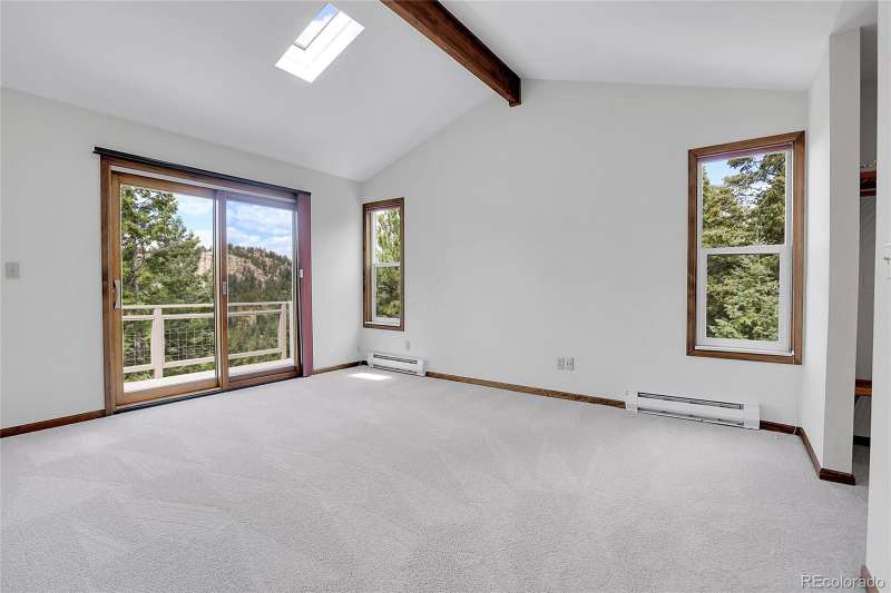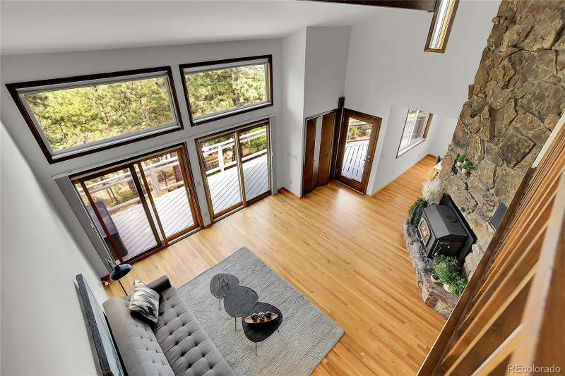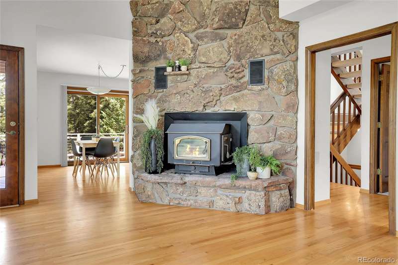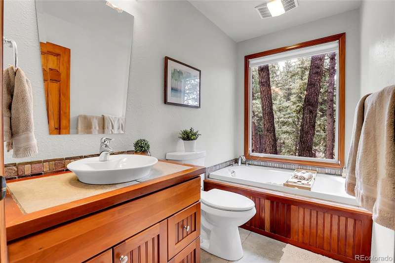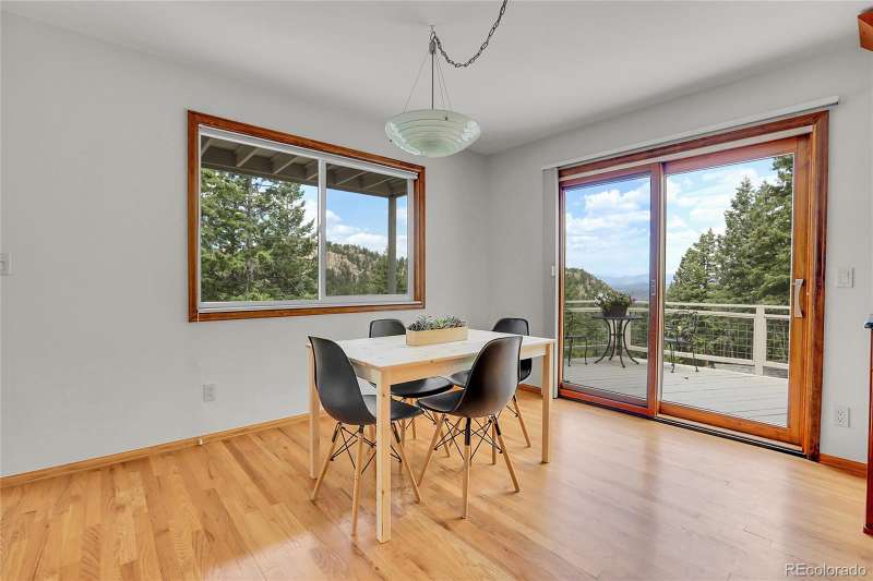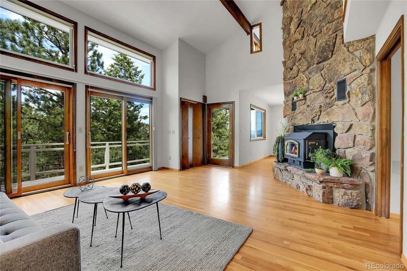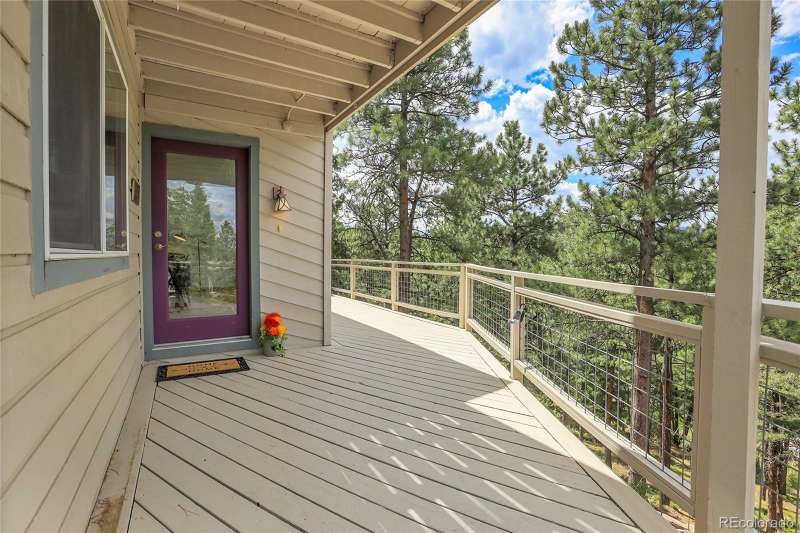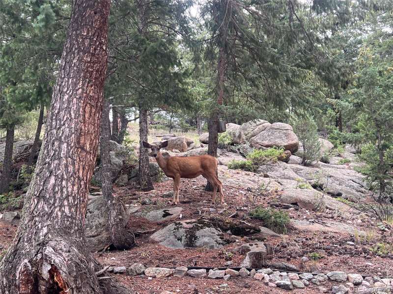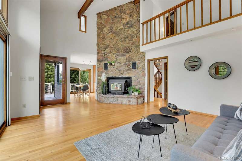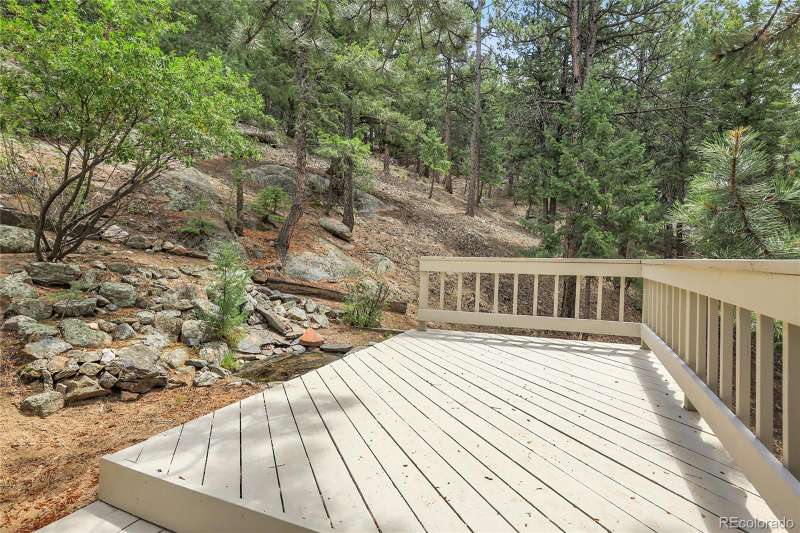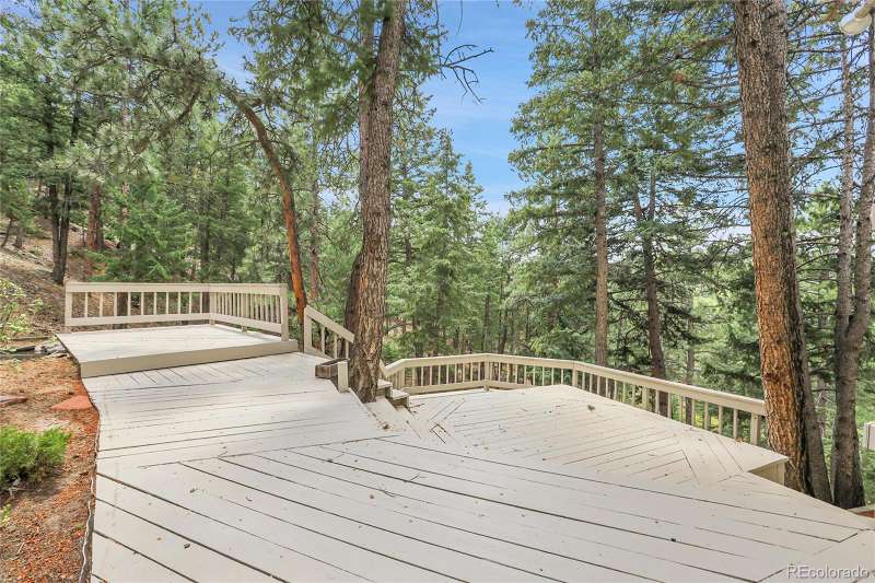 This is where privacy, natural beauty, and ease of living come together in a well-cared-for mountain retreat. Nestled on almost 4 acres with snowcapped views, this thoughtfully updated home offers a special opportunity to enjoy the best of Colorado living-quiet surroundings, big skies, & frequent wildlife all just minutes to neighborhood amenities. A paved driveway & easy year-round access take you to this lovely home. Step onto the expansive deck - whether you want sun or shade, you will enjoy beautiful outdoor living with complete privacy & lovely views. Inside find hardwood flooring & a gorgeous remodeled kitchen complete with gas stove, pantry, & cherry cabinetry with the latest features. The lofted living room has a stone fireplace, new paint, plentiful windows to take in the sunshine, & exteriors doors to the deck. In the winter, radiant in-floor natural gas heat keeps the home toasty. The primary suite has new carpet, walk-in closet & its own private coffee deck to greet the day. On the lower walk-out level, find a cozy family room w/ private entrance, which could make a 4th bedroom or mother-in-law suite. The oversized garage features a large workbench & plentiful storage. Newer roof, smart thermostats & high speed internet make living here a breeze. Natures creatures abound here, as this almost 4 acre property has been lovingly cared for with virtually no noxious weeds, no chemicals used, and water features that attract the deer, fox and elk. Walk the trail to above the home for even bigger views & great sunsets! This delightful neighborhood includes amenities such as a 20+ acre common area, fishing pond, tennis/pickleball courts, play area, volleyball court, horse stable, & rentable barn for events. Lots of community gatherings too. It's just 9 minutes to Hwy 285 for a quick trip to Denver, and just 15 minutes to downtown Evergreen and close proximity to a myriad of trails to hike and bike. Video, 3D walk thru, & more photos at: www.6684OlympusDrive.com