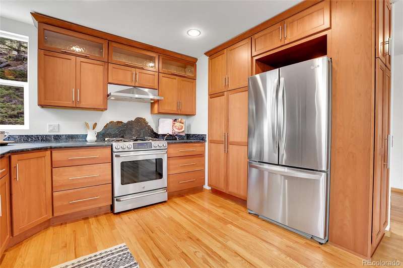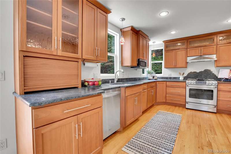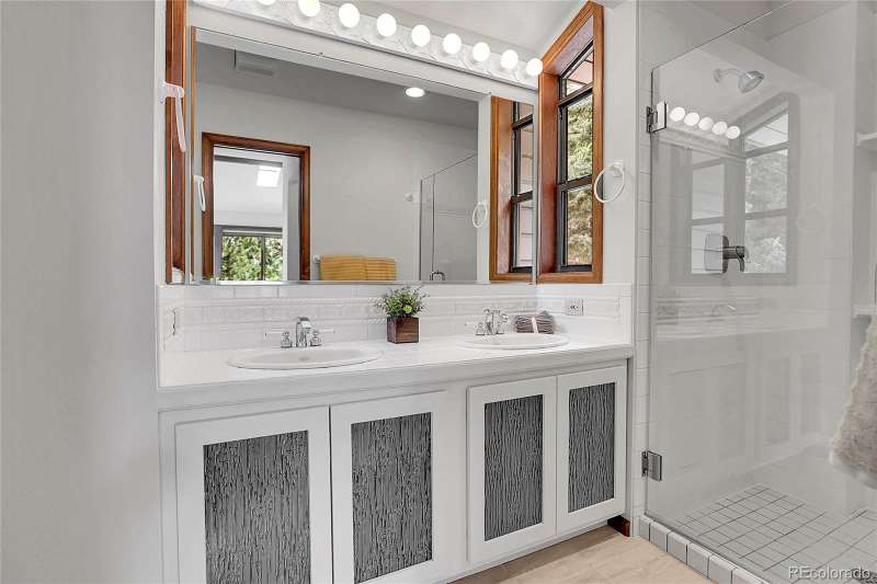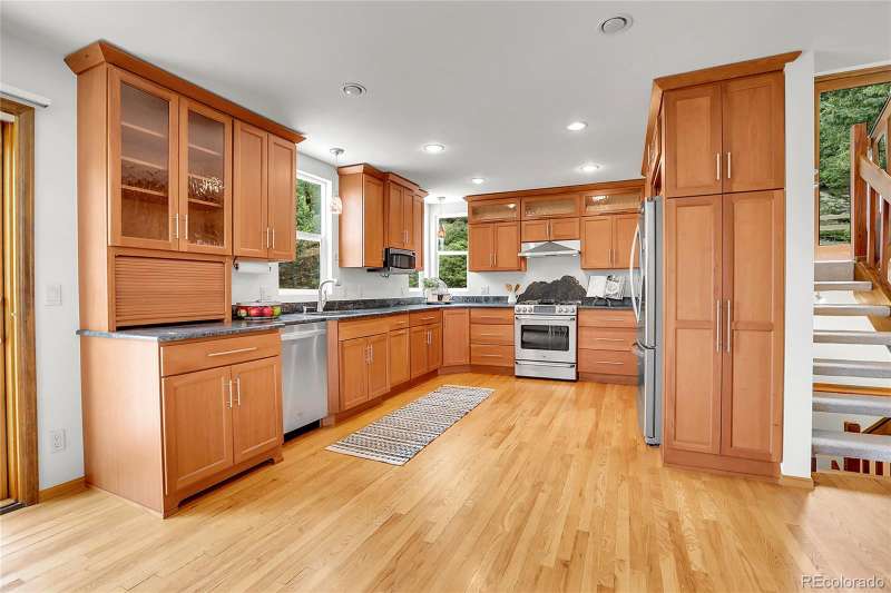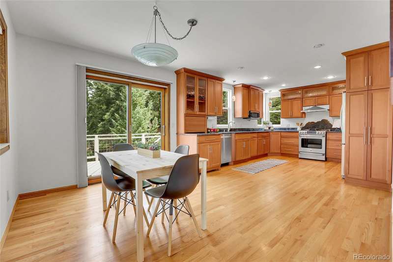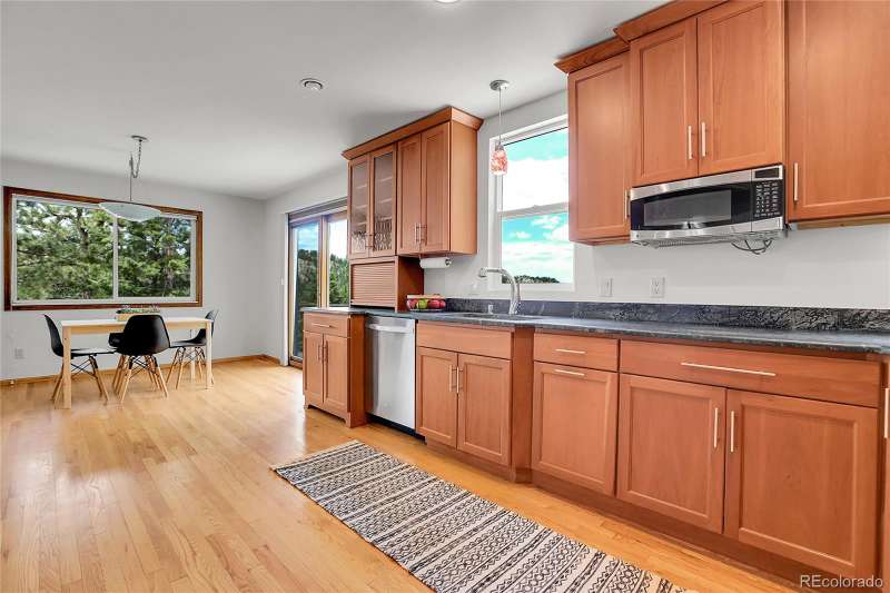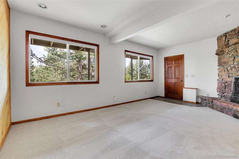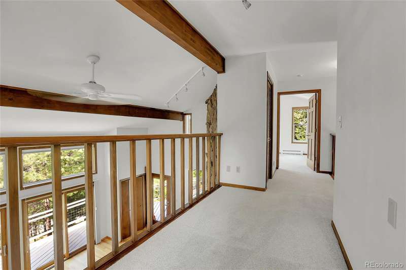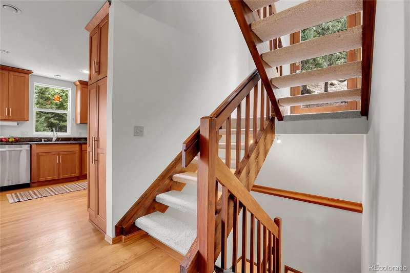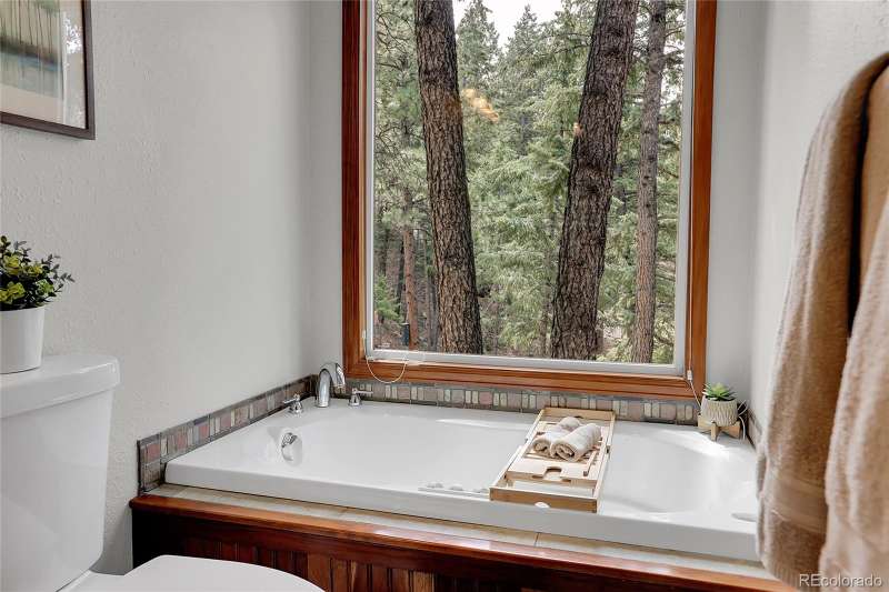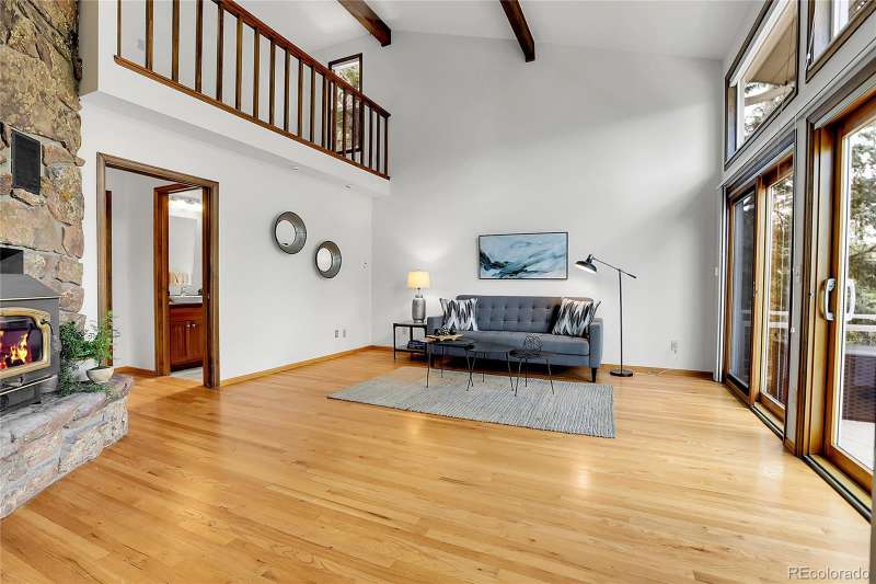 This is where privacy, natural beauty, and ease of living come together in a well-cared-for mountain retreat. Nestled on almost 4 acres with snowcapped views, this thoughtfully updated home offers a special opportunity to enjoy the best of Colorado living-quiet surroundings, big skies, & frequent wildlife all just minutes to neighborhood amenities. A paved driveway & easy year-round access take you to this lovely home. Step onto the expansive deck - whether you want sun or shade, you will enjoy beautiful outdoor living with complete privacy & lovely views. Inside find hardwood flooring & a gorgeous remodeled kitchen complete with gas stove, pantry, & cherry cabinetry with the latest features. The lofted living room has a stone fireplace, new paint, plentiful windows to take in the sunshine, & exteriors doors to the deck. In the winter, radiant in-floor natural gas heat keeps the home toasty. The primary suite has new carpet, walk-in closet & its own private coffee deck to greet the day. On the lower walk-out level, find a cozy family room w/ private entrance, which could make a 4th bedroom or mother-in-law suite. The oversized garage features a large workbench & plentiful storage. Newer roof, smart thermostats & high speed internet make living here a breeze. Natures creatures abound here, as this almost 4 acre property has been lovingly cared for with virtually no noxious weeds, no chemicals used, and water features that attract the deer, fox and elk. Walk the trail to above the home for even bigger views & great sunsets! This delightful neighborhood includes amenities such as a 20+ acre common area, fishing pond, tennis/pickleball courts, play area, volleyball court, horse stable, & rentable barn for events. Lots of community gatherings too. It's just 9 minutes to Hwy 285 for a quick trip to Denver, and just 15 minutes to downtown Evergreen and close proximity to a myriad of trails to hike and bike. Video, 3D walk thru, & more photos at: www.6684OlympusDrive.com