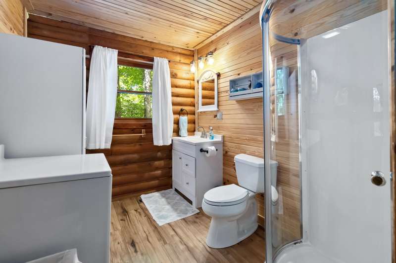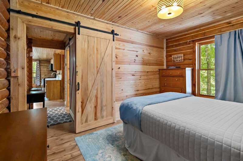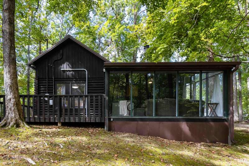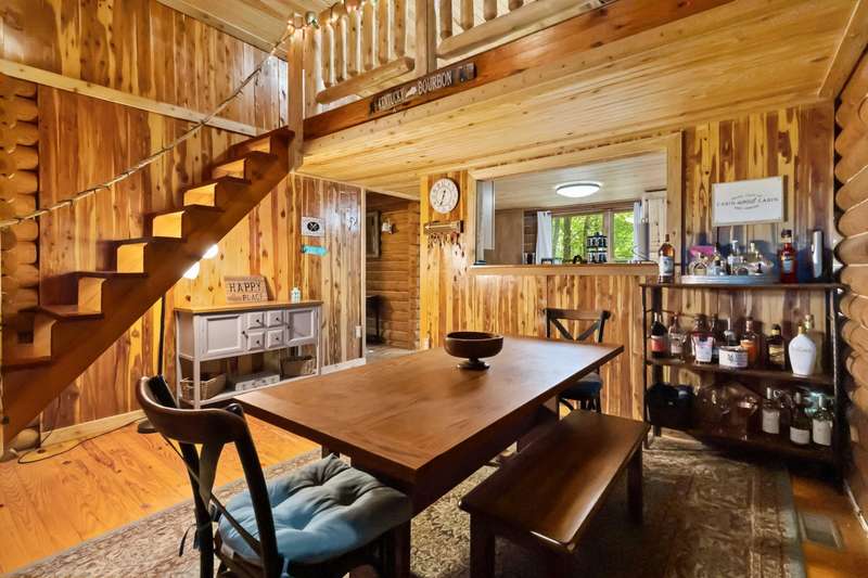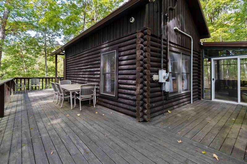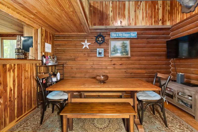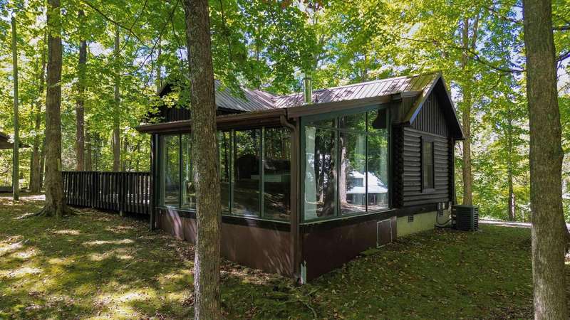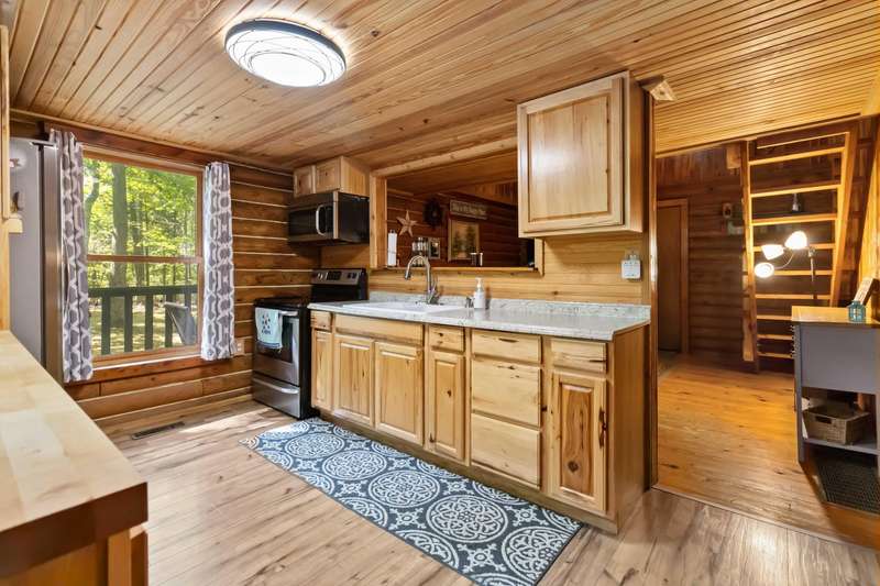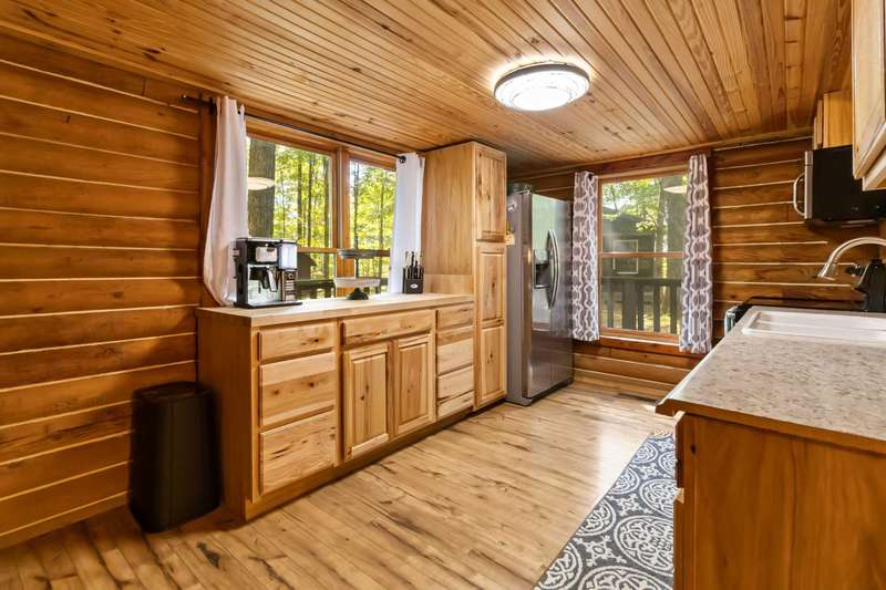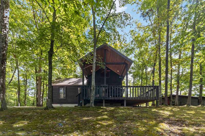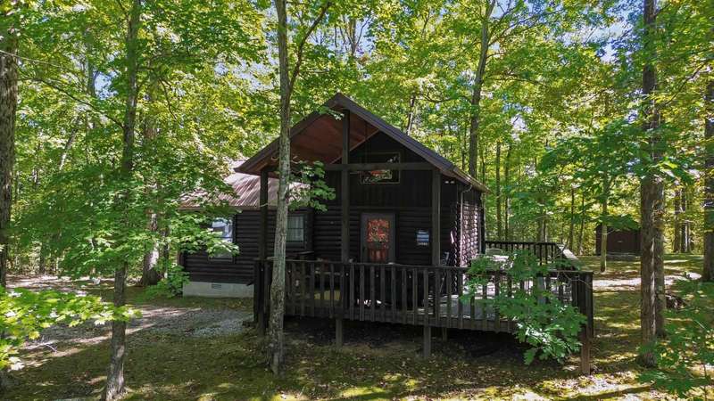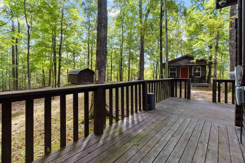Nestled on nearly an acre of wooded land, this charming log cabin offers the perfect blend of rustic character and modern updates! Sitting on two lots totaling approx. 0.99 acre, the cabin is nicely perched above the road and tucked into the trees for privacy. Inside you'll find 1 designated bedroom plus a loft currently used as an additional sleeping area with 2 beds-altogether sleeping 5-6 people. The cabin is equipped with central heat and air, and the current owners have thoughtfully updated the kitchen and bathroom, refreshed the walls and ceilings with tongue-and-groove, upgraded the service panel, added spray foam insulation under the sunroom, gutters, and built a welcoming covered deck and porch. In 2022, they also constructed a 12x24 guest house that sleeps 6-7 with bunk beds (twin over fulls). The guest house is finished with tongue-and-groove walls and ceilings, LVP flooring, a Hardiboard exterior with metal roof, and a charming front porch. It includes a fridge, microwave, toaster oven, two TVs, and a dining table, all kept comfortable with a PTAC-style heating and cooling unit. While there is no water line to the guest house, it's the ideal setup for overflow guests, family, or friends. Best of all-this property is low maintenance with no grass to mow! Located just 2 miles to Wolf Creek Marina and close to multiple boat ramps on Lake Cumberland, you'll enjoy easy access to boating, fishing, and lake adventures. Whether you're looking for a private getaway, a short-term rental opportunity, or a unique lake-area retreat, this property has it all.